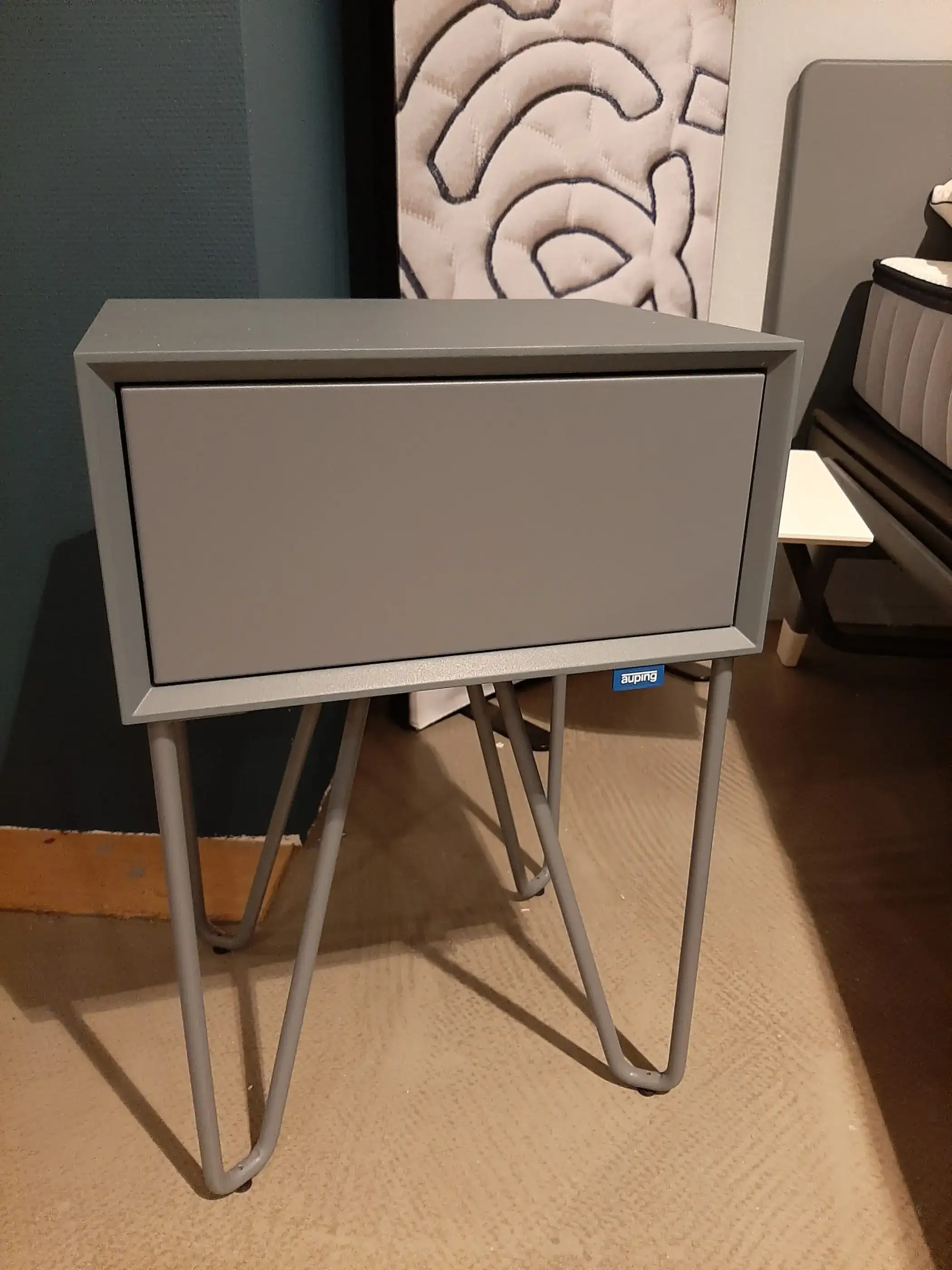 Ledikant Auping Original is uitgevoerd in de afmeting 180×210 en met onderstel cool blue, hoofdbord Straight laag, verhogingsset Pure White, 2x spiraalbodem 90×210 vlak, 2x Original bedtafeltje Pure White en 1x nachtkastje Pixel cool blue.