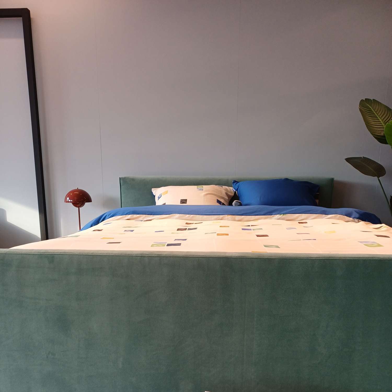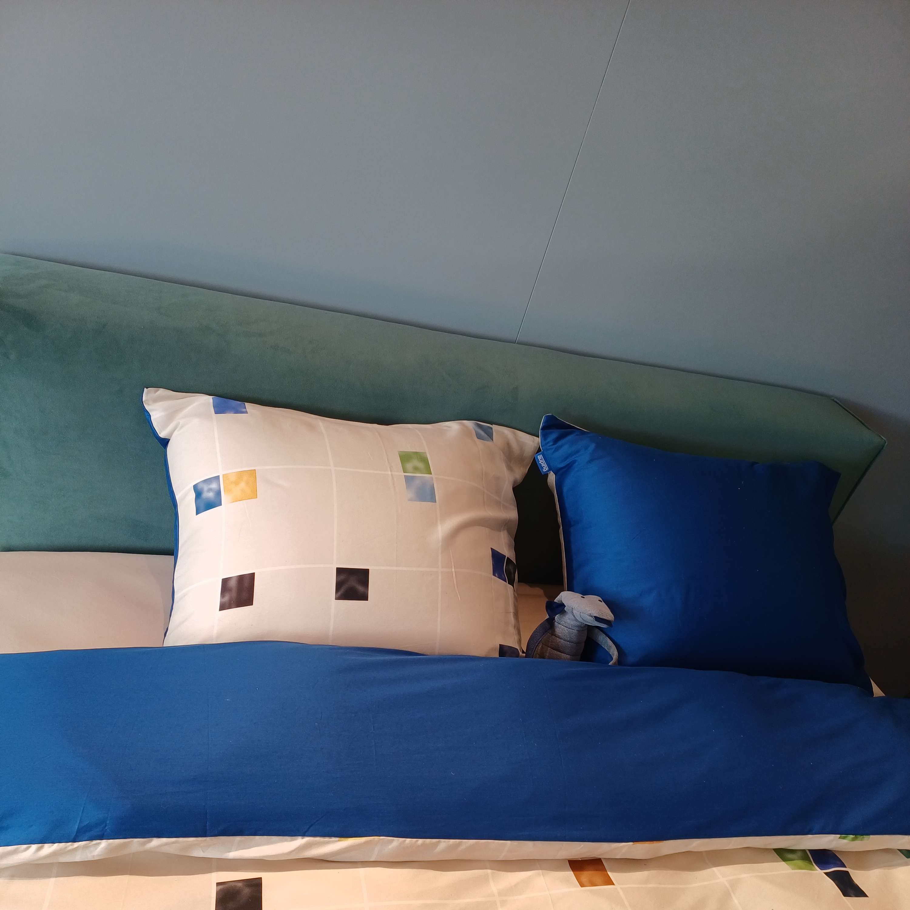 Het hoofdbord is robust-, gelijk aan de bedbreedte 180cm en 105cm hoog.