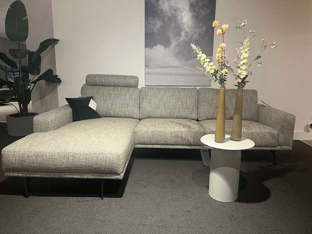 Hoekbank Stylo is 275 cm breed en de longchair links is 178 diep.