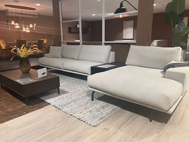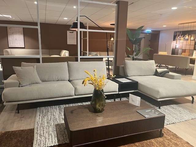 De hoekbank Matisse bestaat uit een 3 zitsbank arm links ,een tussenkast zwart eiken en dan een longchair van 125 cm. De totale breedte is 400cm en is bestofeerd in de stof New Harmony
