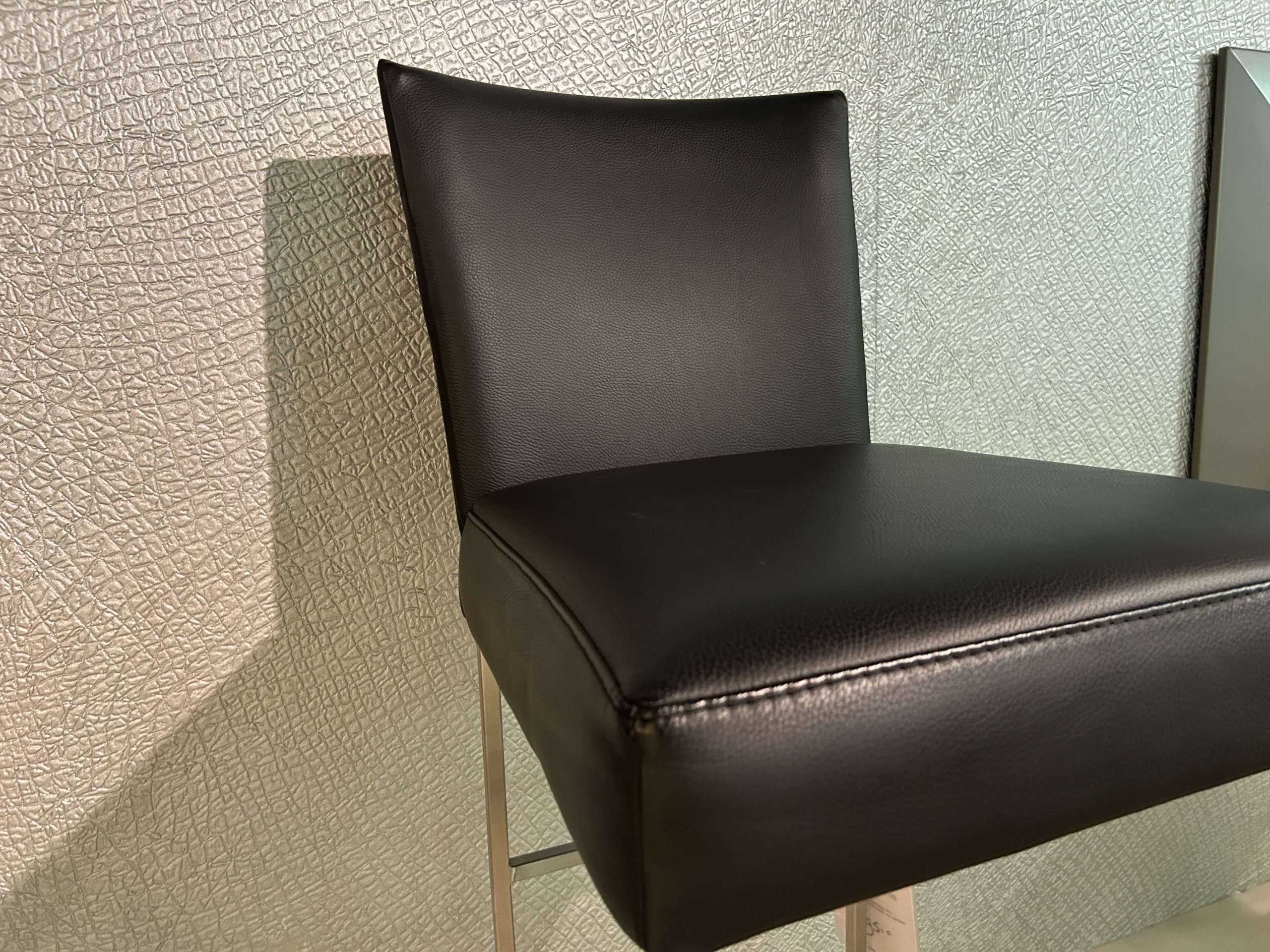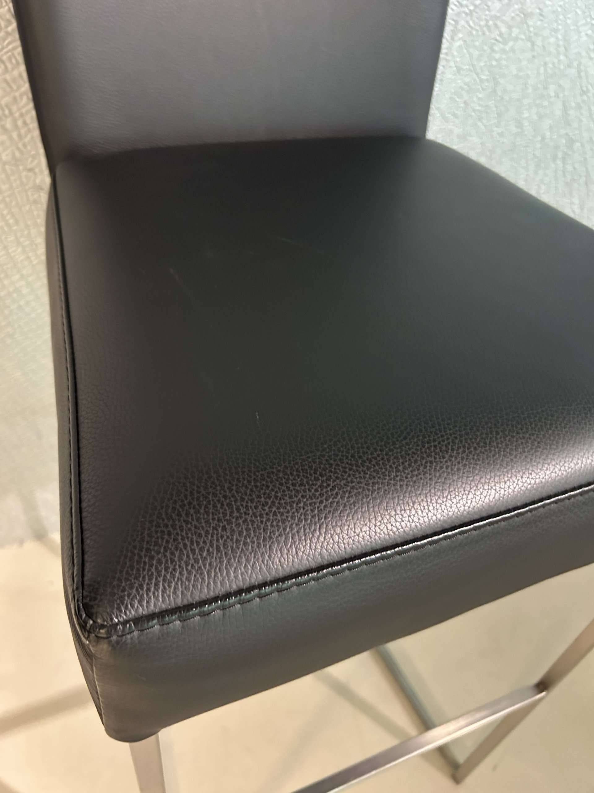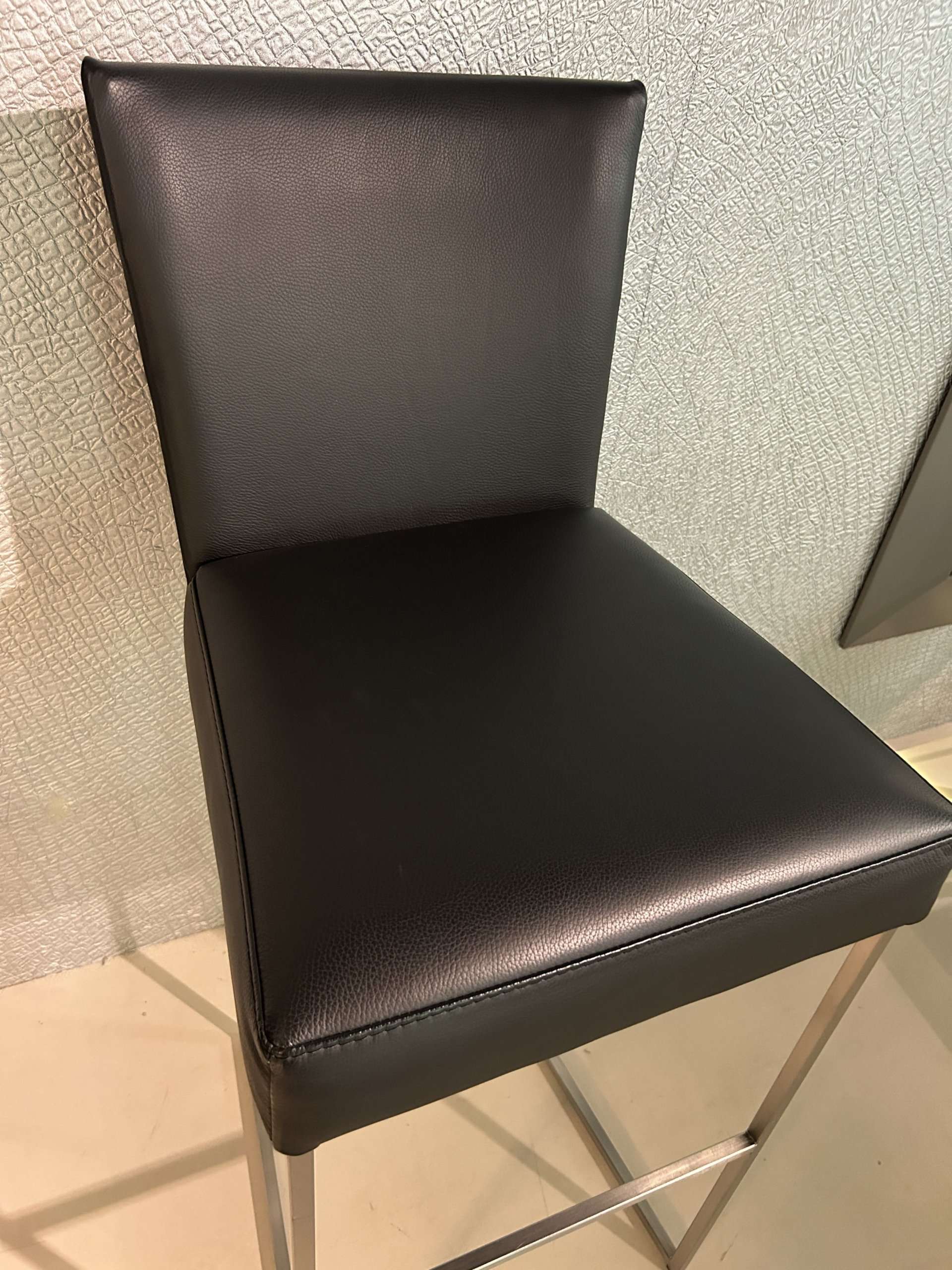 Uitgevoerd in luxe zwart leder (LD1000) en een stevig, modern RVS frame met een vierkant ontwerp, past deze barstoel perfect in een strakke keuken of baromgeving.