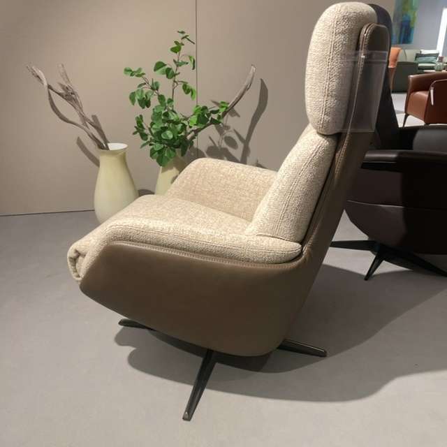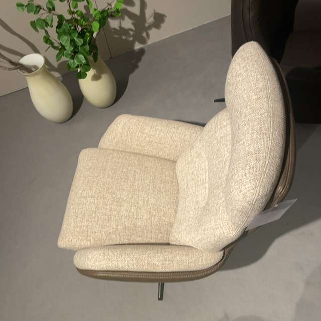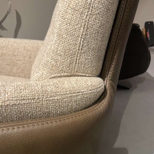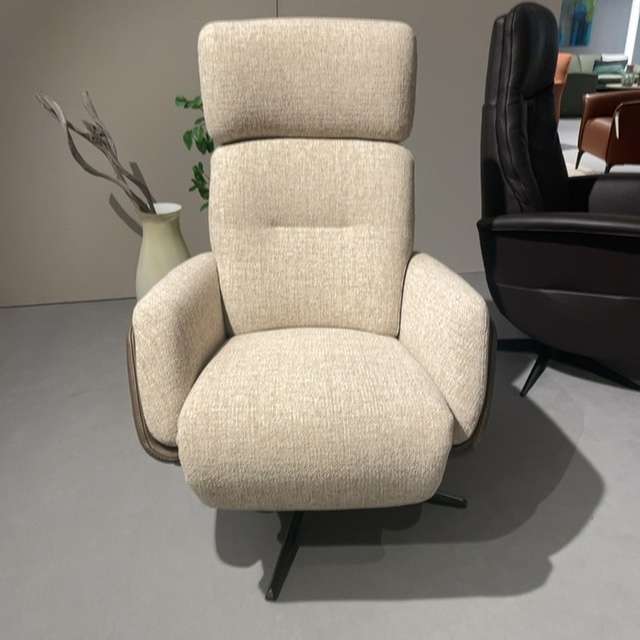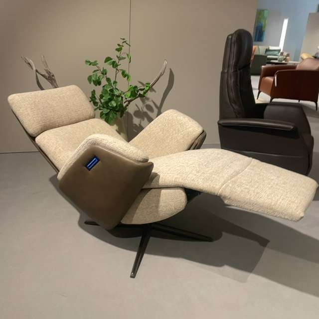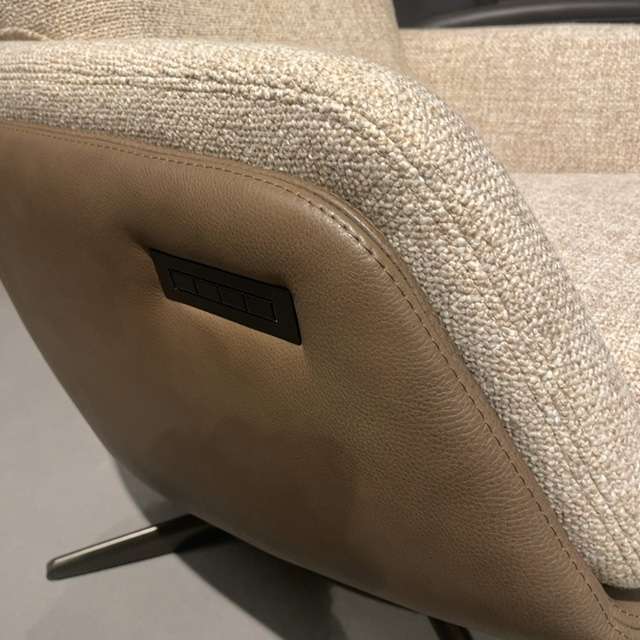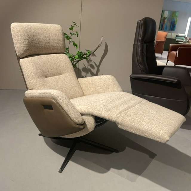 Fijne draairelaxfauteuil van De Toekomst, Twice TW-269N, maat L. Fauteuil is voorzien van electrice bediening op accu d.m.v. tiptoetsen. De fauteuil is voorzien van een duostoffering, buitenzijde leer Oasis 160, binnenzijde stof Taro 90, stervoet 72 Bronze.