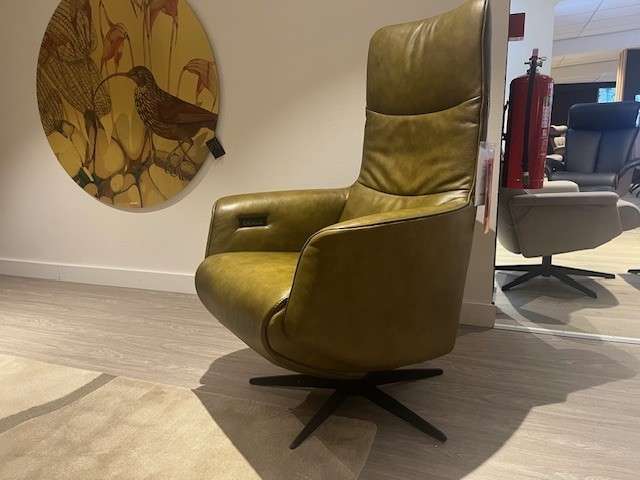 Deze relaxfauteuil is electrisch verstelbaar op accu en heeft de maat medium. De stoel is gestofeerd in leder Moreno Olive.