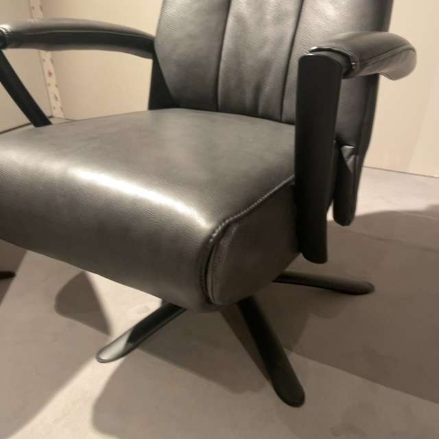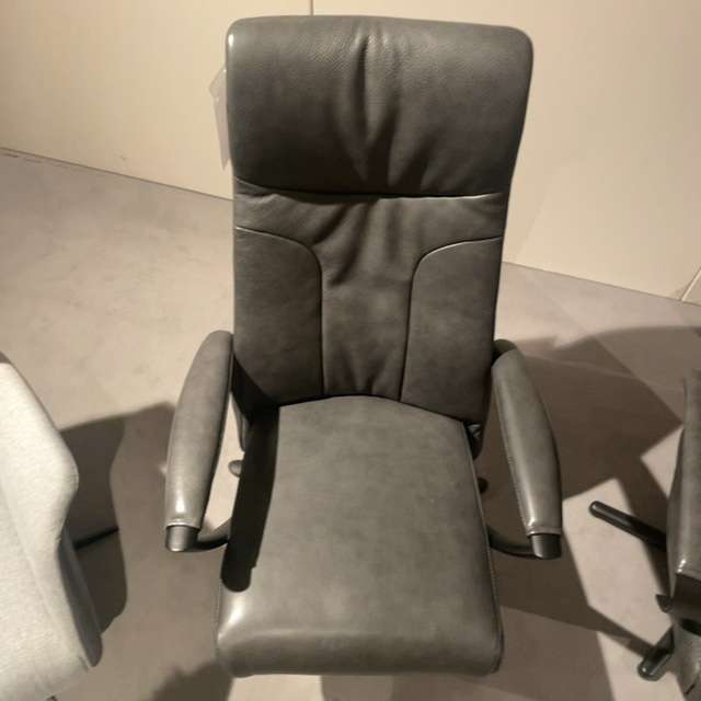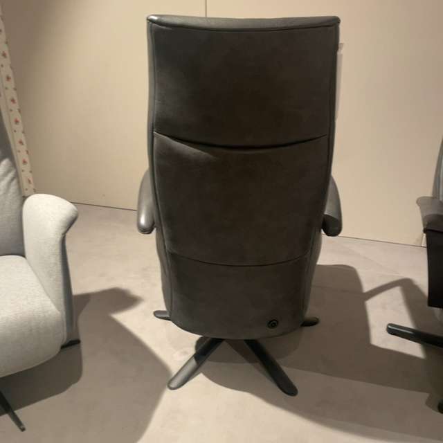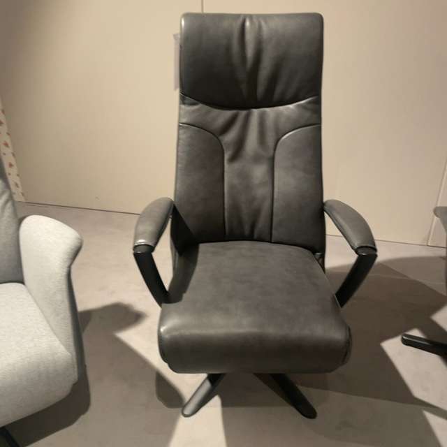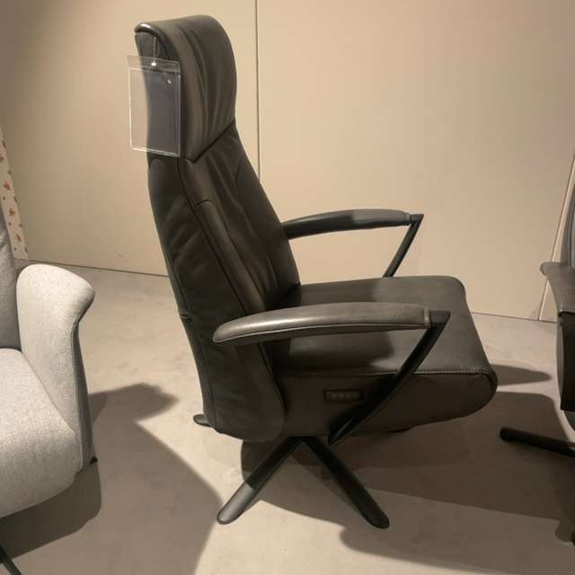 Fijne draairelaxfauteuil van De Toekomst, Twice TW-109N, maat XL. Fauteuil is voorzien van electrische bediening op accu d.m.v. tiptoetsen. De fauteuil is uitgevoerd in leer - Oasis 100, met stervoet 88 zwart.