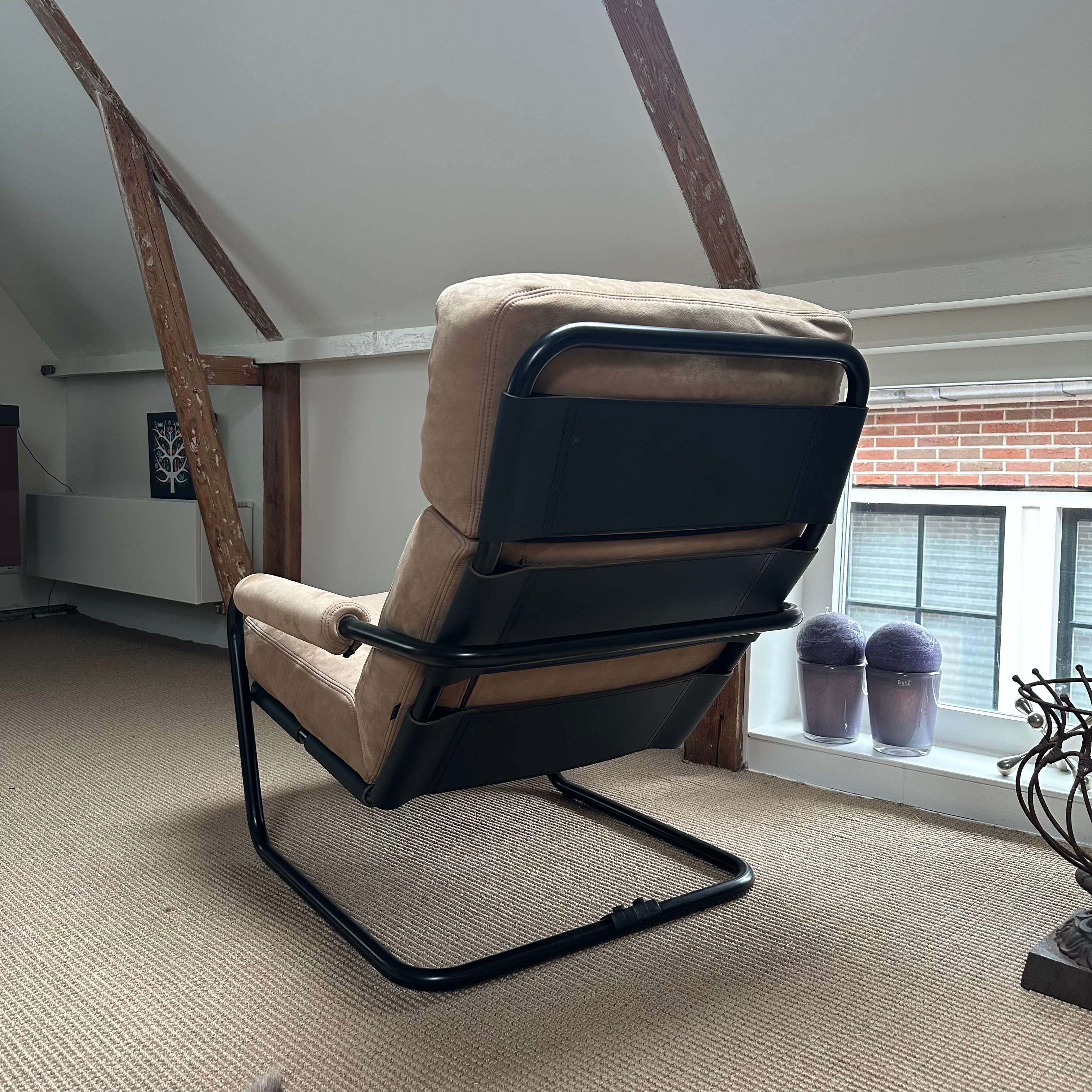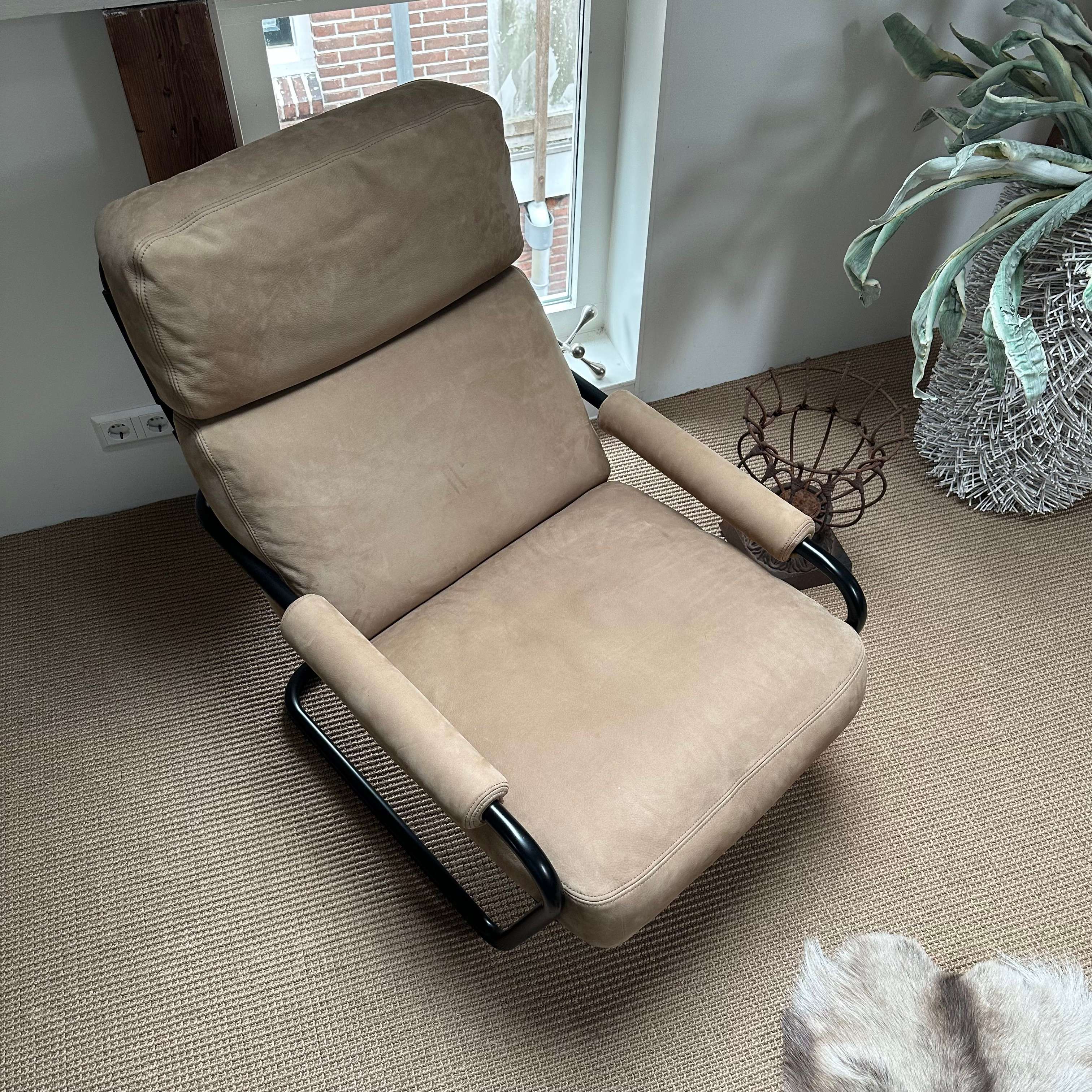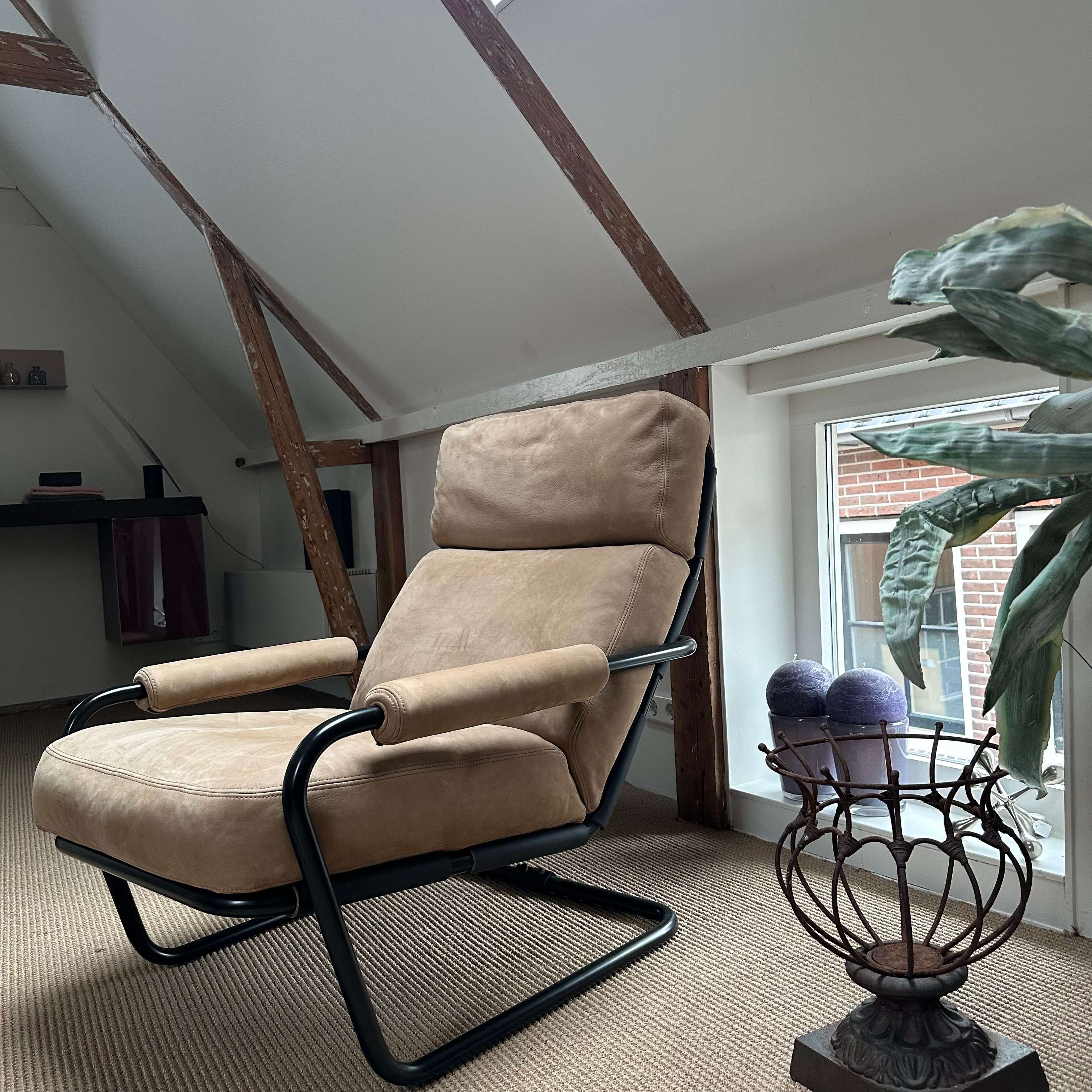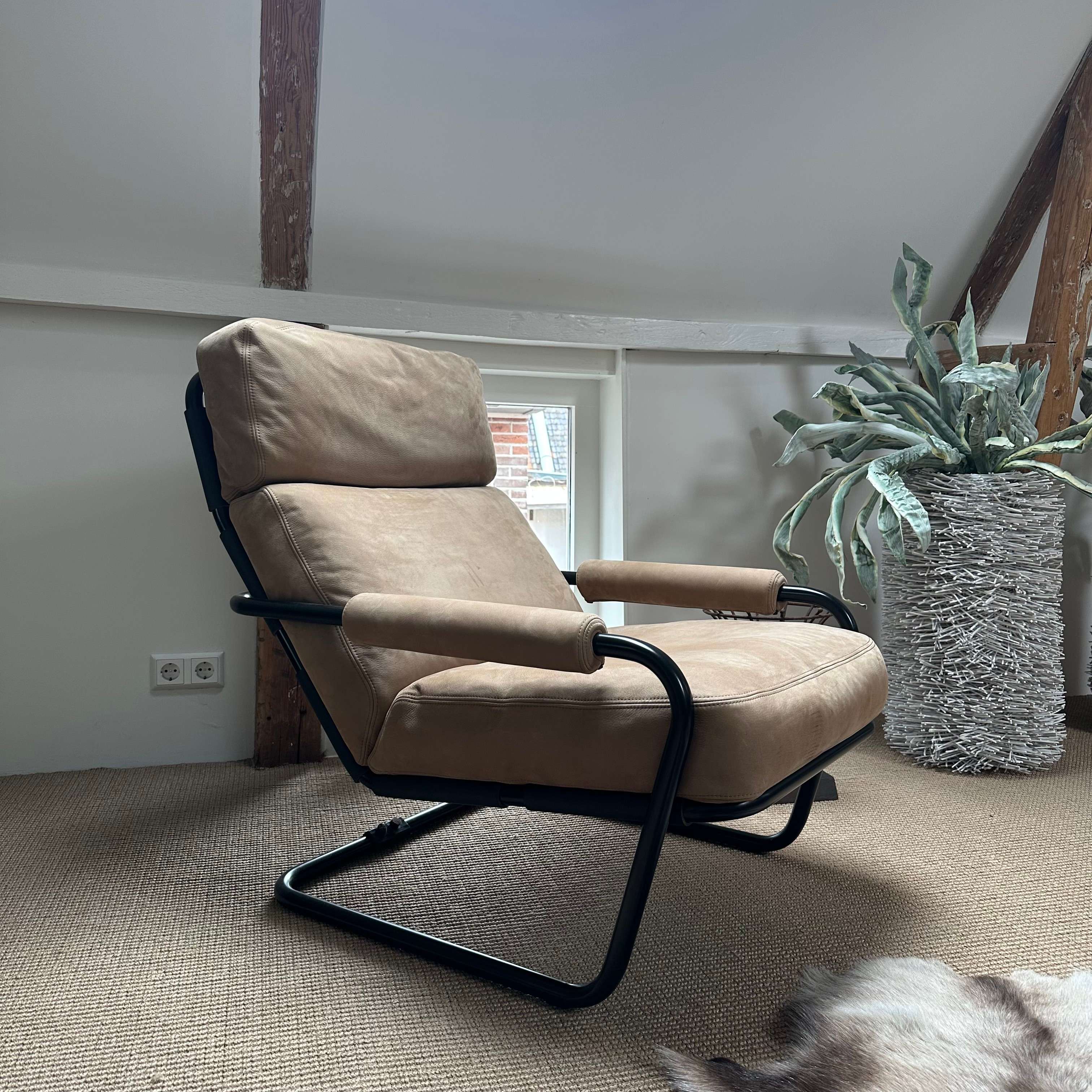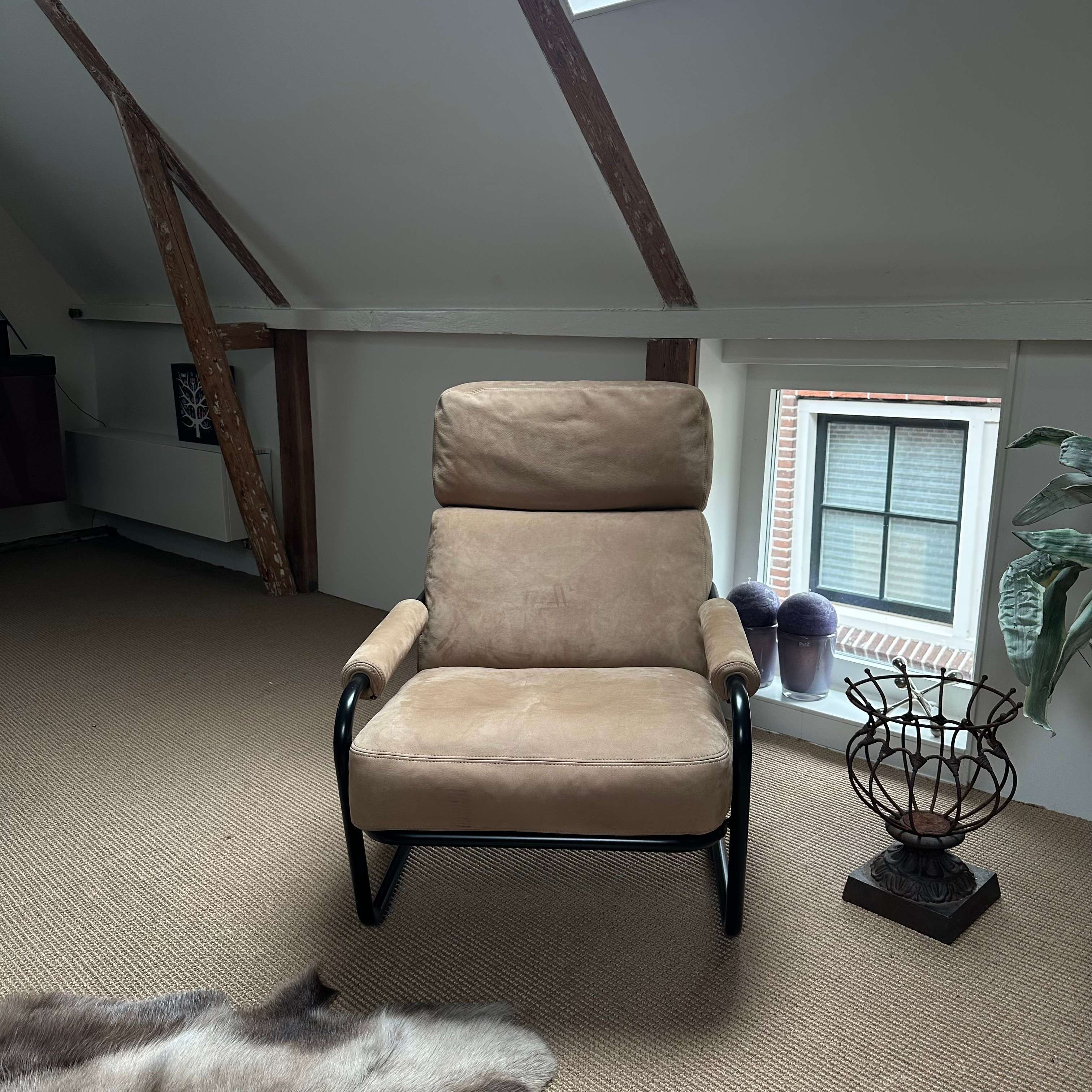 De Gelderland 601 is een klassieker die decennialang zijn charme behoudt. De strakke, evenwichtige lijnen worden versterk door de zachte rondingen van de zitting en rugleuning. In deze uitvoering, bekleed met luxe beige suède, krijgt de stoel een warme en natuurlijke uitstraling die moeiteloos past in zowel moderne als retro interieurs.