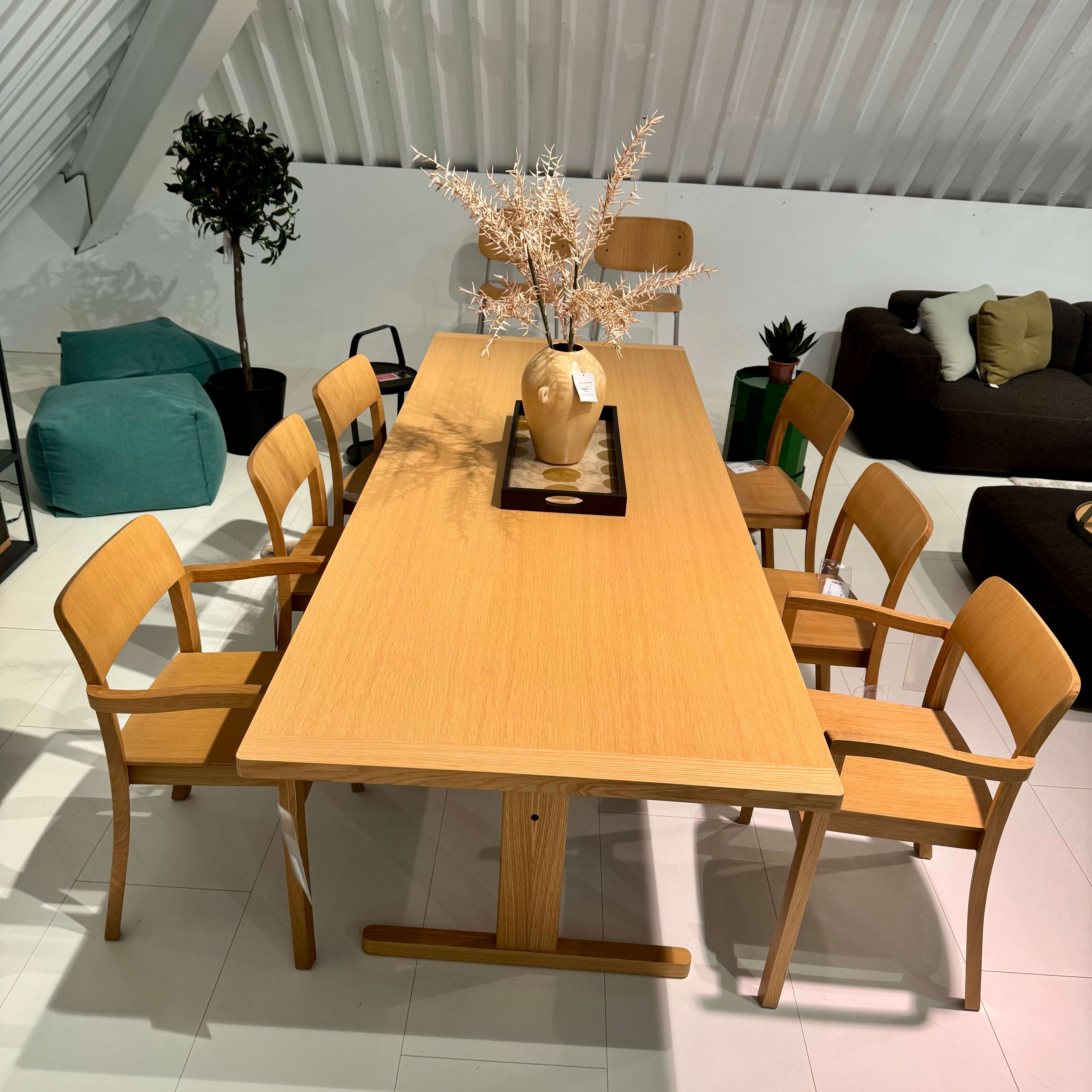 Deze combinatie ademt Scandinavisch vakmanschap en minimalistisch design. De Pastis stoelen, ontworpen door Julien Renault, combineren een stevige constructie met een lichte, verfijnde uitstraling. De variatie met en zonder armleuning geeft de set een speels en uitnodigend karakter.
