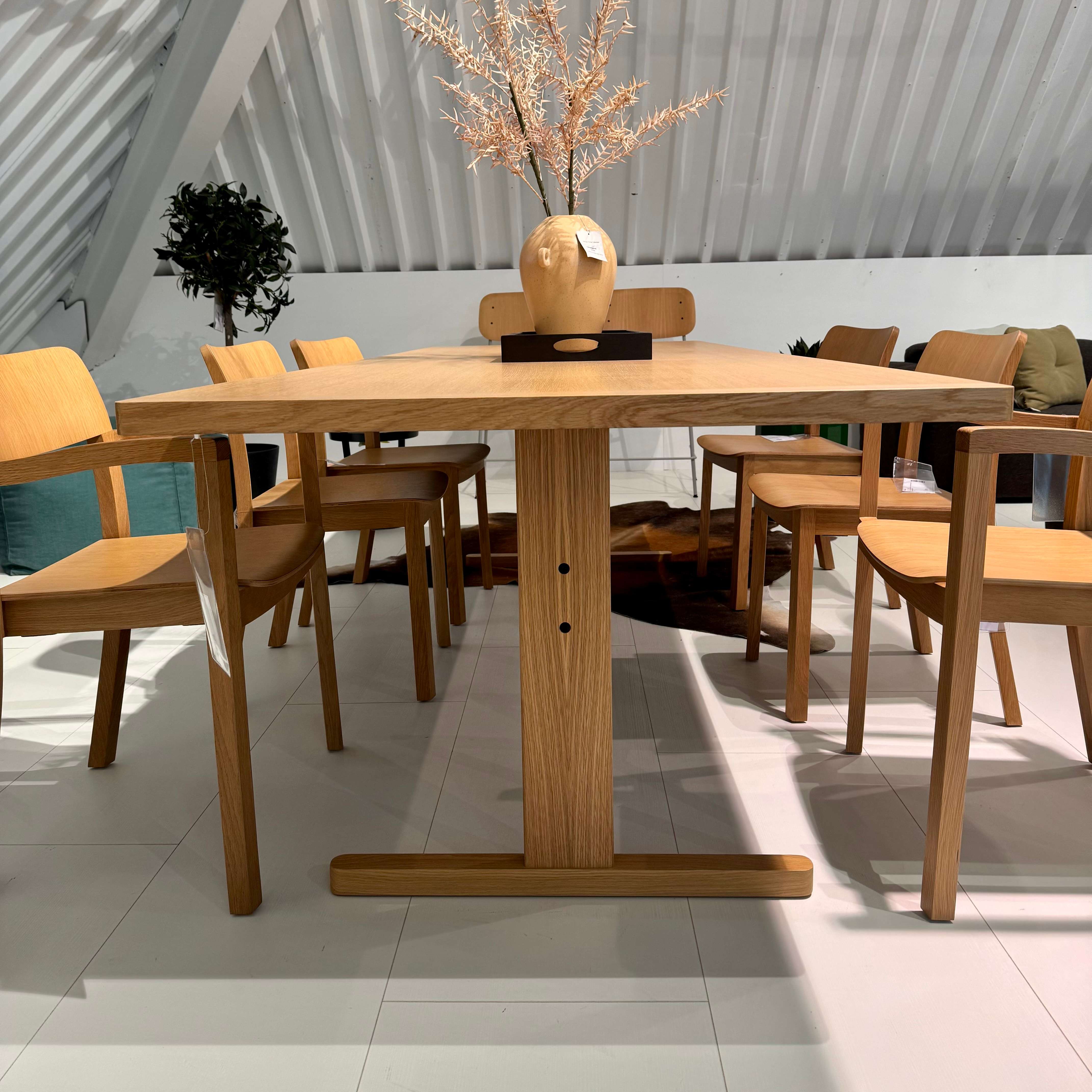 De tafel heeft een robuust houten blad en een elegant onderstel, waardoor het een stevige maar luchtige uitstraling krijgt. Geschikt voor 6 tot 8 personen.