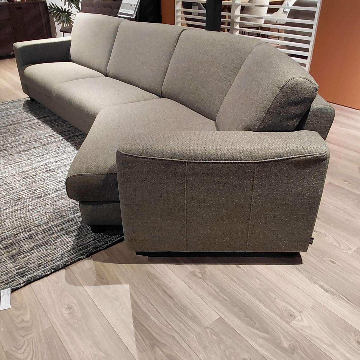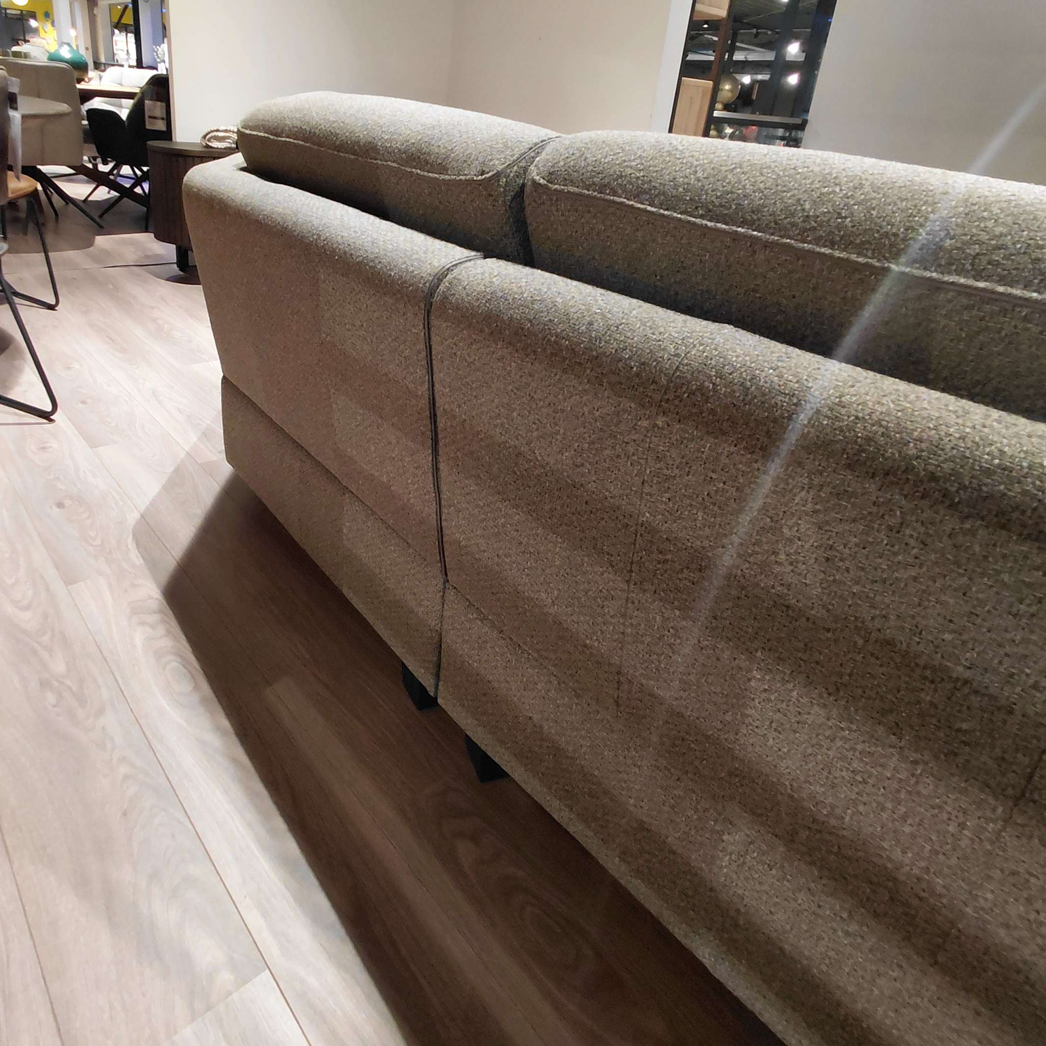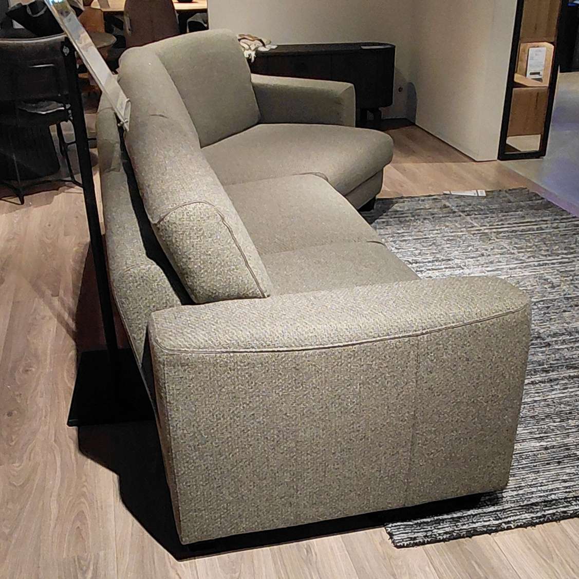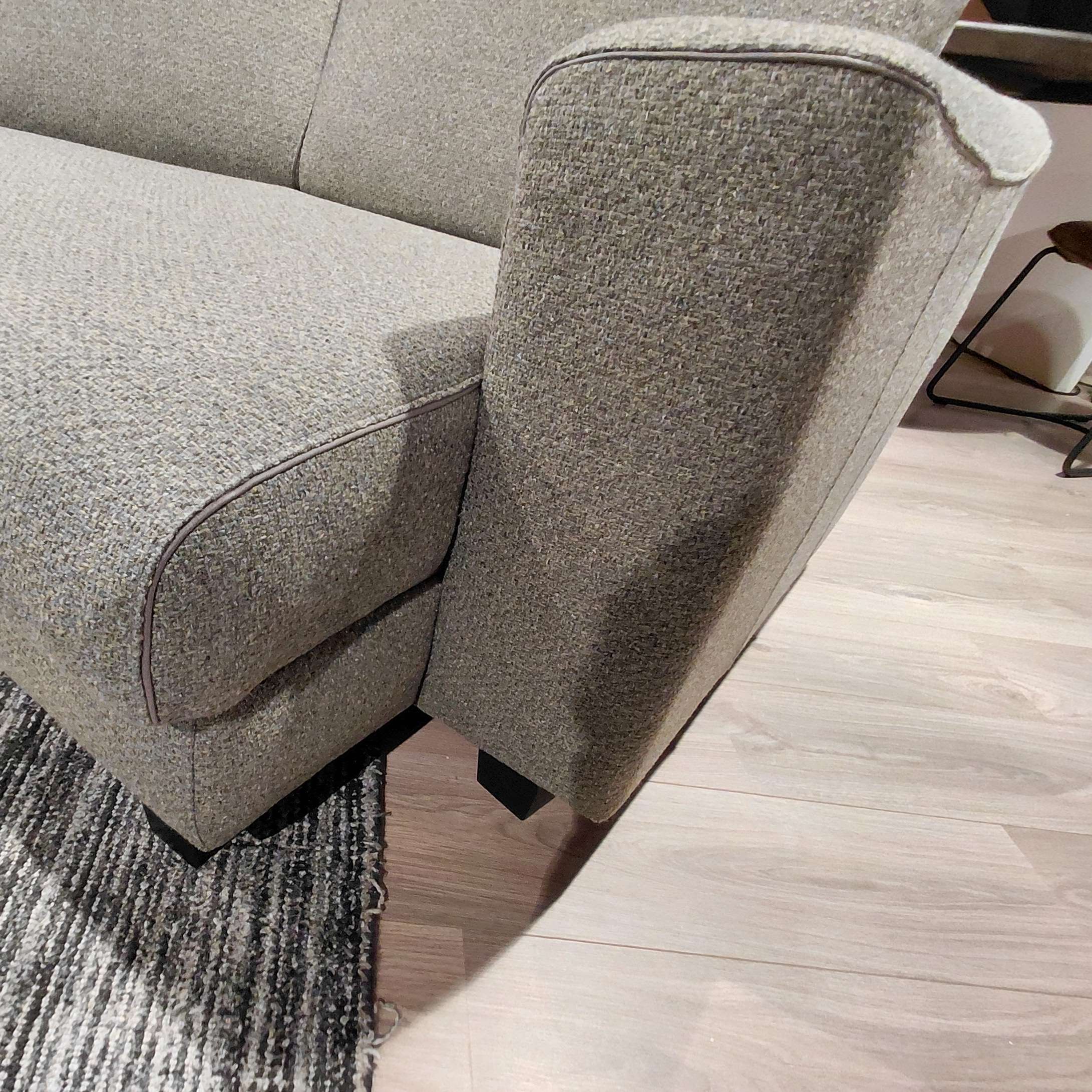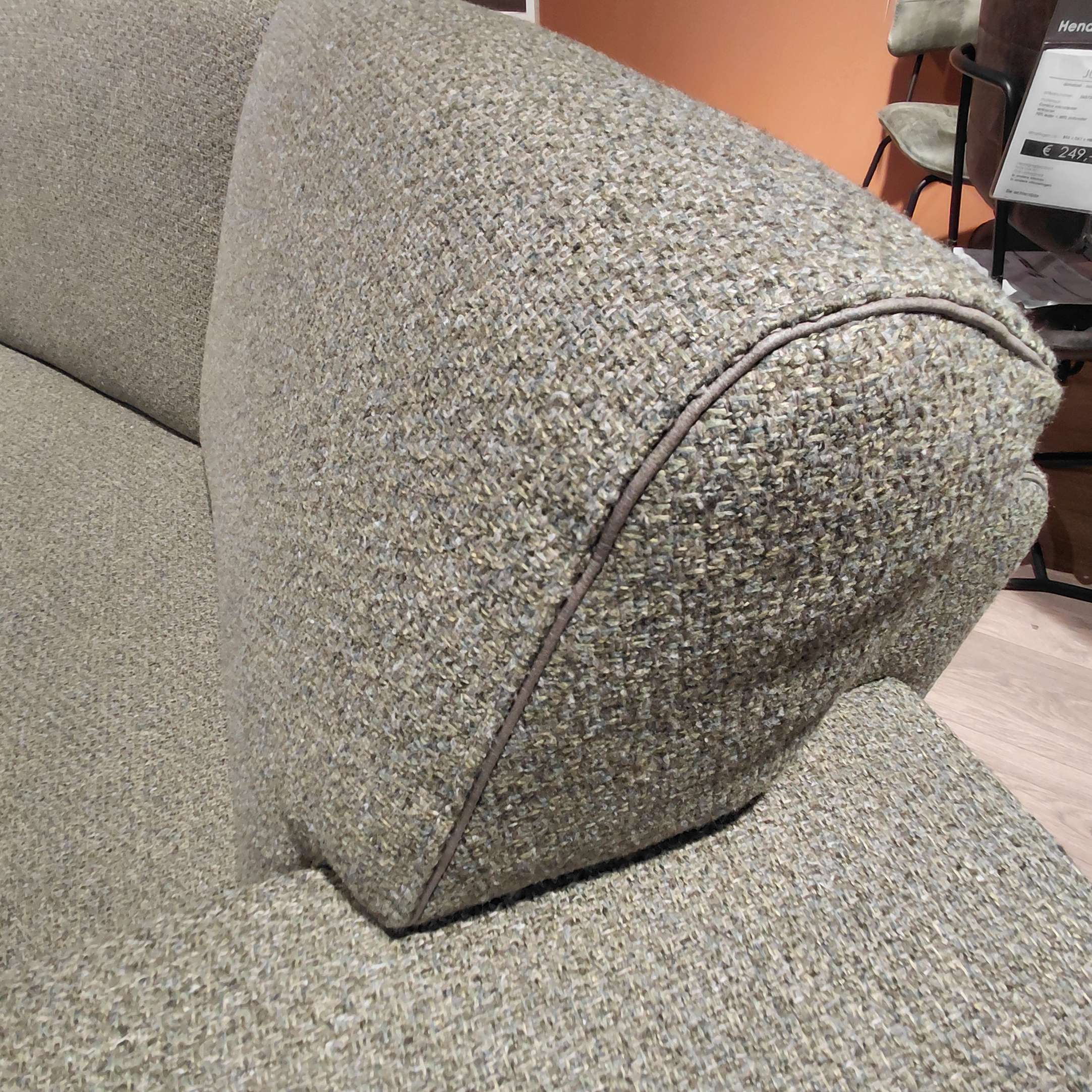 Deze zitbank, een 3 zits met een lounge end, van Henders en Hazel is uitgevoerd in de stof Cleo kleur groen. De details (bies) is uitgevoerd in de stof Pala lever.
