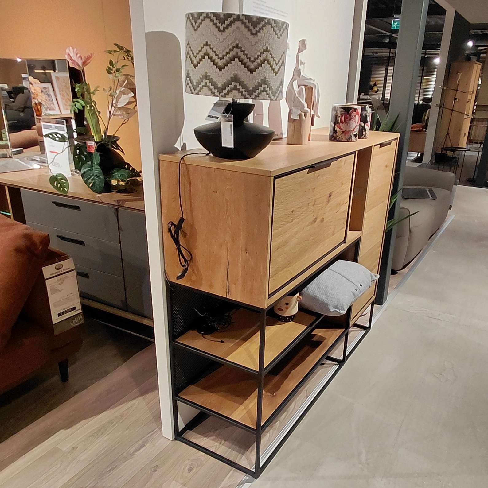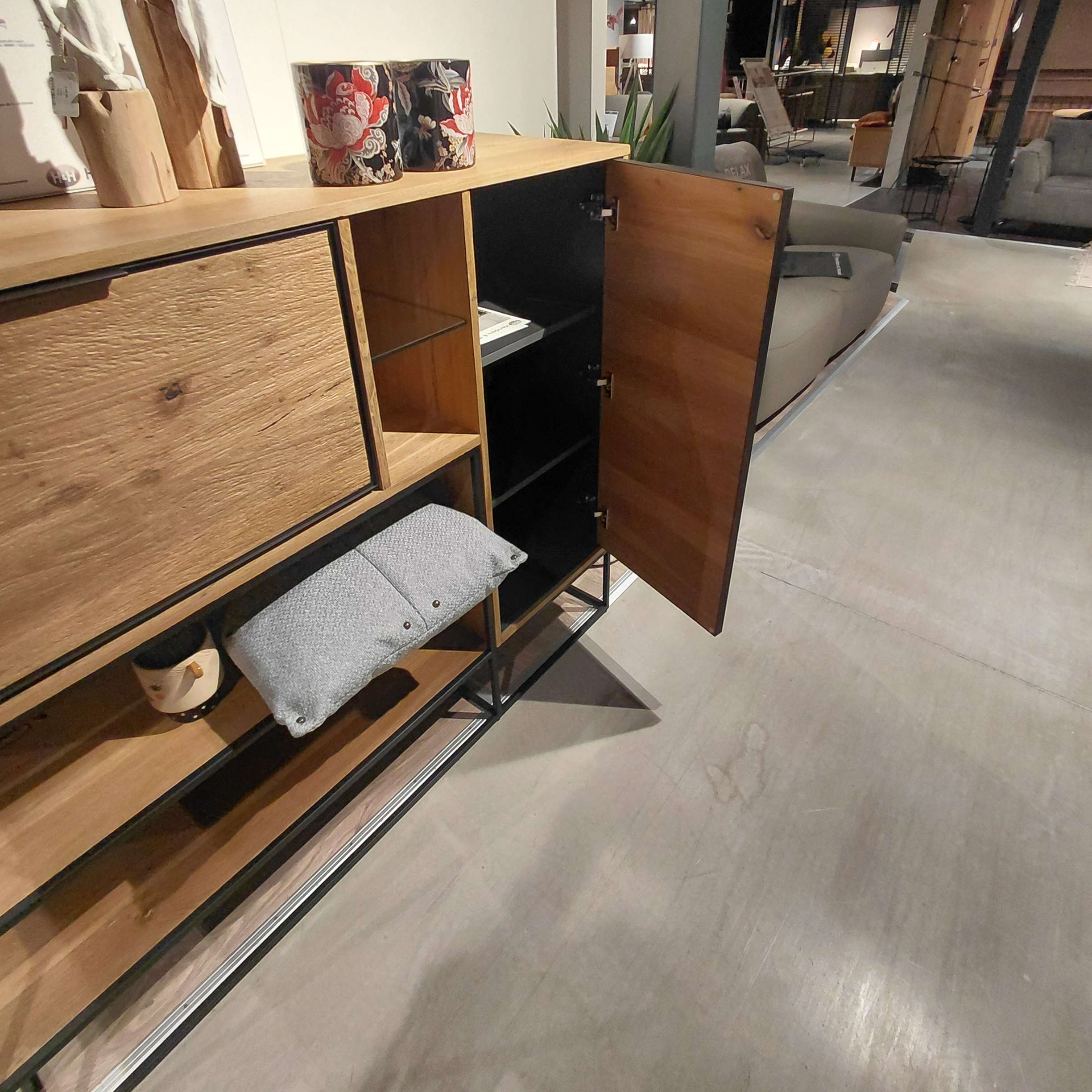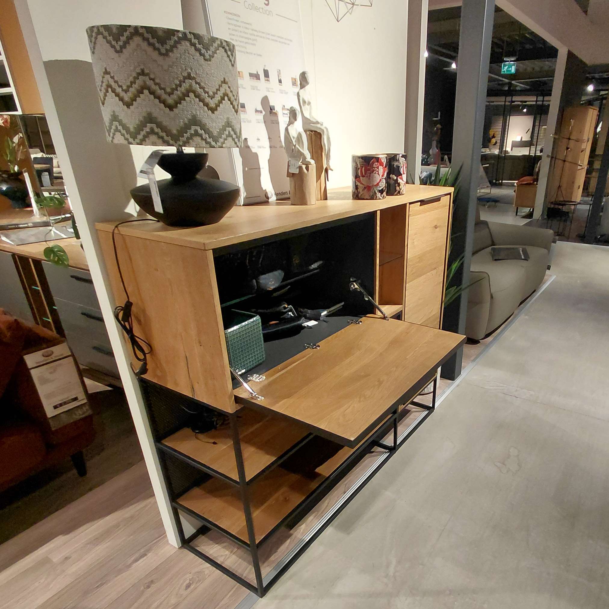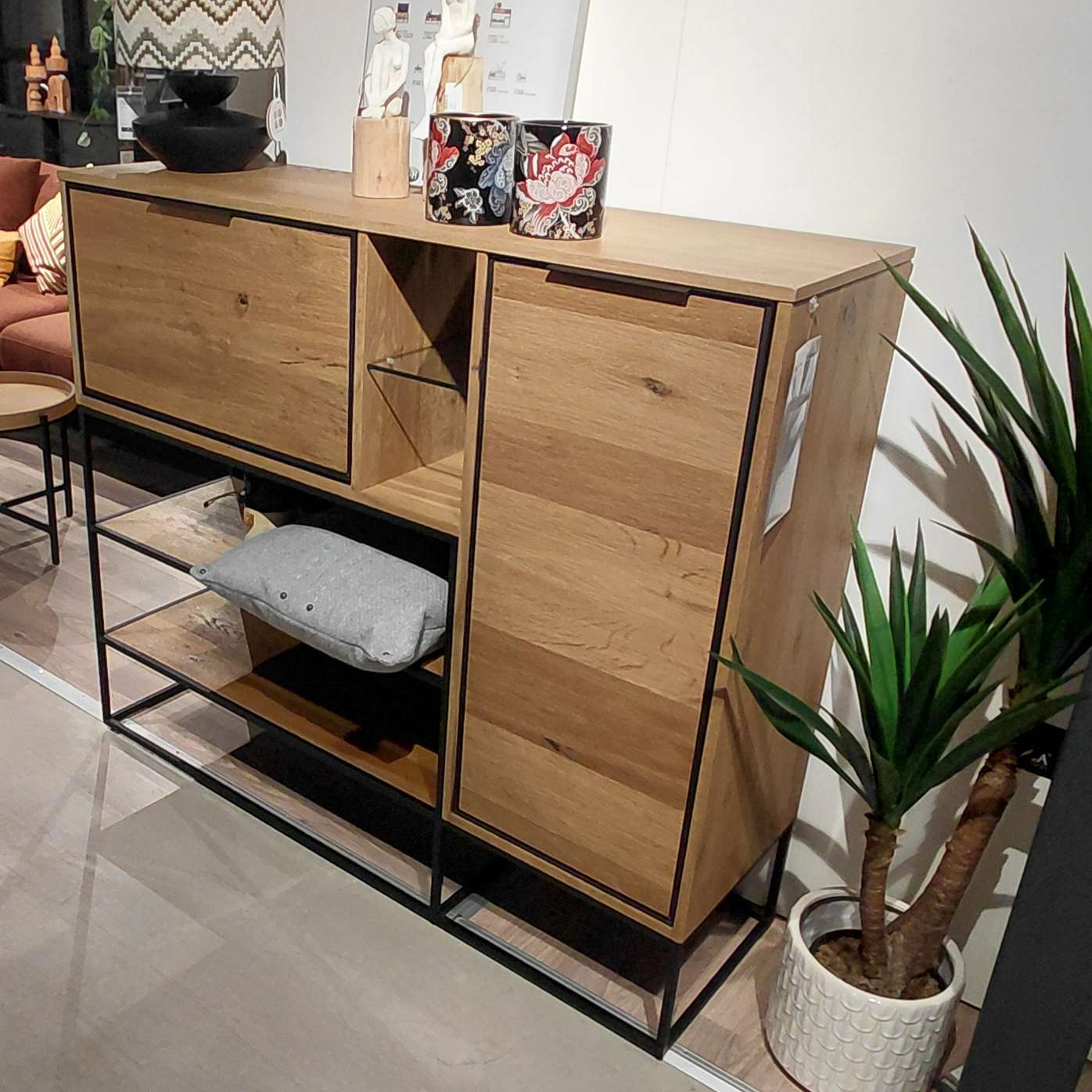 Deze dressette is uitgevoerd in onbewerkt eikenfineer in de kleur railway brown met zwart metalen accenten en poten.