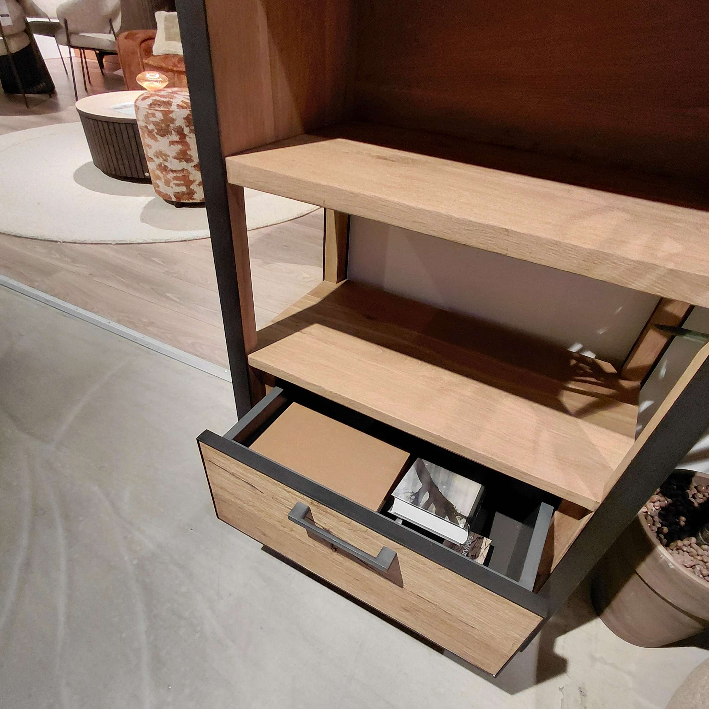 De moderne stoere boekenkast uit de Metalo collectie van Henders & Hazel heeft een opvallend design. De boekenkast heeft zowel open als dichte niches en een handige lade om spulletjes in op te bergen. Opvallend zijn de metalen poten die doorlopen langs de zijkant van de kast. De perfecte boekenkast voor de liefhebbers van een eigentijds interieur. De kast is afgewerkt met eikenfineer in de kleur railway brown met de metalen poten in de kleur desert black.