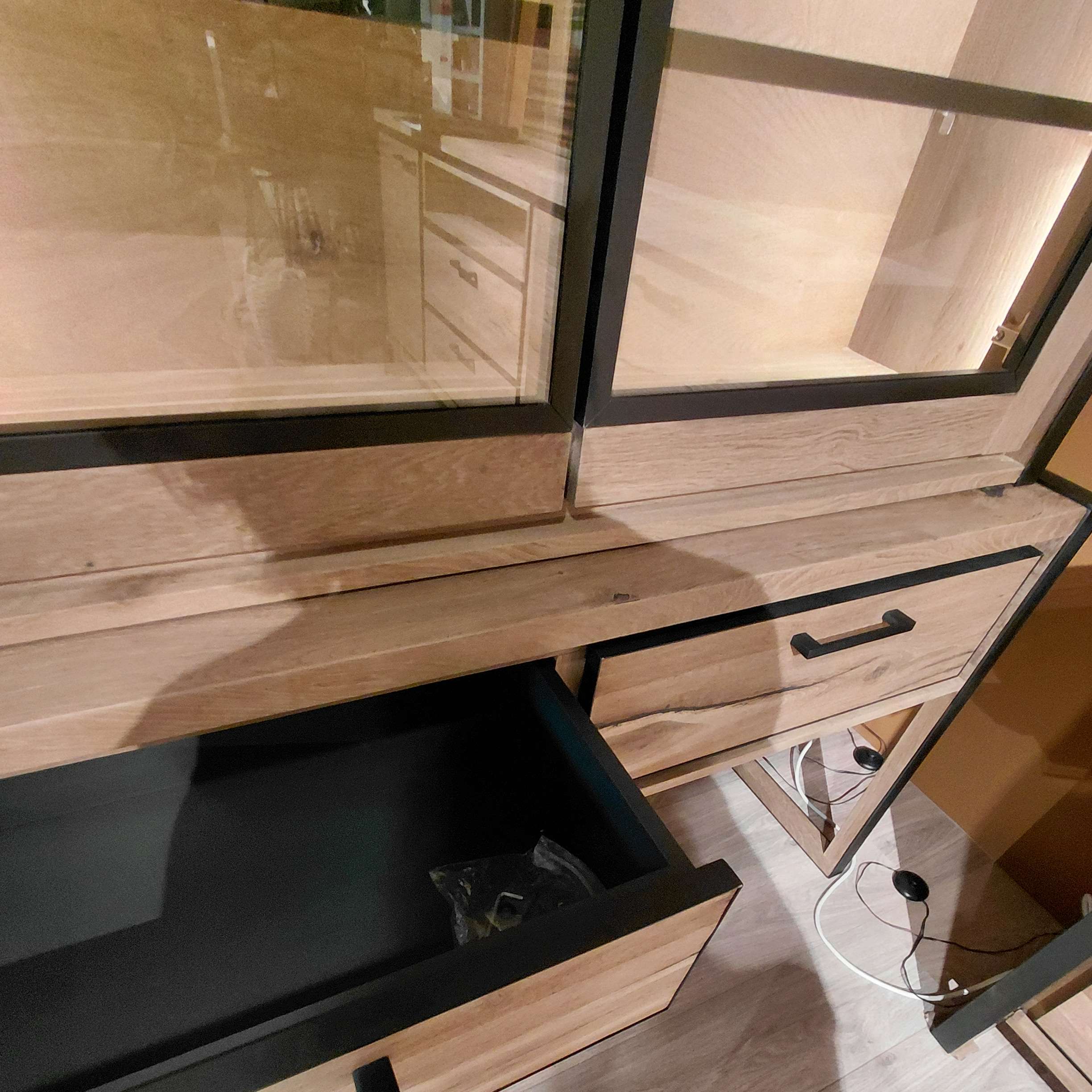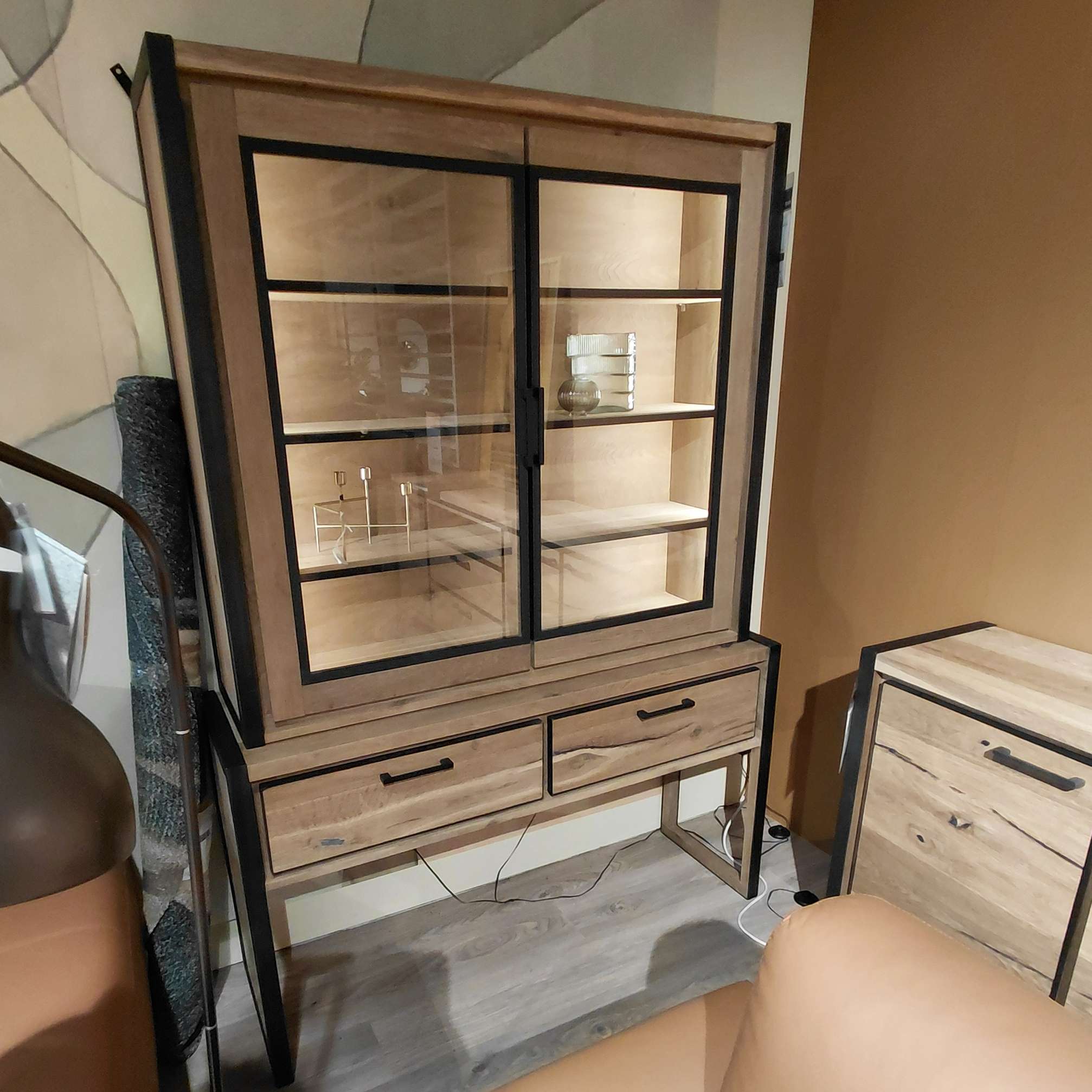 Deze buffetkast Metalo van Henders & Hazel heeft een rustieke uitstraling. De buffetkast is afgewerkt met eikenfineer. Het eikenfineer is vrijwel niet van massief hout te onderscheiden en afgwerkt in de kleur railway brown. Stoer zijn de metalen accenten in de kleur desert black. De buffetkast heeft 2 glasdeuren, 1 deur en 2 laden. De ledverlichting achter de glasdeuren zet fraai servies of woondecoraties in de spotlight.