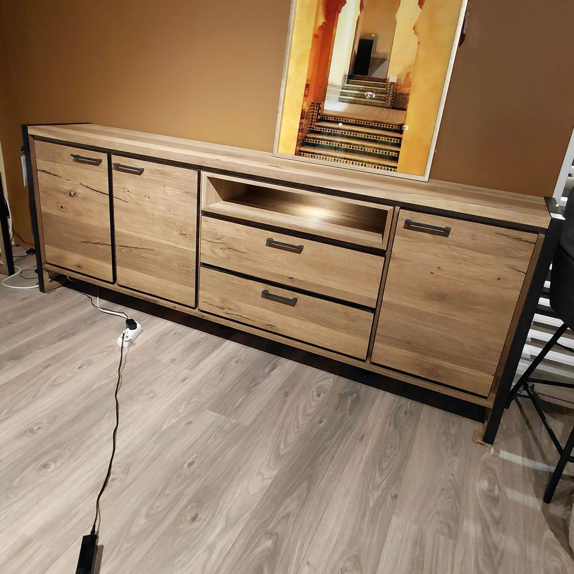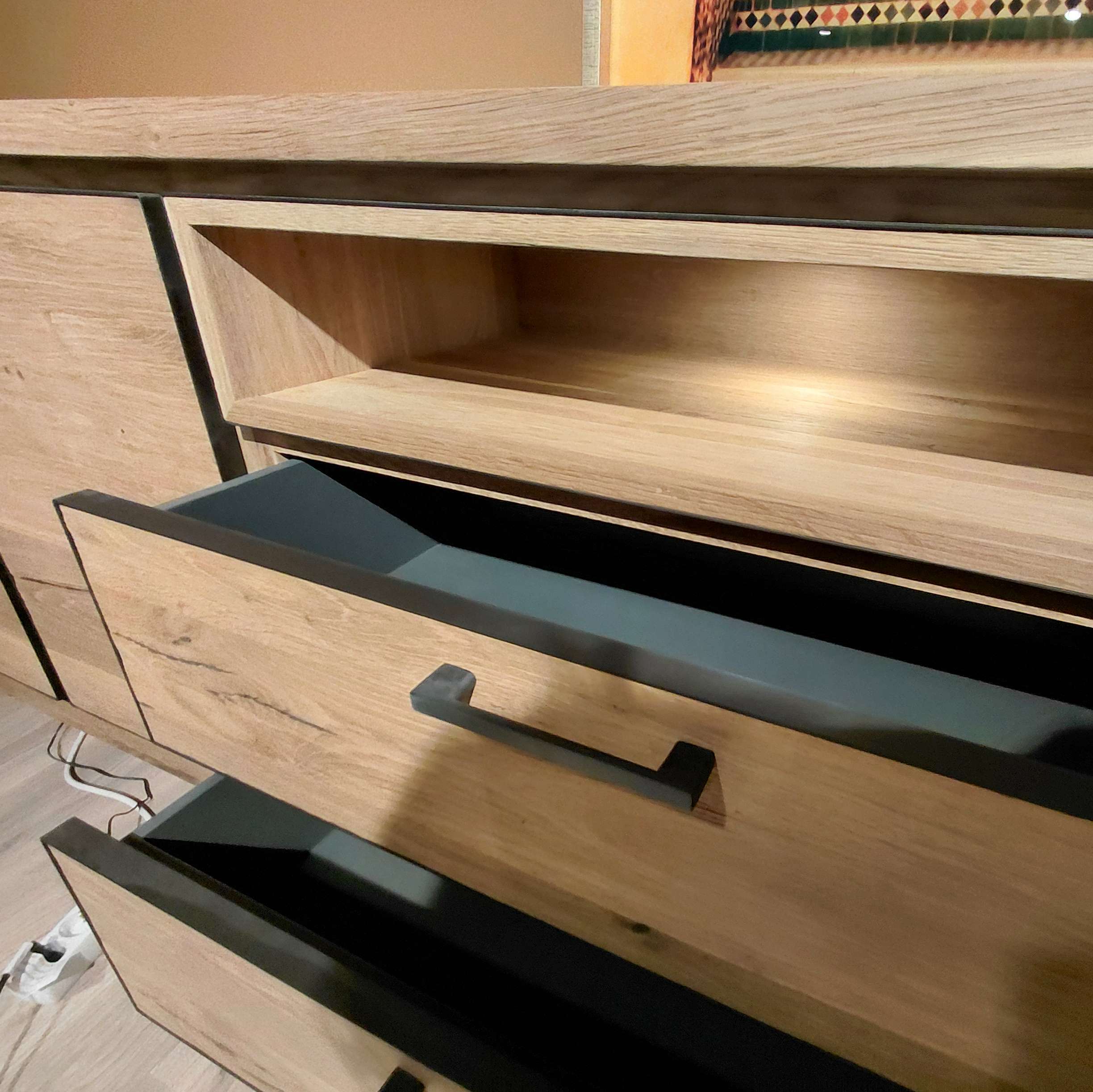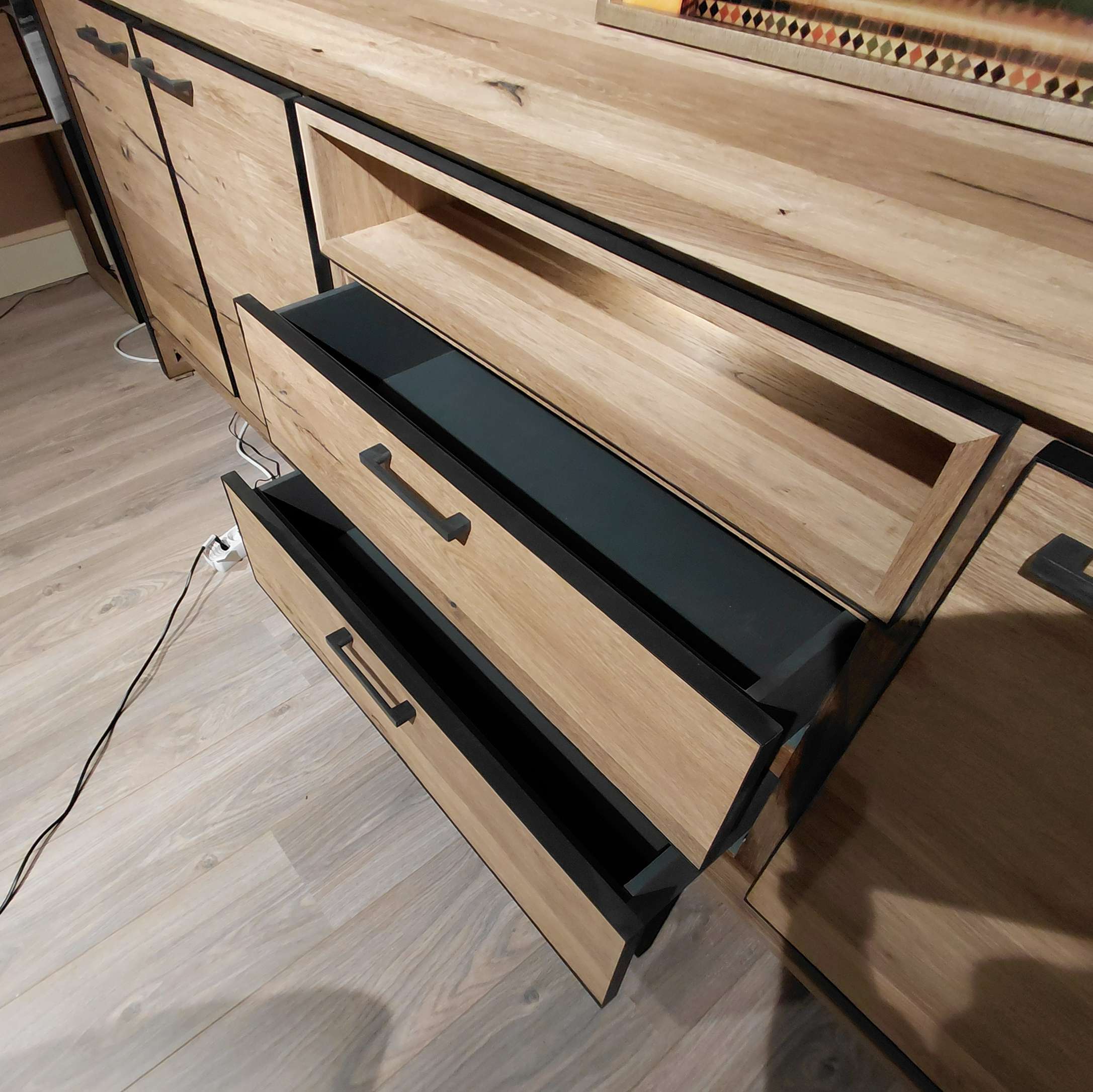 Dit dressoir van de Metalo serie van Henders & Hazel heeft 3 deuren, 2 laden en 1 niche. Opvallend aan dit moderne dressoir zijn de metalen accenten, zowel in de poten die doorlopen als de frames rondom de deuren, laden en niche. Het dressoir is gemaakt van eikenhoutfineer en heeft een mooie natuurlijke tekening, die zo kenmerkend is voor eikenhout.
