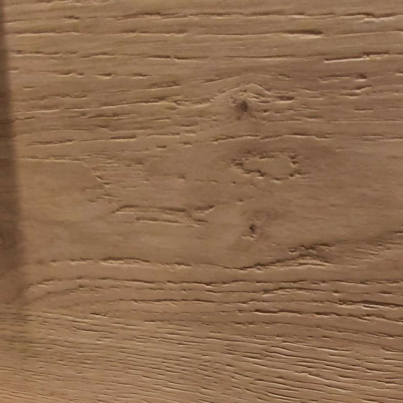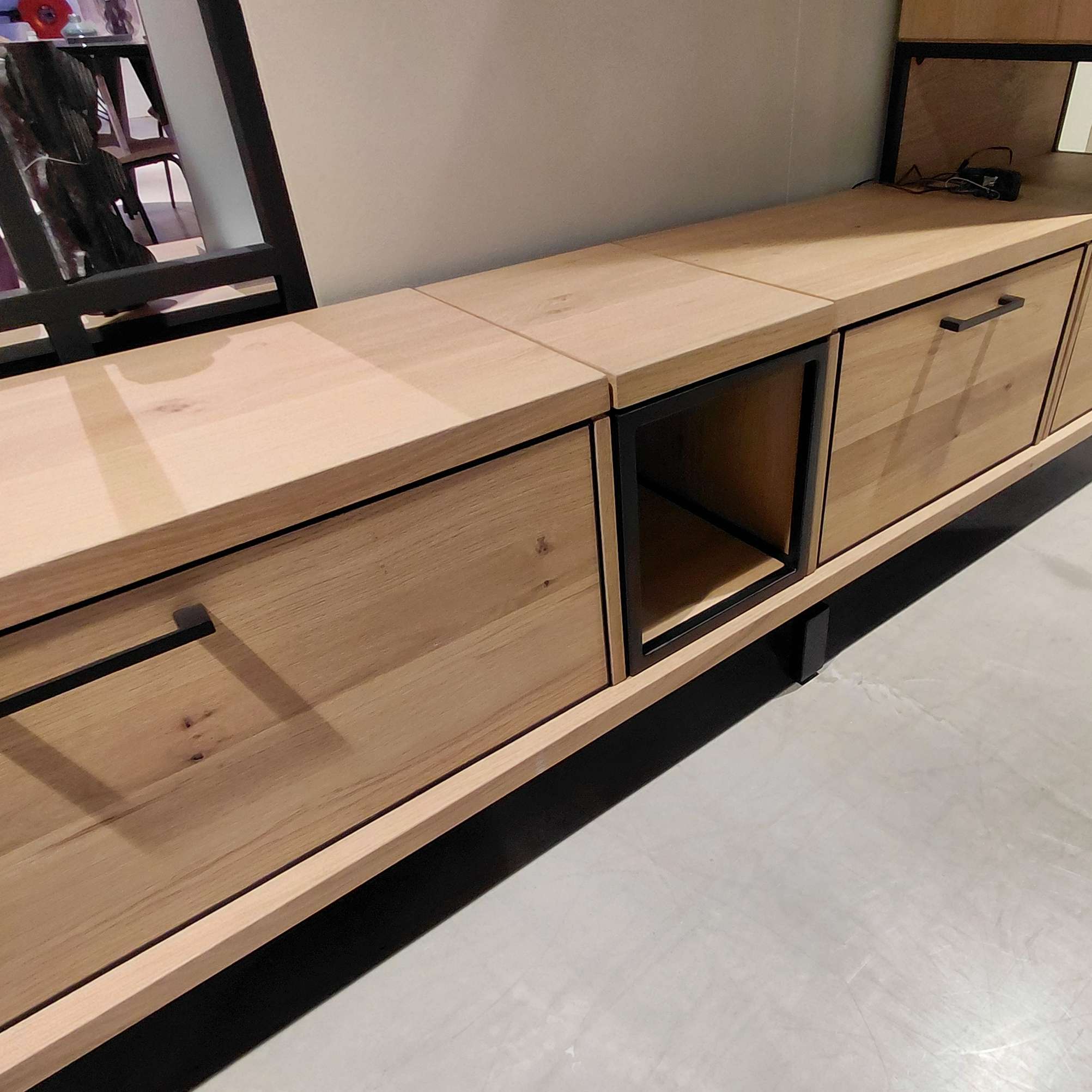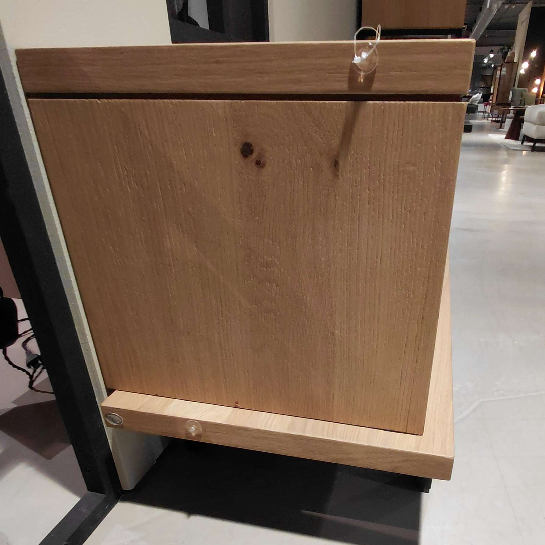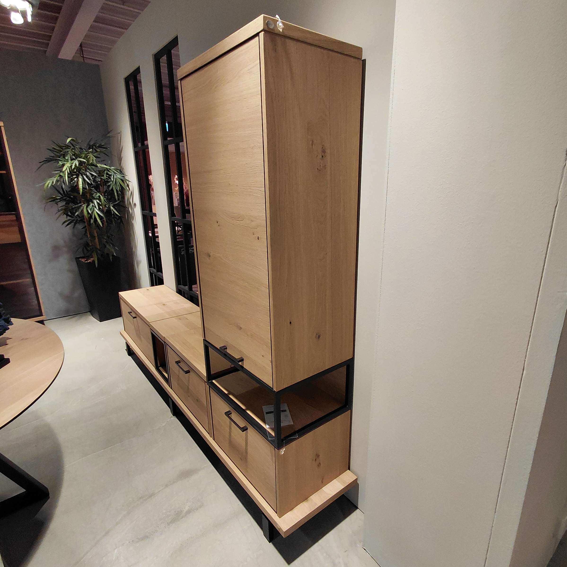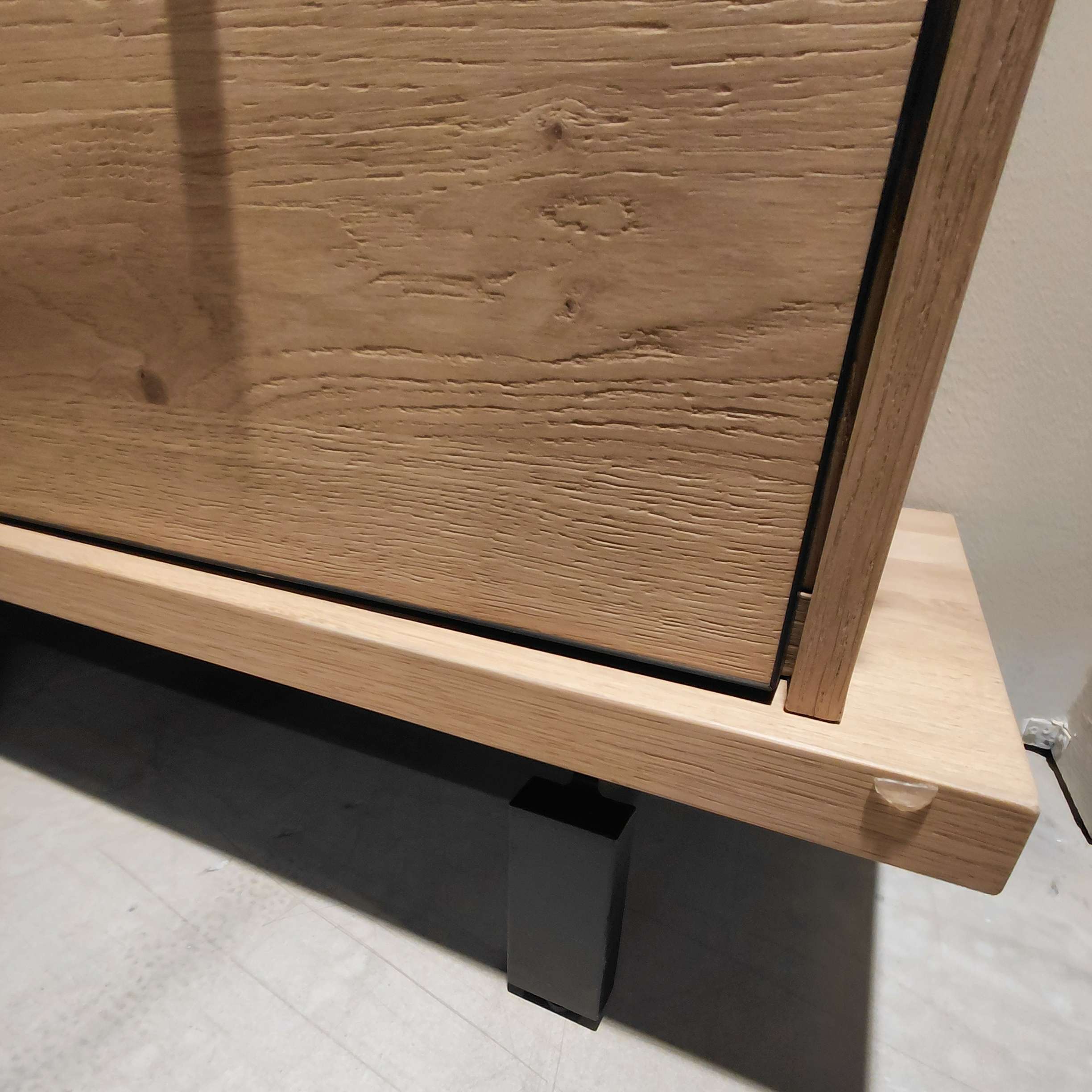 De kast is afgewerkt met handgeborsteld eikenfineer in een naturel kleur. Zwarte metalen poten en zwarte metaalaccenten kenmerken de kast.