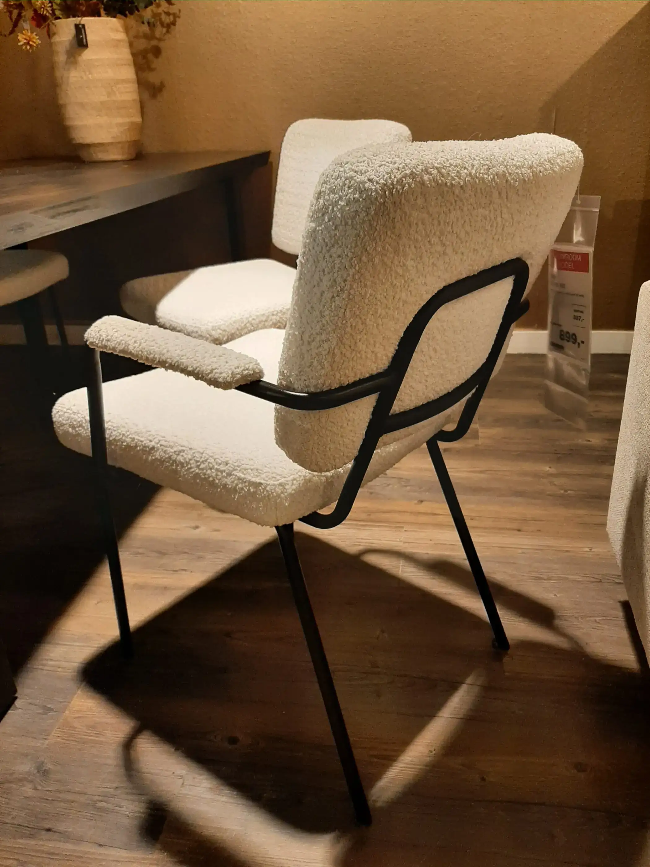 Eetkamerstoelen Bady wit (set van 4 waarvan 2 met armleuningen), uit de veelzijdige en eigentijdse INHOUSE collectie. Eetkamerstoelen voor ieder interieur en alle woonstijlen! Zoals afgebeeld: Uitgevoerd in stof adam 02-white met zwart metalen frame.