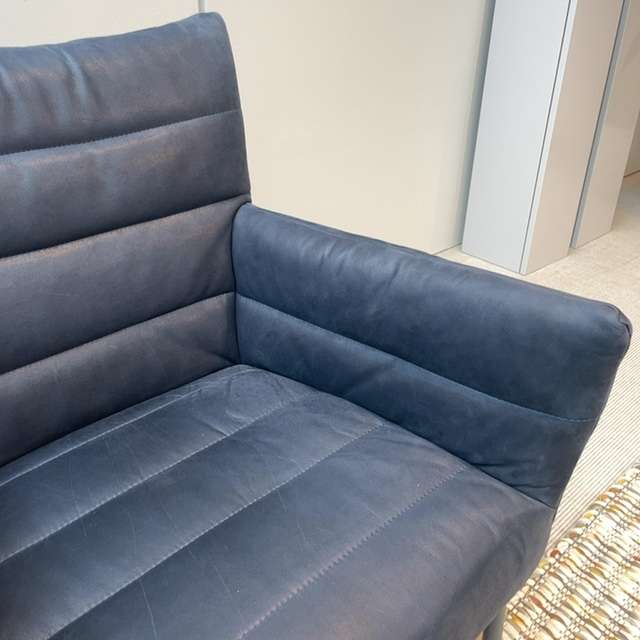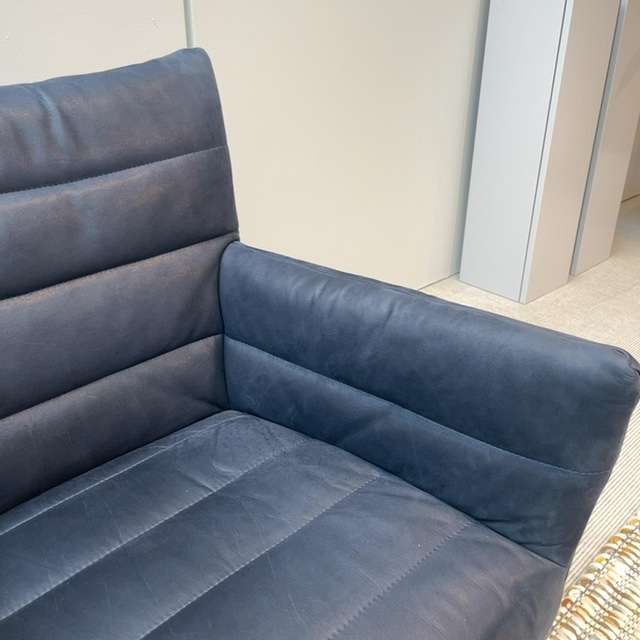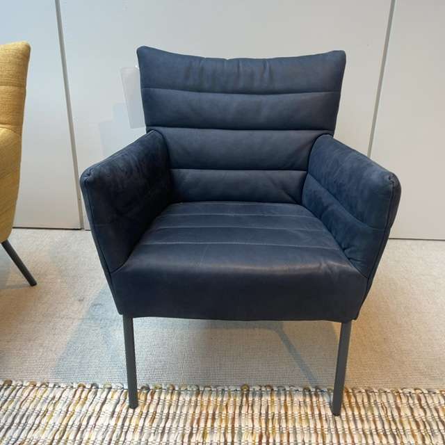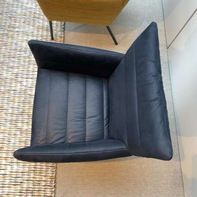 Fijne lounge fauteuil van Label v.d. Berg. De fauteuil is uitgevoerd in leer Elite sapphire 5004 met matching stiksel. De poten in poedercoat Black grey.