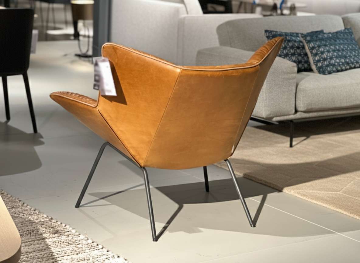 Fauteuil Gustav van Label Uitvoering: Leder Indian Buffel, kleur naturel met meekleurend stiksel Bies in leer Nova Zembla, kleur Acorn Onderstel in Black grey met viltdoppen