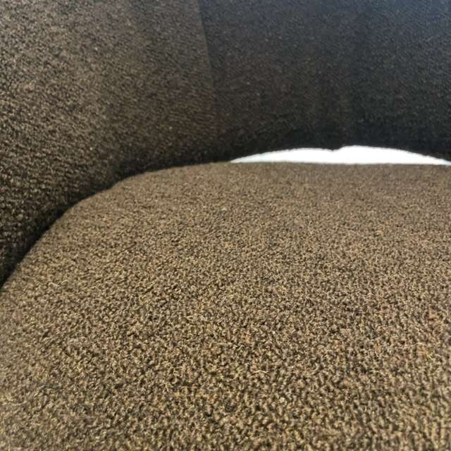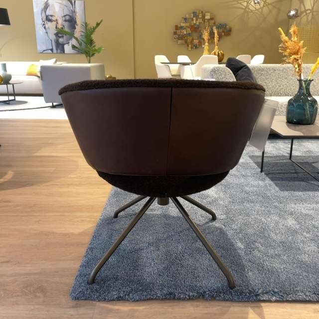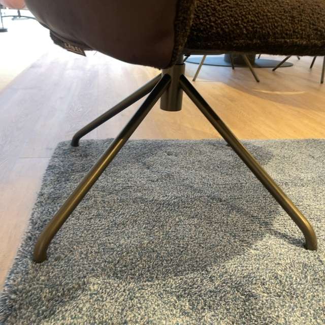 Mooie fauteuil met draaionderstel. Fauteuil is uitgevoerd met een duo-stoffering, binnenzijde stof Undyed Wool brown en buitenzijde leer Rio dark brown. Het onderstel is poedercoat Bronze brown met vilt.