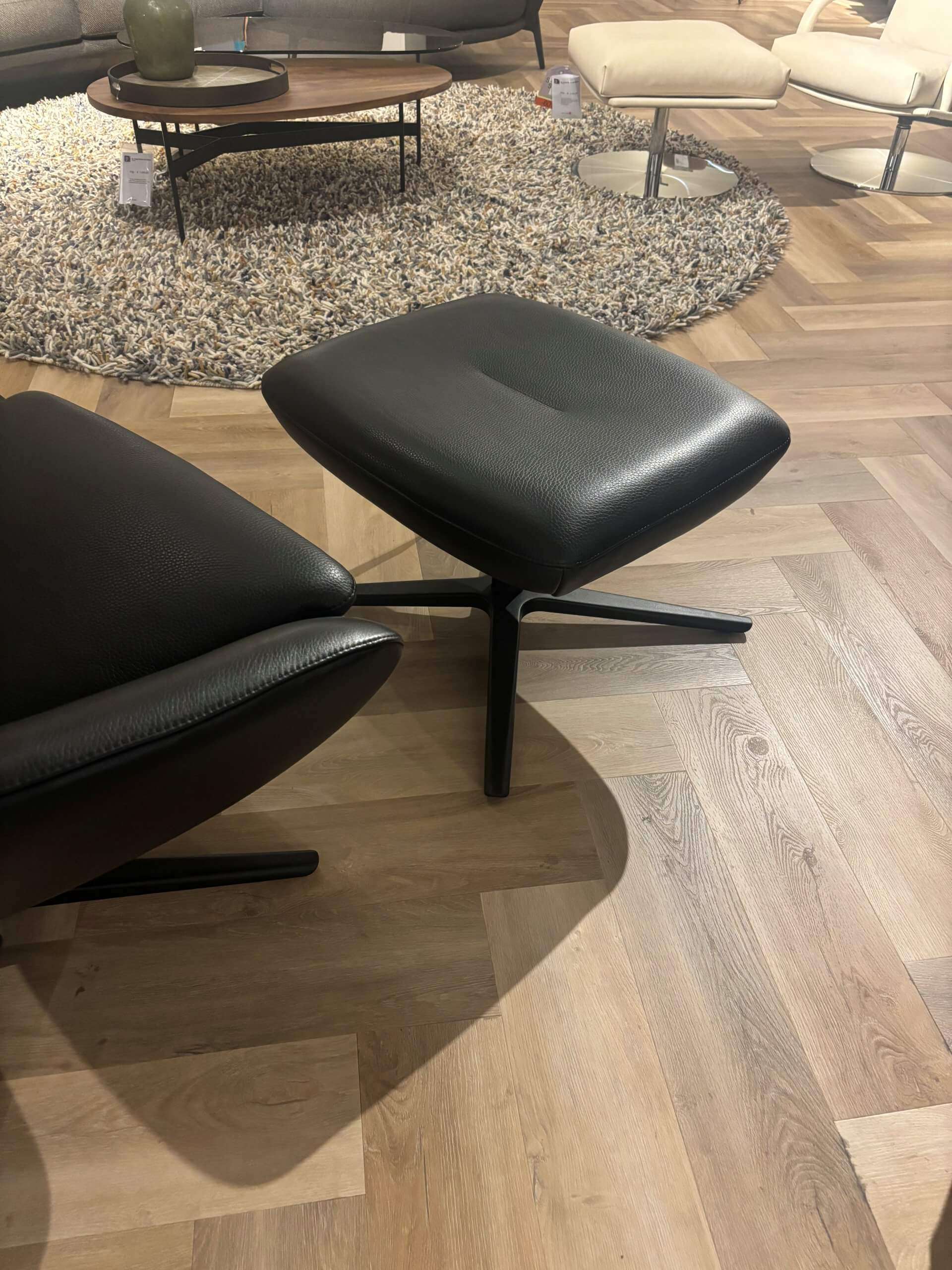 De poef is bekleed met hoogwaardig leder Negev 100 Noche, afgewerkt met ton-sur-ton stiksels zoals de fauteuil. De draaibare voet (model Pure, 4-teens) is uitgevoerd in Epoxy E1500 Granite Matt.