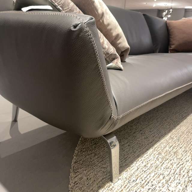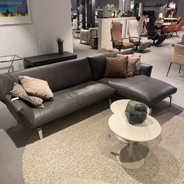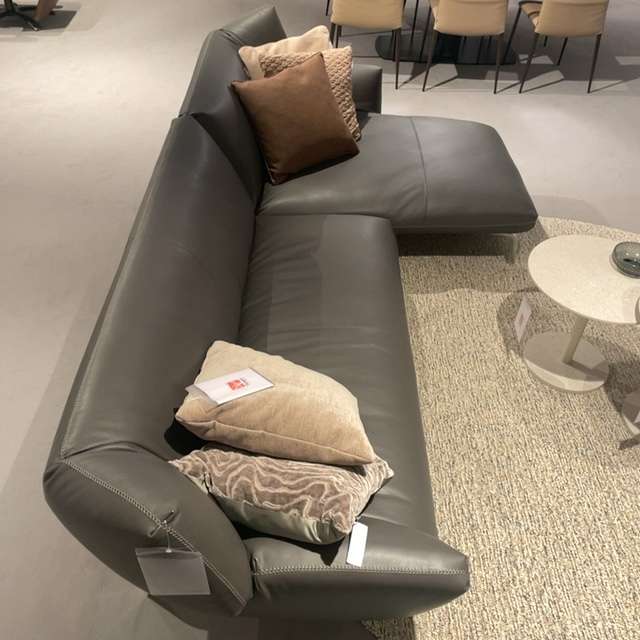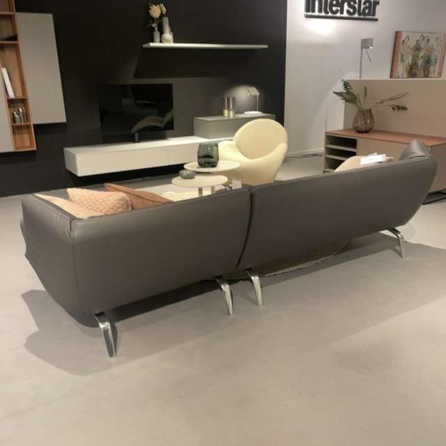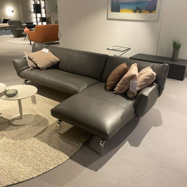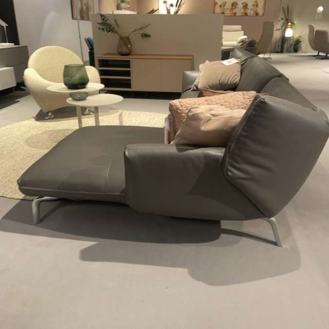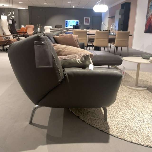 Mooie hoekbank bestaande uit 3-zitsbank met 1 arm links, chaise longue arm rechts. Uitgevoerd in leer Senso 11220 castor met stiksel Cross 1228 Taupe, poten aluminium gepolijst.