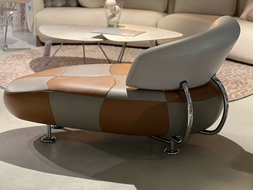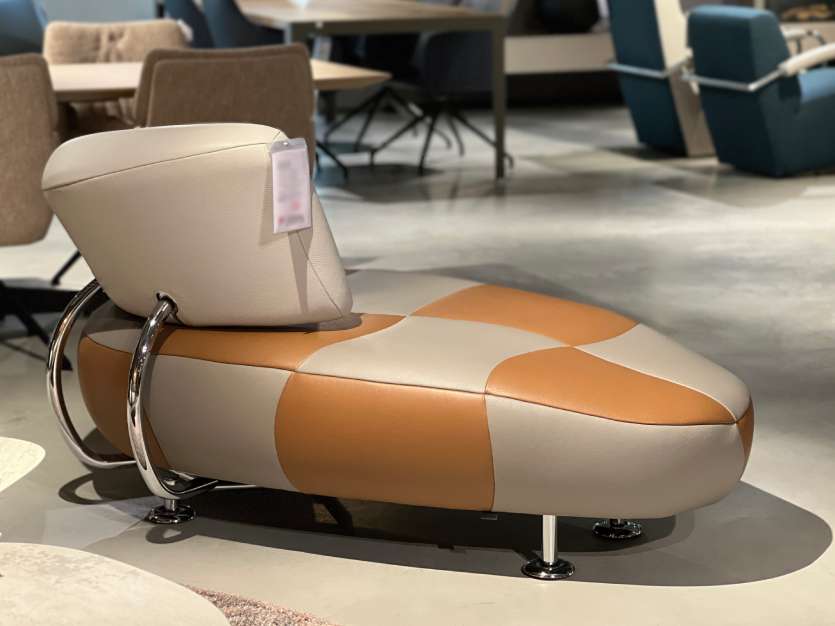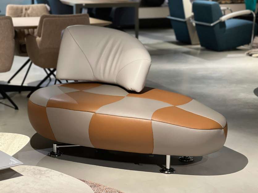 Fauteuil Kikko van Leolux Uitvoering: Zitting arcedeel: Leder Senso, kleur Camel Zitting blancodeel: Leder Senso, kleur Mist Rug arcedeel en blancodeel: Leder Senso, kleur Dawn Rugbeugel en poten: Chrooom