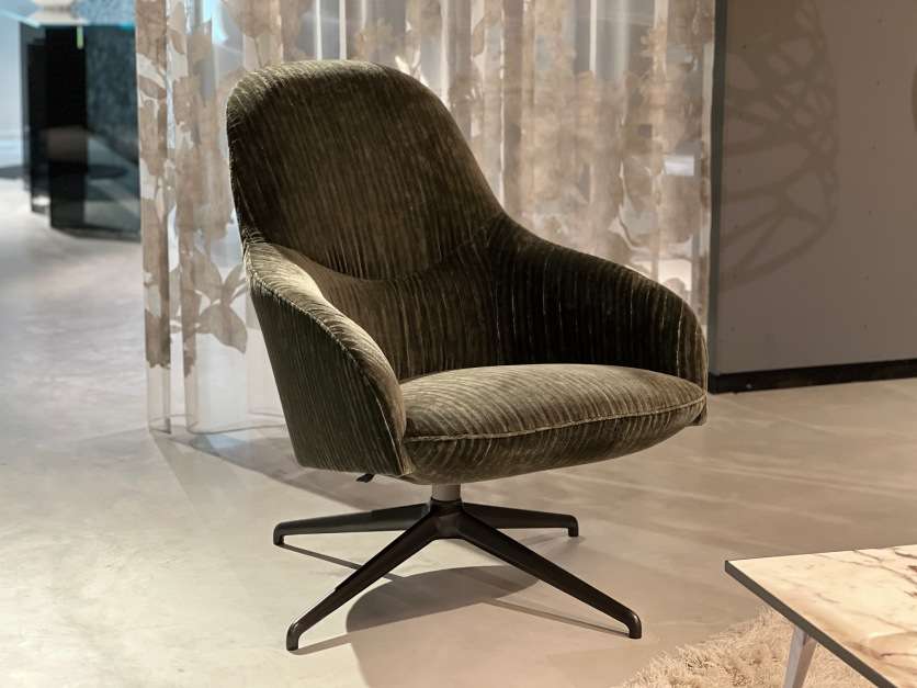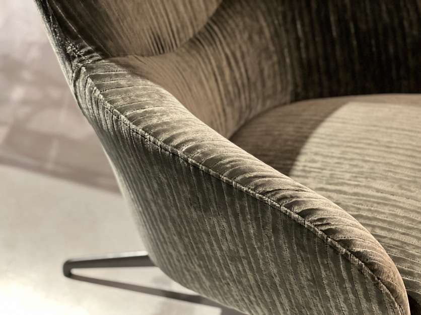 De fauteuil is tot in de kleinste details uitgewerkt, wat resulteert in een onweerstaanbare aantrekkingskracht. De stof die gebruikt wordt voor de bekleding van de fauteuil is geïnspireerd op sjaals en tapijten uit het Midden-Oosten. Ontworpen door Vincent Van Duysen, is dit luxe jacquardfluwelen textiel voorzien van onregelmatige strepen die perfect passen bij de stoffering.