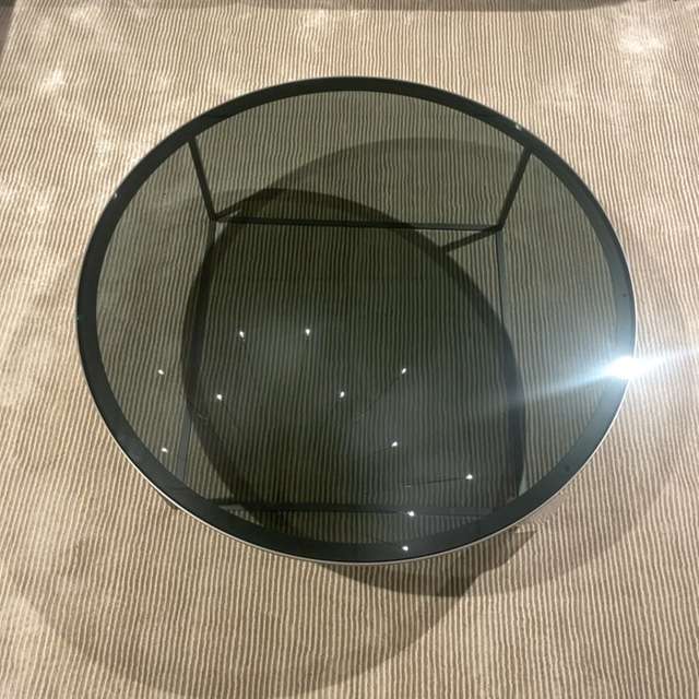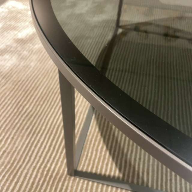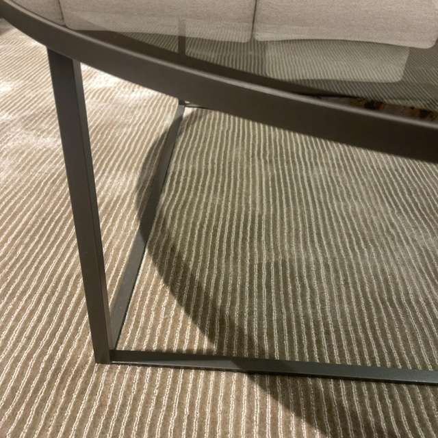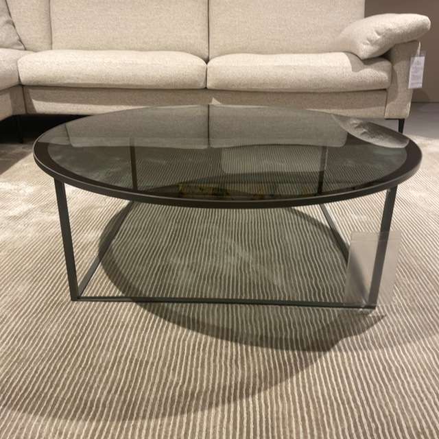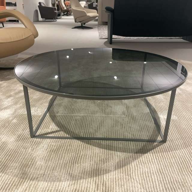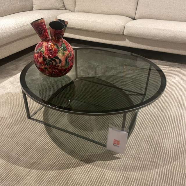 Mooie salontafel van Leolux. Tafel is uitgevoerd in het rond met een glazen blad en een recht frame, het glas is grijs glas met een frame in epoxy E3500.