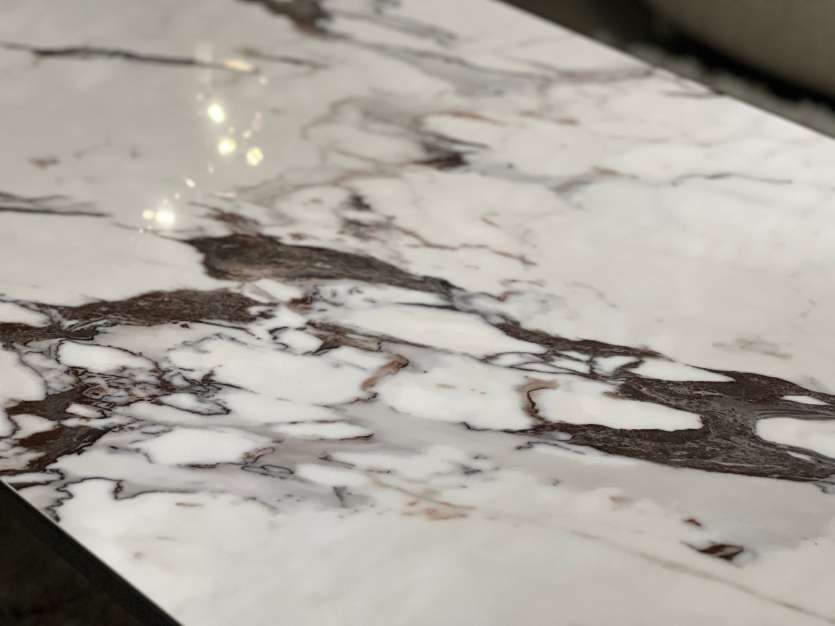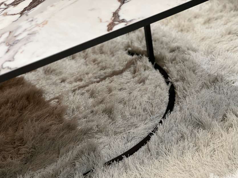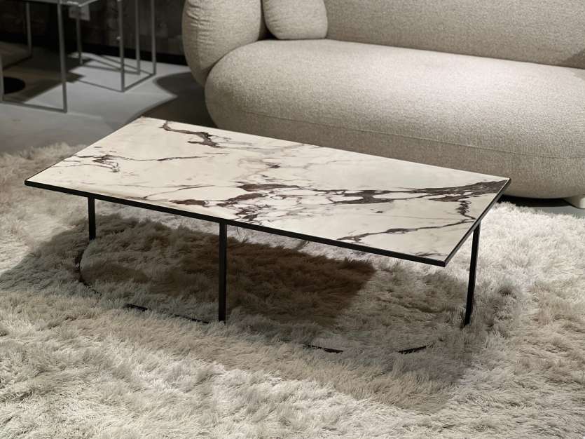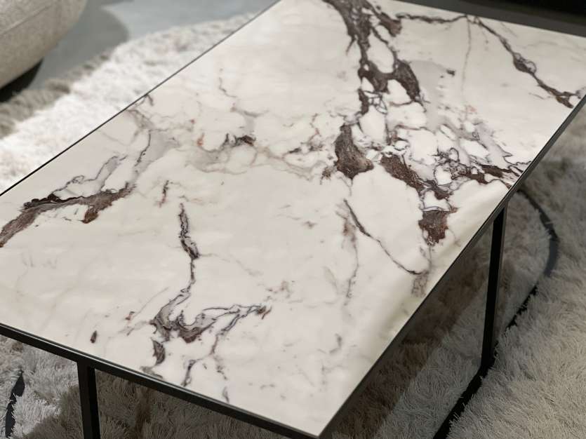 Showroommodel: Salontafel Prismo van Leolux Uitvoering: Blad in Ceramic Capraia (beige gloss) Onderstel: Epoxy, kleur 2200 Nuit Afmeting: 120 x 65 cm, hoogte 32 cm