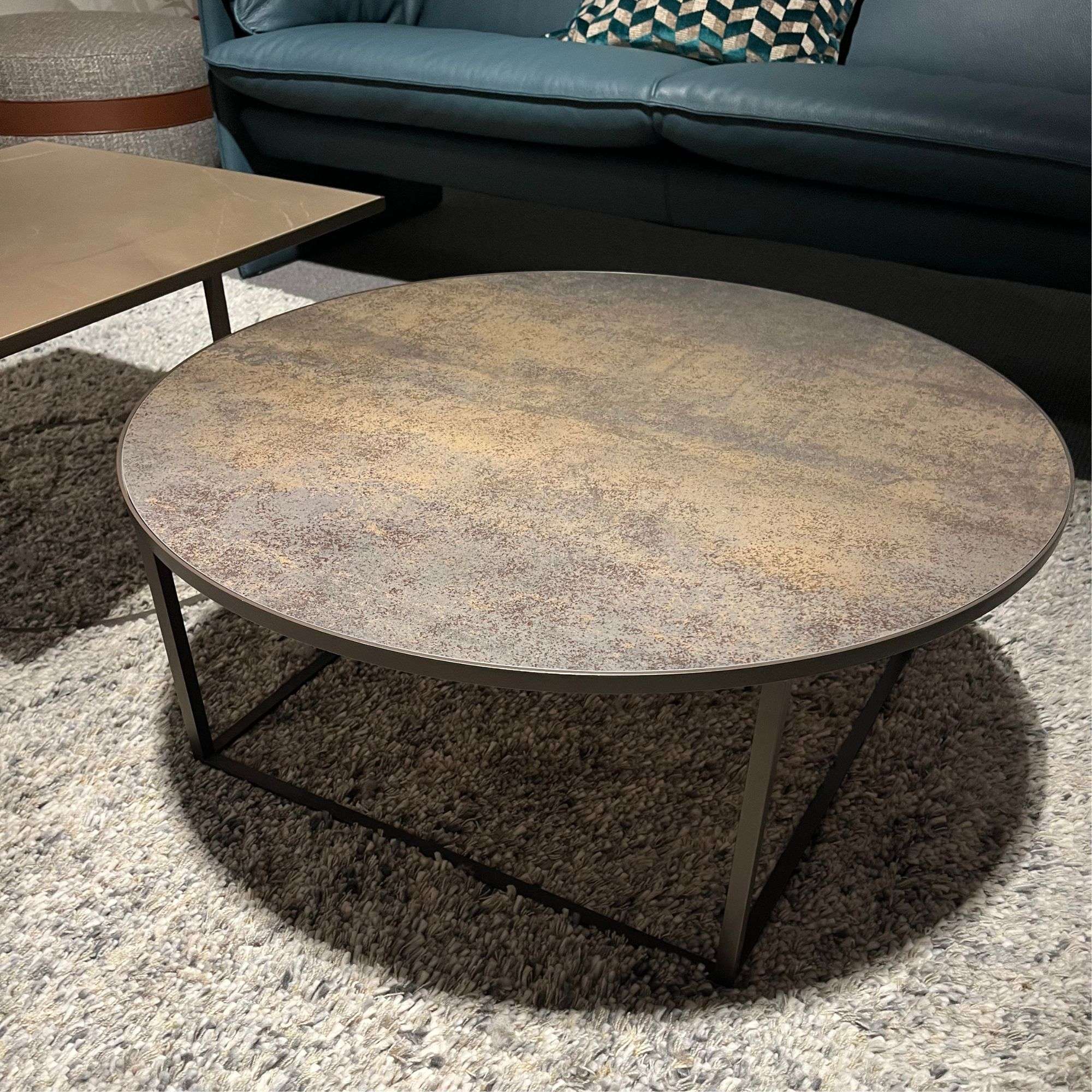 Blad rond in Ceramique Iron Moss Onderstel vierkant in Epoxy E2500 taupe Blad vierkant in Ceramique Pulpis Onderstel rond in Epoxy E2500 taupe