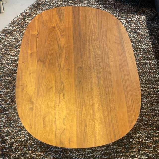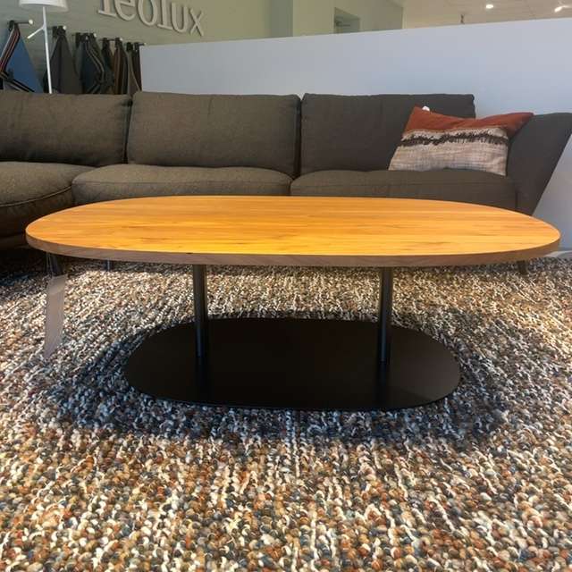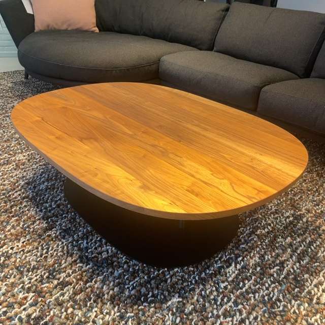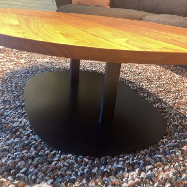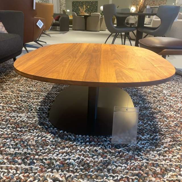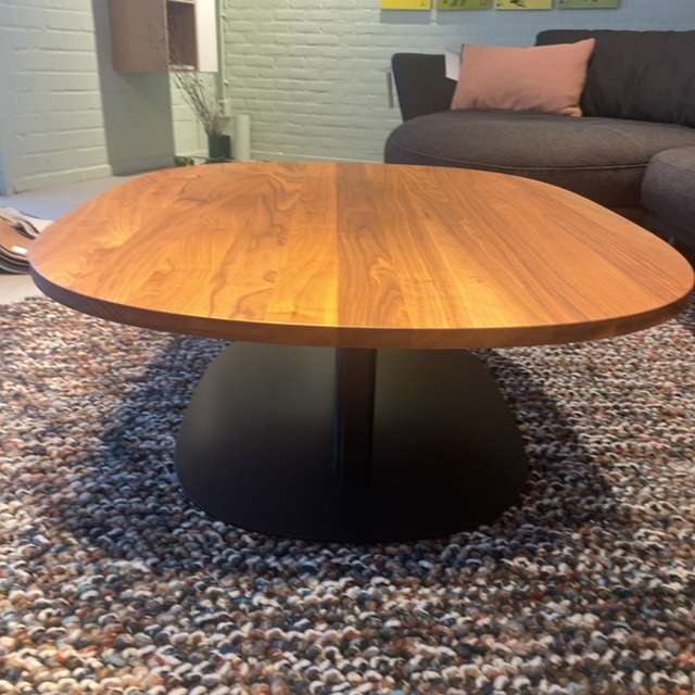 Mooie salontafel van Leolux. Tafel is uitgevoerd met afgeronde hoeken en een noten blad, beits naturel M2100 mat gelakt, frame in Epoxy E2200.