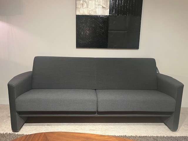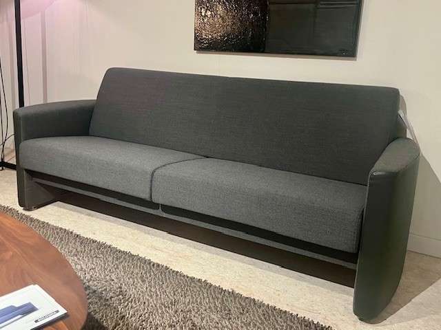 Bank Bologna van Lookline heeft een verstelbare zitting en is 214 cm breed. De bekleding is donkergrijd Fiord met accenten leer op de arm.