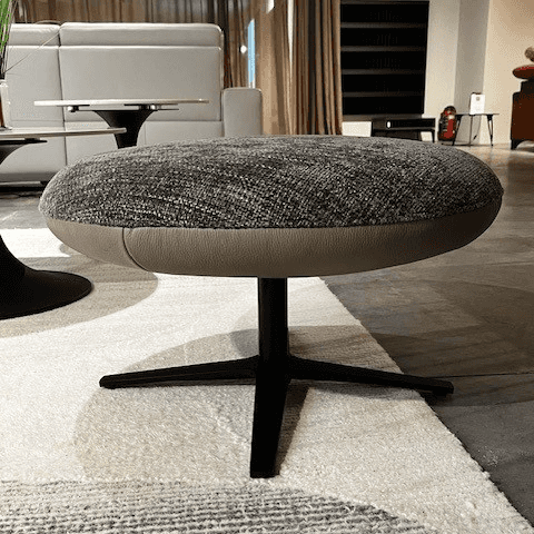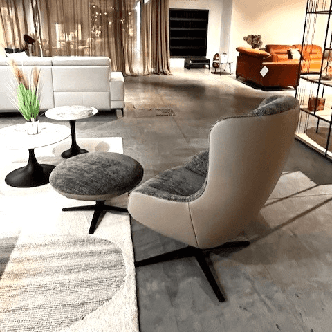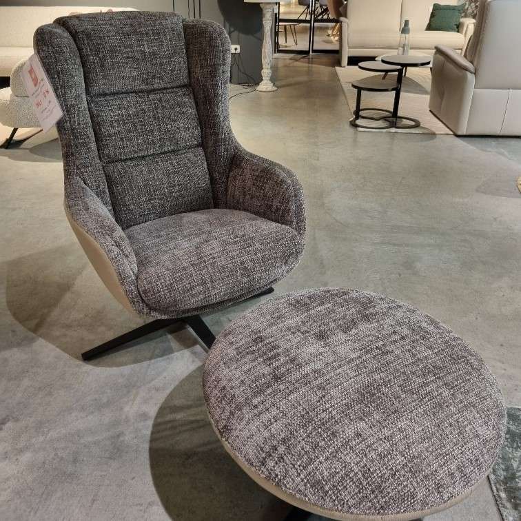 Fauteuil Gilbert van de Belgische zitmeubelfabrikant Mecam is verkrijgbaar in diverse maten en kleuren (zowel in stof als in leder). De hoge rug zorgt voor een perfecte ondersteuning en het zitcomfort is werkelijk zalig. Een fauteuil om in weg te dromen ! Wil je je benen laten rusten, bestel dan de poef in dezelfde uitvoering. Wij geven nu 30% korting op ons showroommodel incl. Ronde voetbank in dezelfde superzachte, bruine stof. De buitenzijde van de romp is bekleed met leder (taupe). Dit zorgt voor een mooi contrast. De ronde voetbank heeft exact dezelfde look : bovenaan stof en onderaan leder. Deze set ziet eruit als nieuw (zonder gebruikssporen) en kan snel bij jou thuis staan. De getoonde prijs is een meeneemprijs.