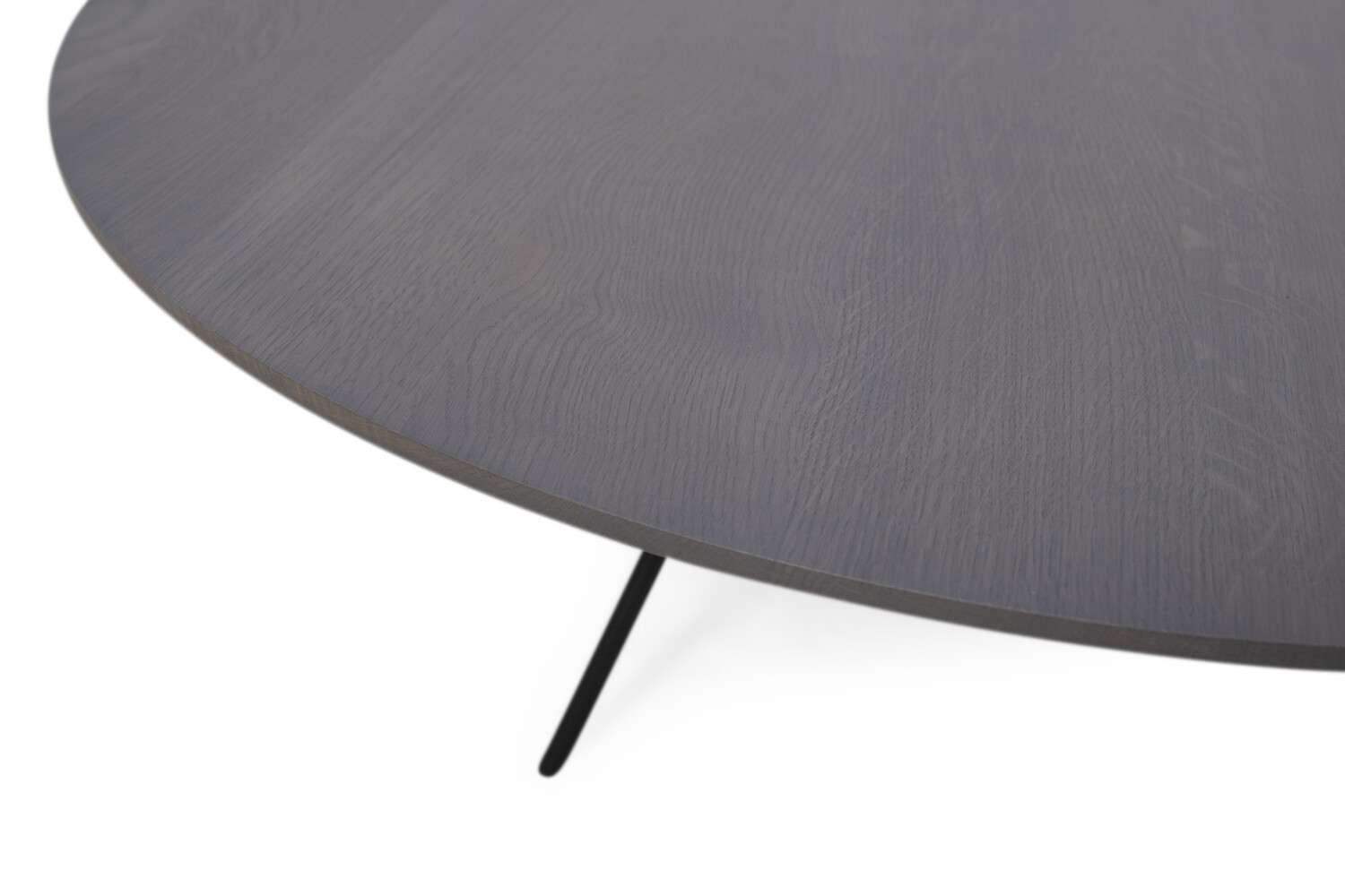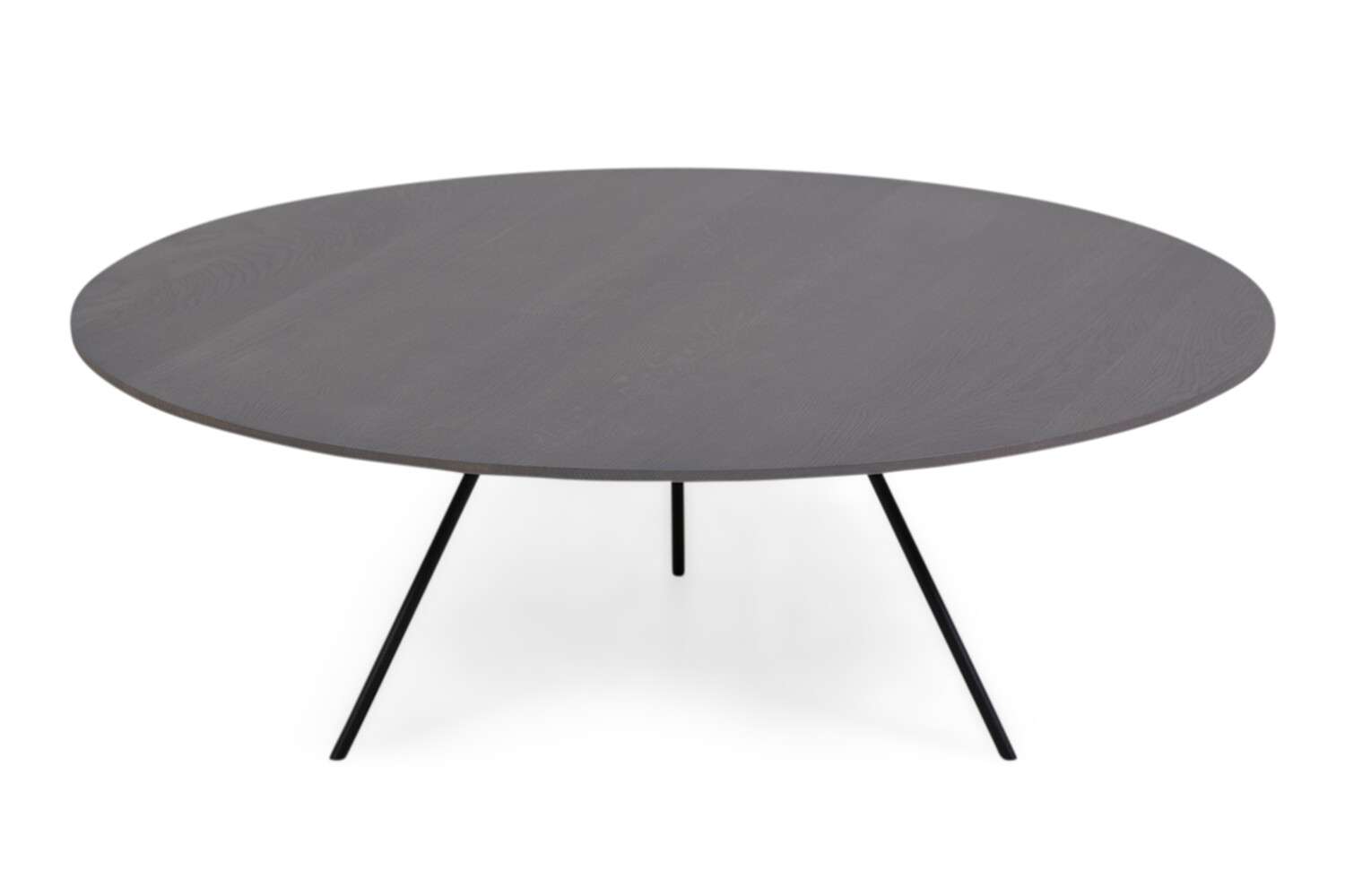 De Metaform DP salontafel heeft een afmeting van Ø 100 x 35cm en heeft een blad in eiken grey wash ultramat, en staat op zwarte poten in keralak De getoonde afbeeldingen zijn de werkelijke weergave van het product.