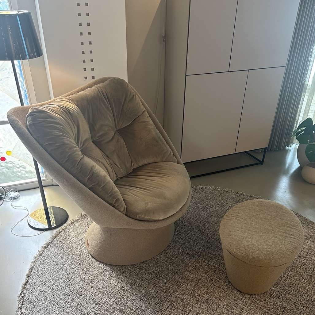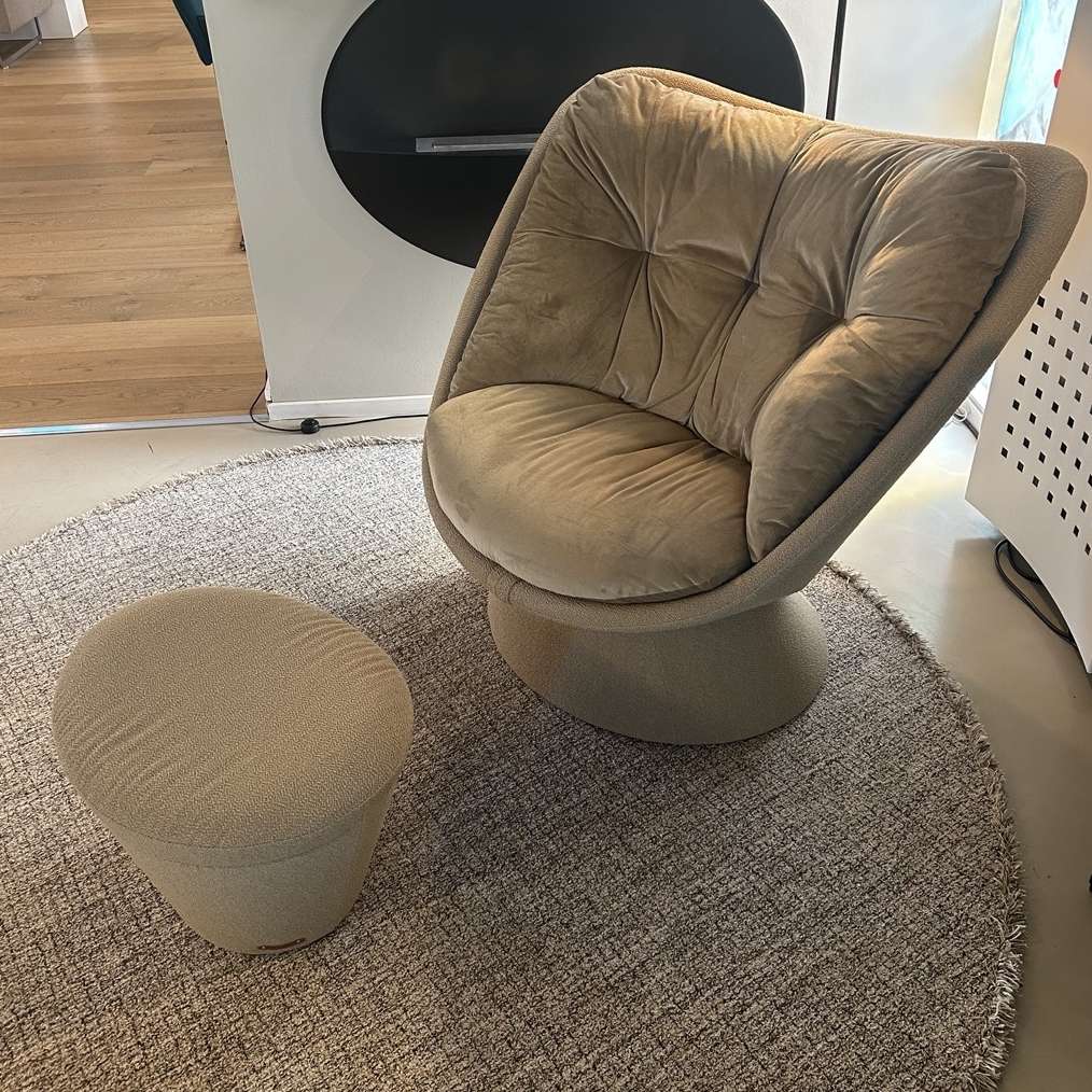 Montis Fabian relaxfauteuil & poef, buitenzijde uitgevoerd in stof Burrano kleur 50 (pg30), binnenzijde in stof de Ploeg Alto 99 (pg30).