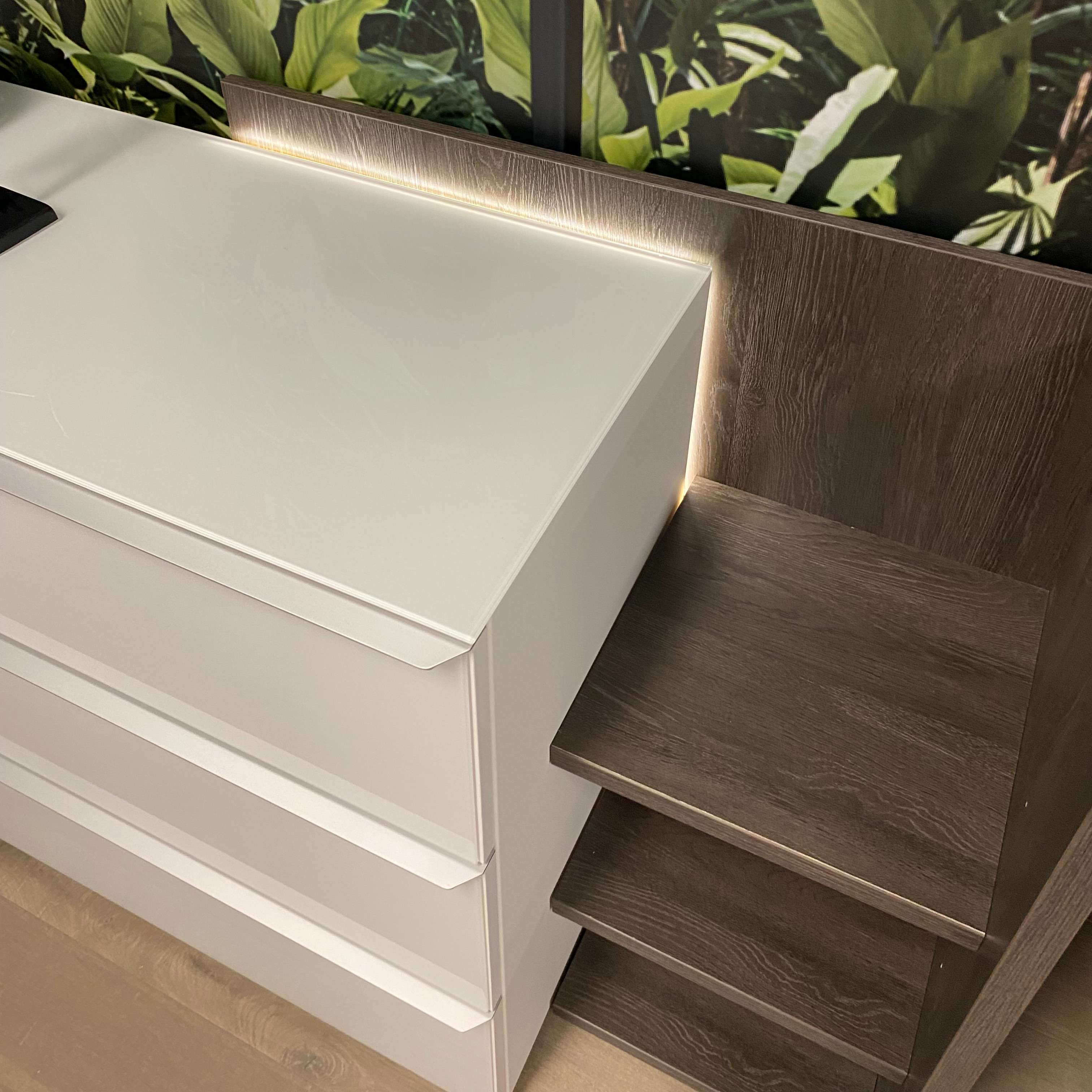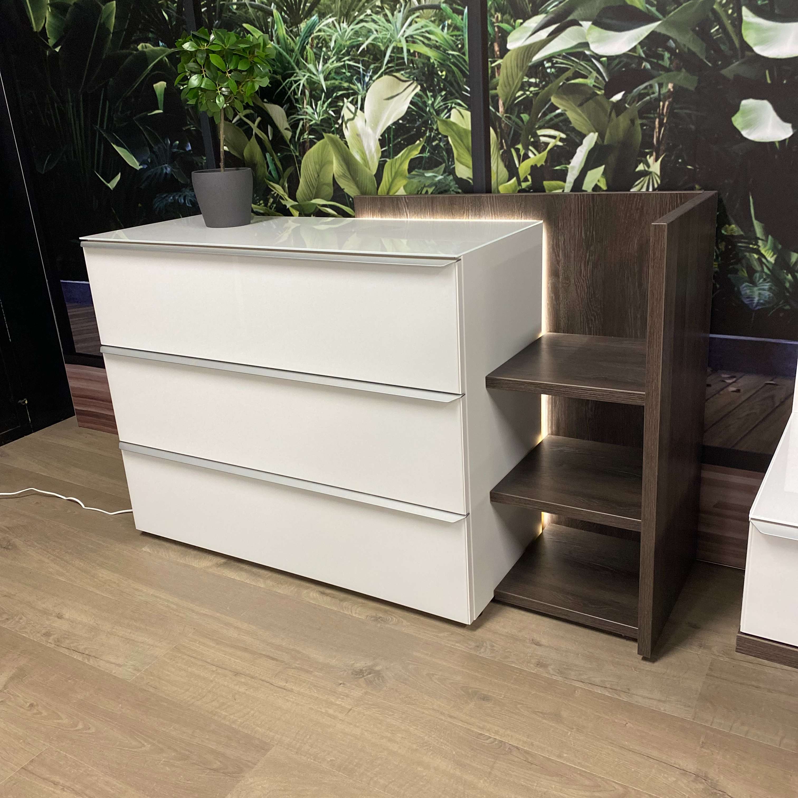 1x Eventueel met bijpassende Commode 100cm breed 79cm hoog en 42cm diep. De commode past perfect bij het ledikant, met een boekenplank aan de zijkant, glasplaat bovenop ter bescherming en ook Ledverlichting achter de commode voor extra sfeer! Alles met soft close uiteraard. (tegen meerprijs)