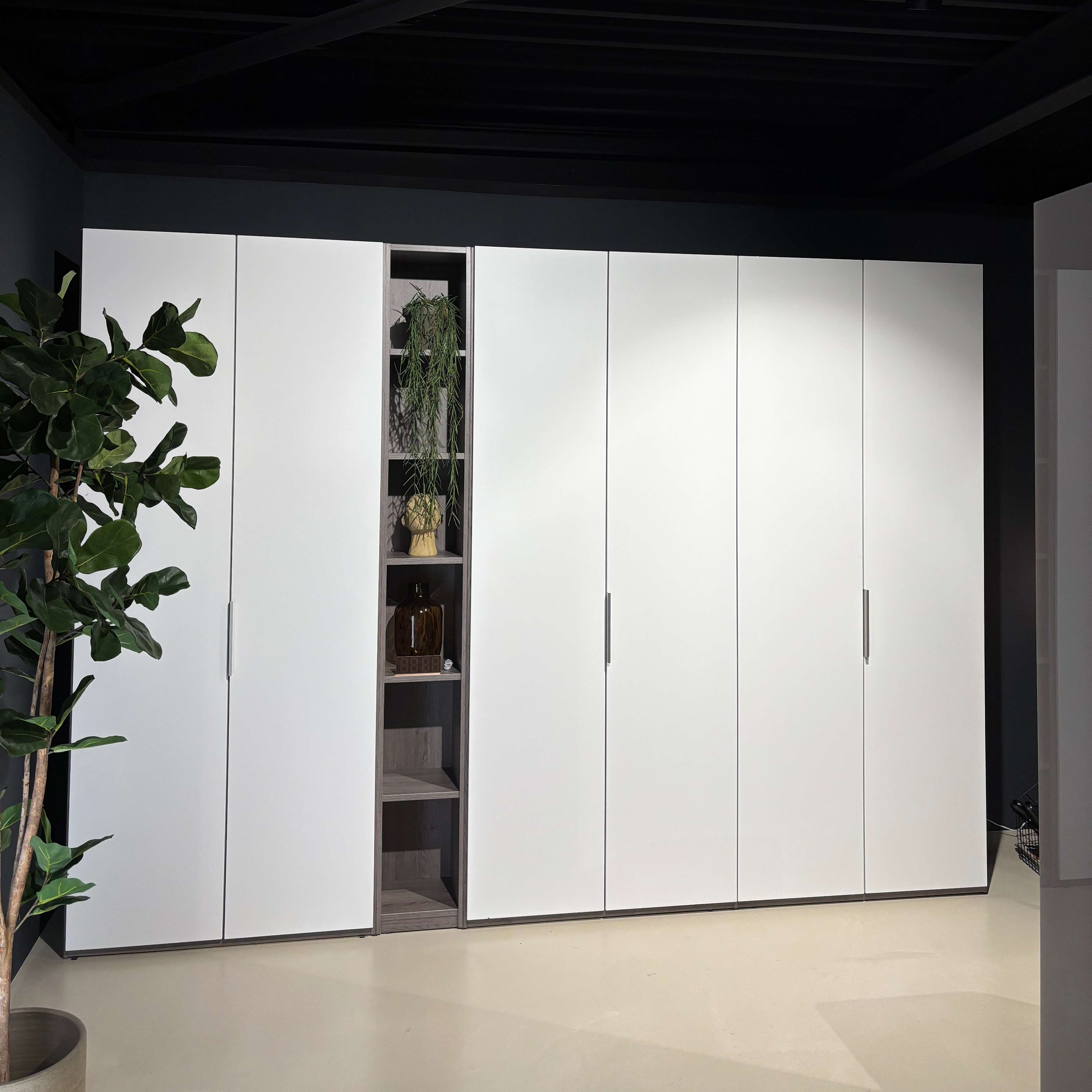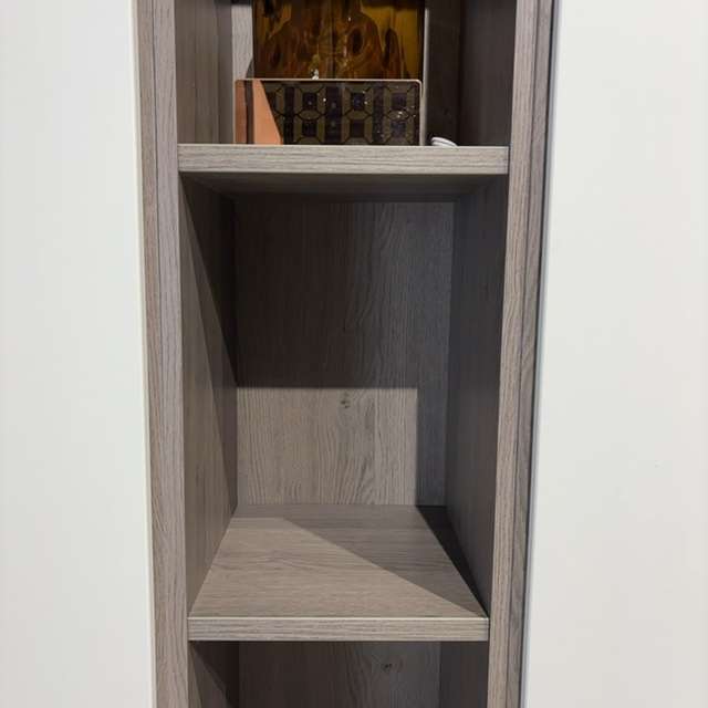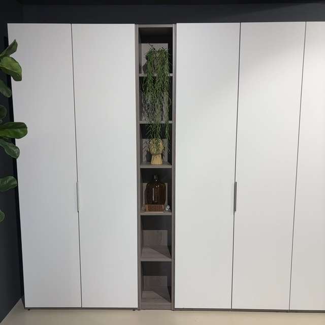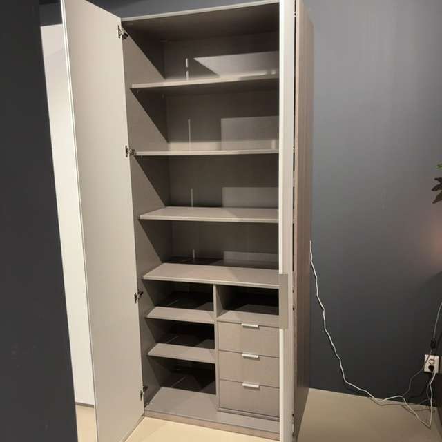 Deze Horizont 100 linnenkast is uitgevoerd in de kleurcombinatie eiken zilvergrijs/wit (mat). De boekenplankmodule in het front van de kast geeft een speels effect enis naar eigen inzicht in te delen. Deze kast is full option uitgevoerd met o.a. ladenblokken, verlichting in de kast en een vakverdeling. De combinatie van de maatvoering i.c.m. alle opties zorgen voor bijzonder bruikbare veelzijdige kast. Naast alle opties zijn er ook nog een aantal roeden geplaatst voor veel hangruimte.