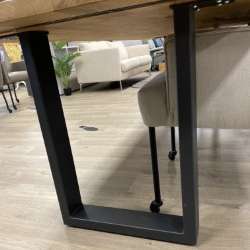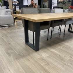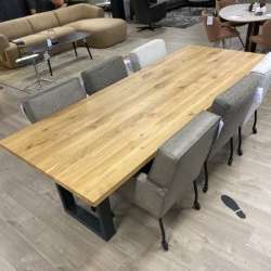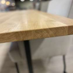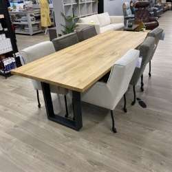 Deze prachtige en degelelijke eiken eettafel mag bij ons uit de showroom. Wij willen plaats maken voor een andere vorm blad.