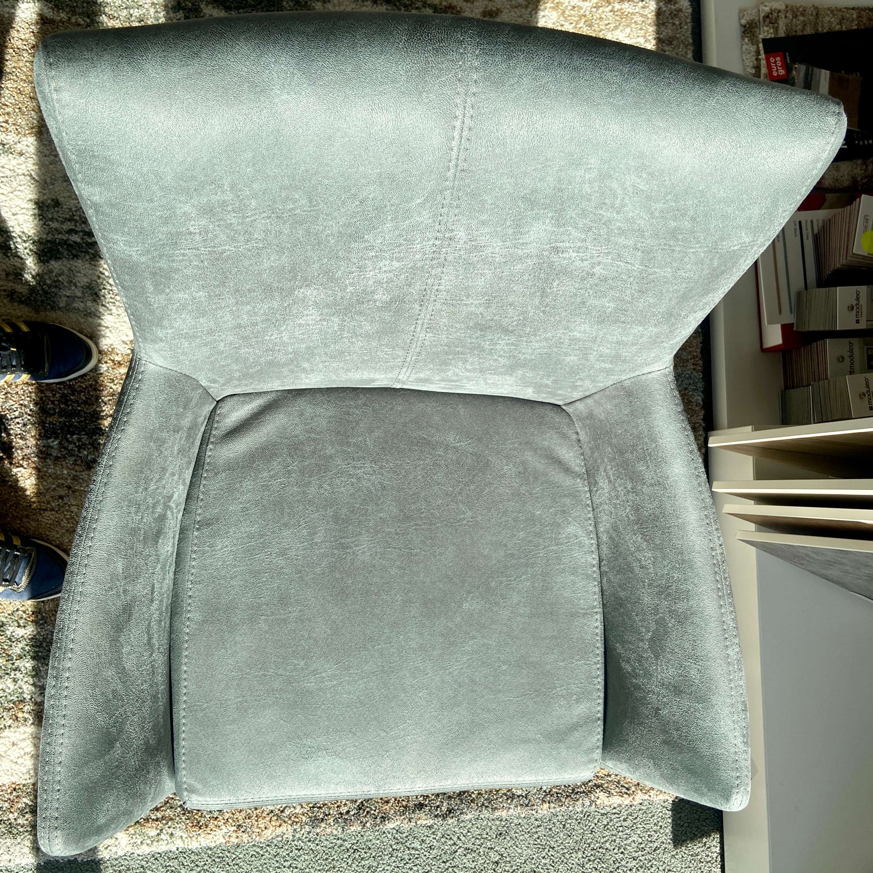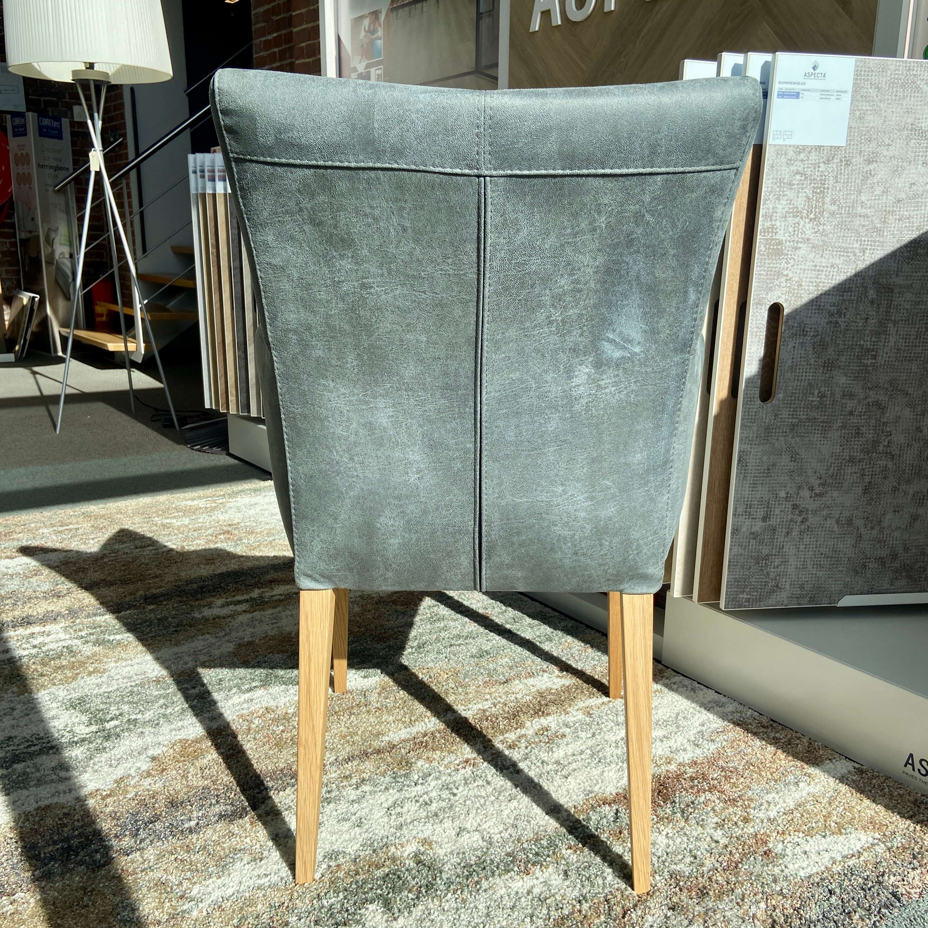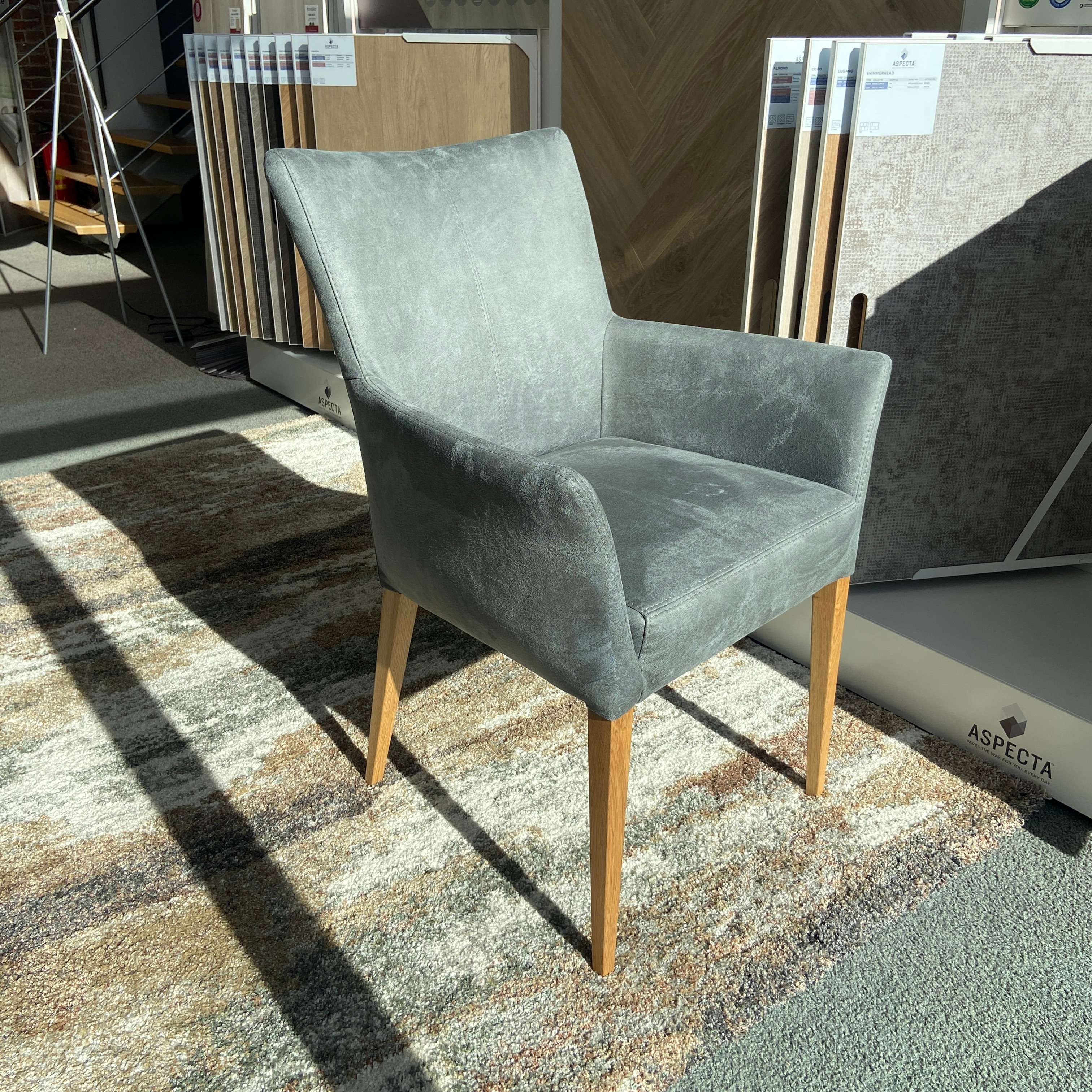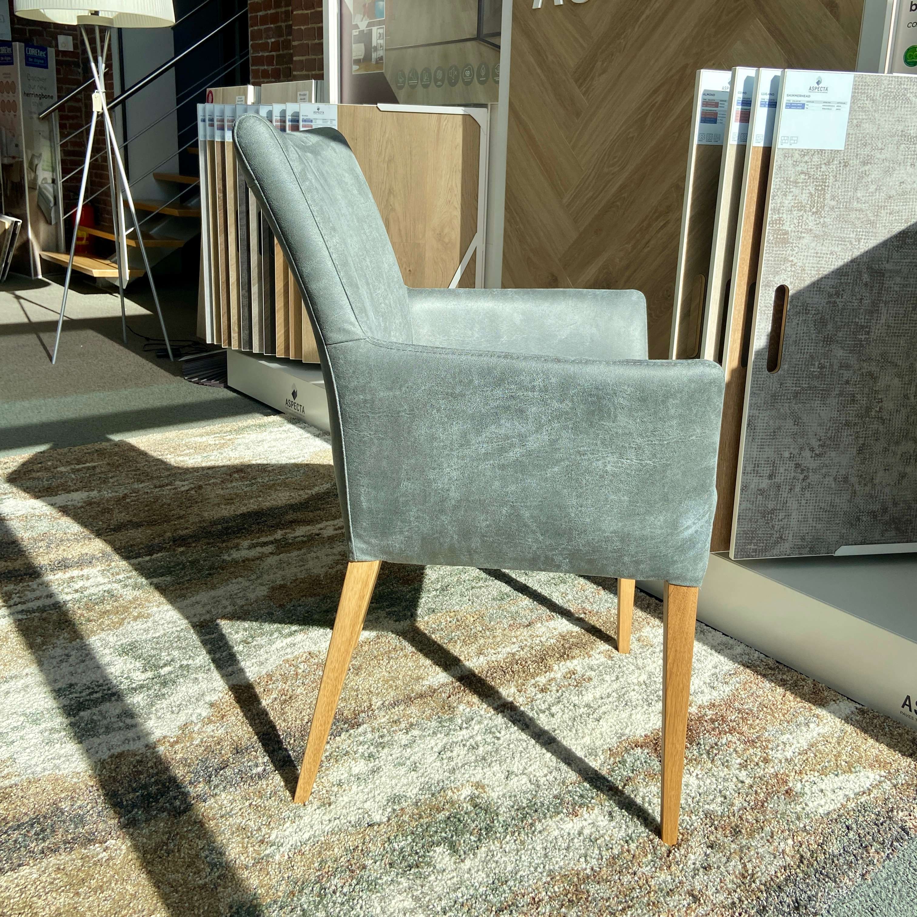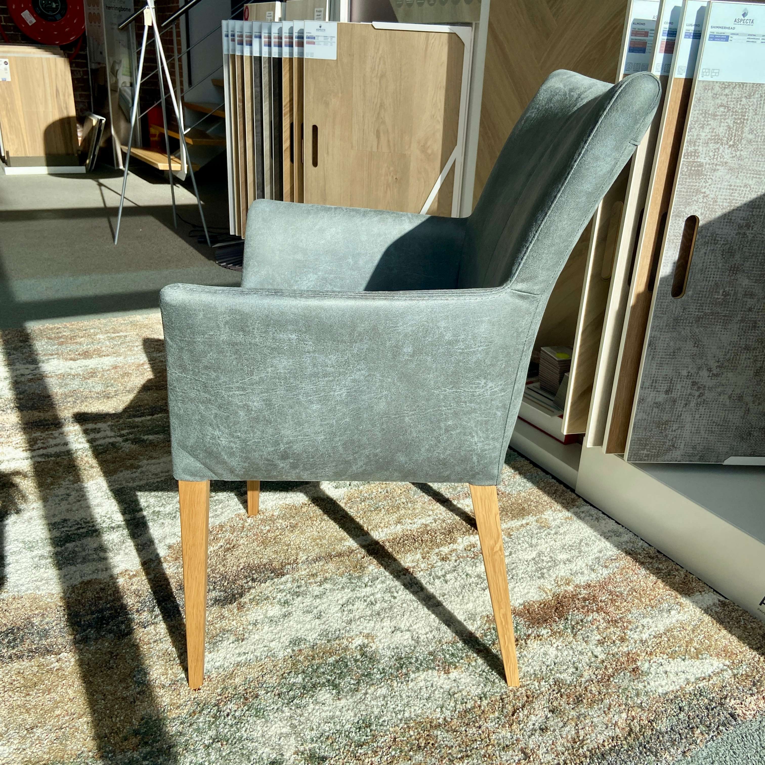 Mooie grijsgroene stoel met armleuning en houten poten. Kleur blank eiken. Stof microleder. Voelt zacht aan. Goede zit en hoge leuning voor een goede ondersteuning Van de rug. In bijpassende kleur is er ook een set van 4 stoelen zonder leuning te koop.