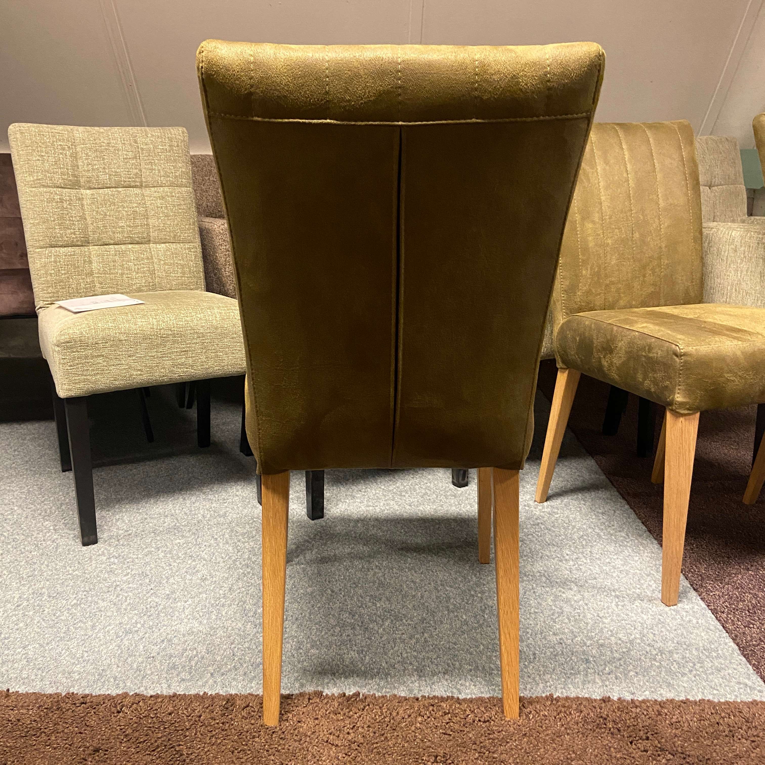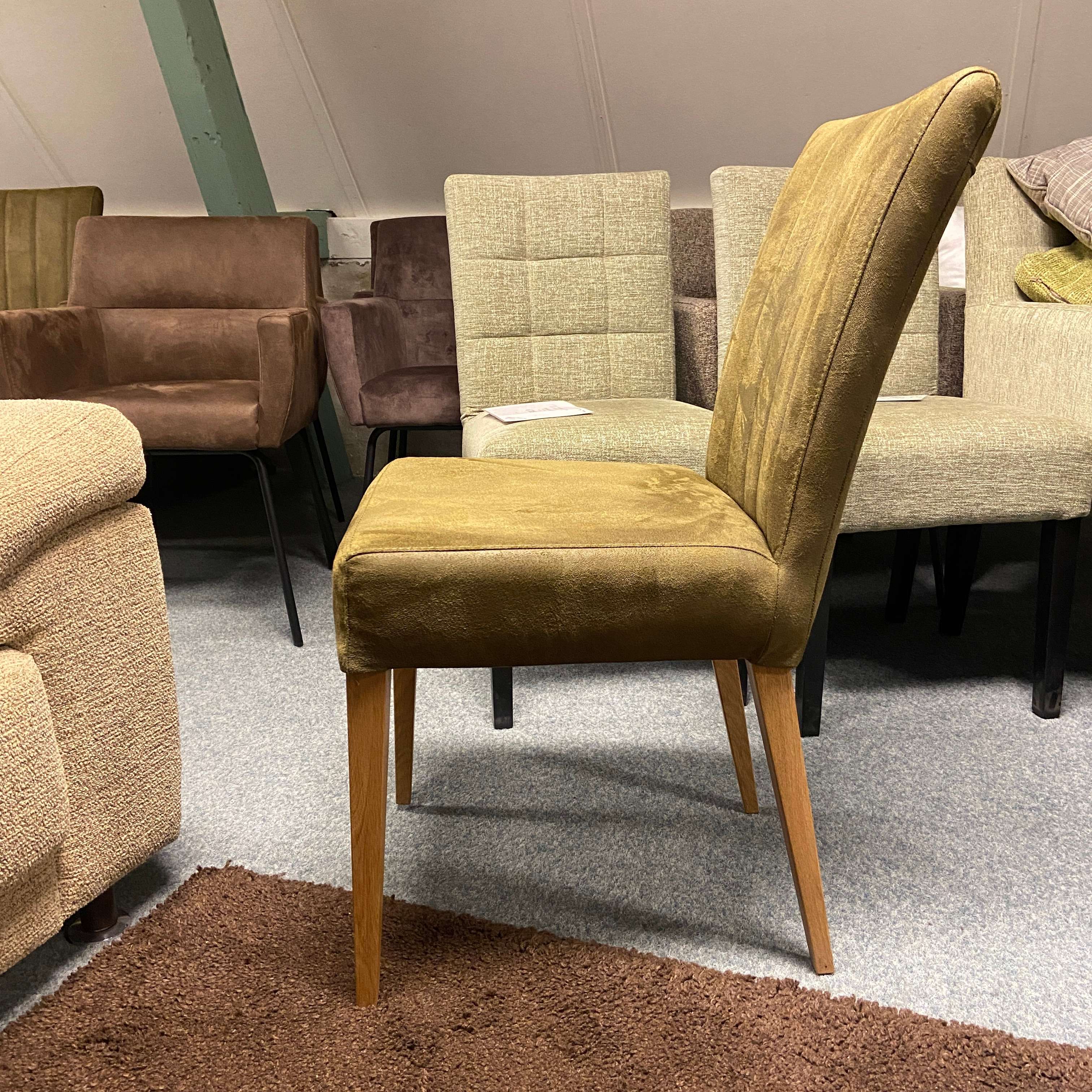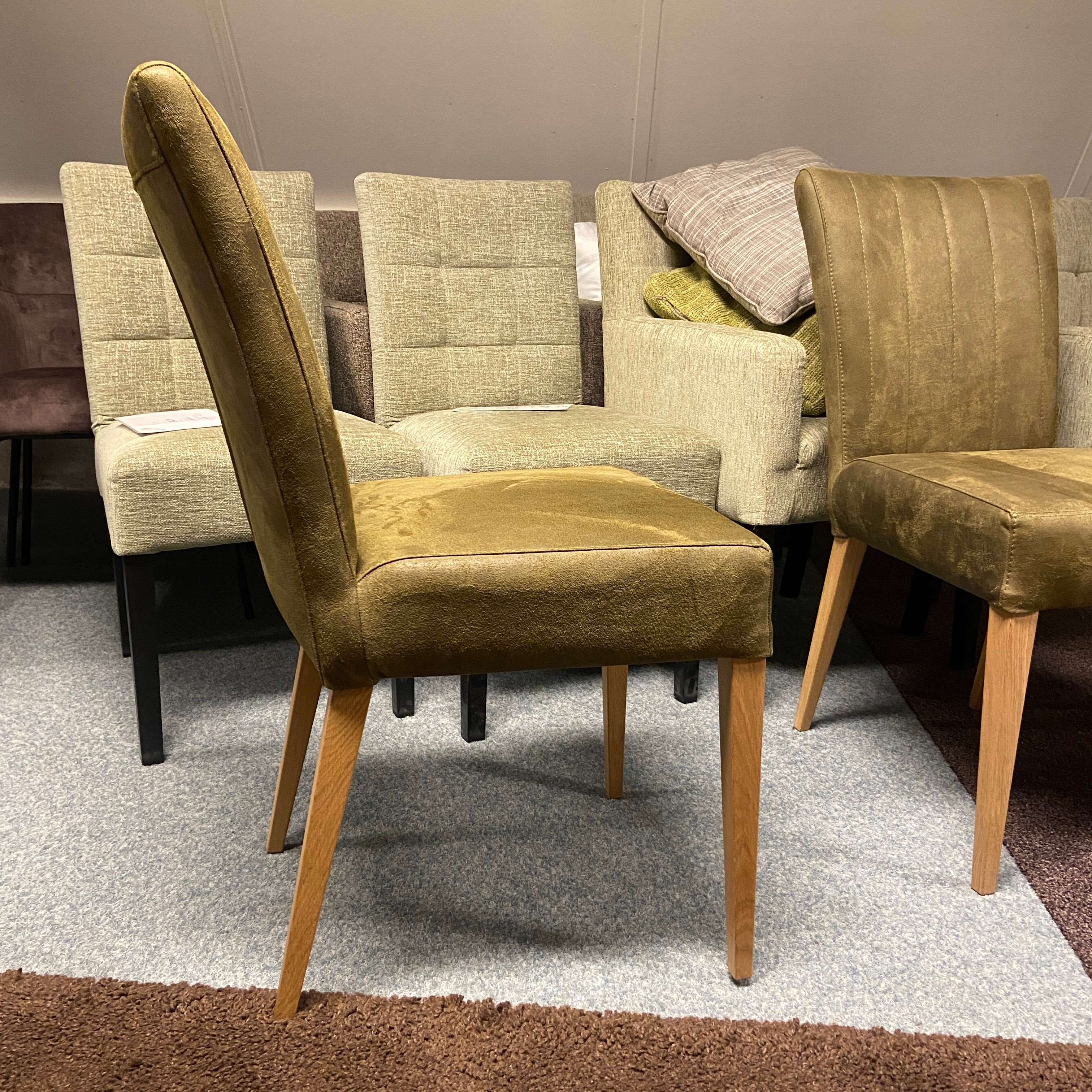 Lekker zitende groene eetkamerstoelen. Nemen niet veel ruimte in, passen in elk interieur met natuurlijke uitstraling. Stof voelt zacht aan.