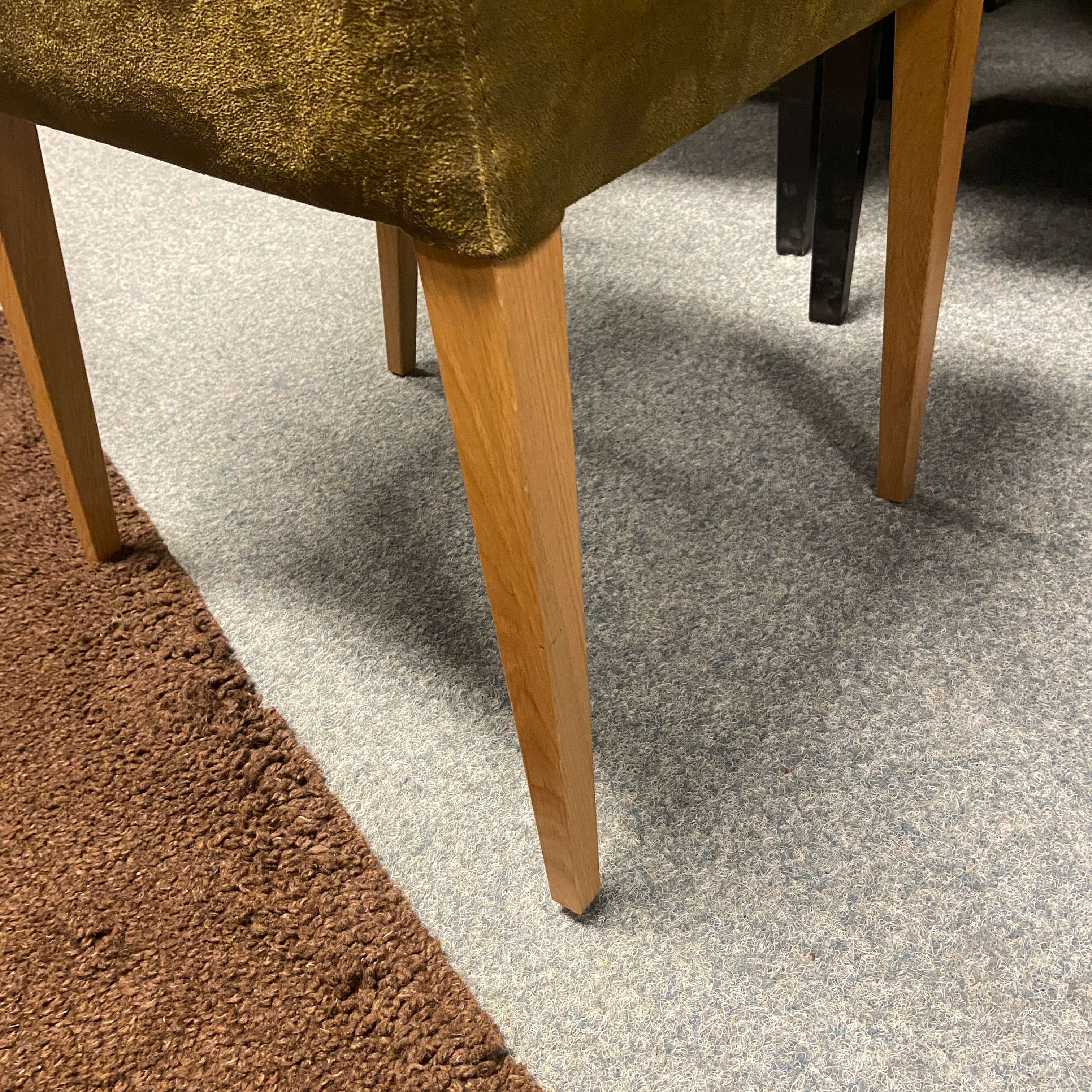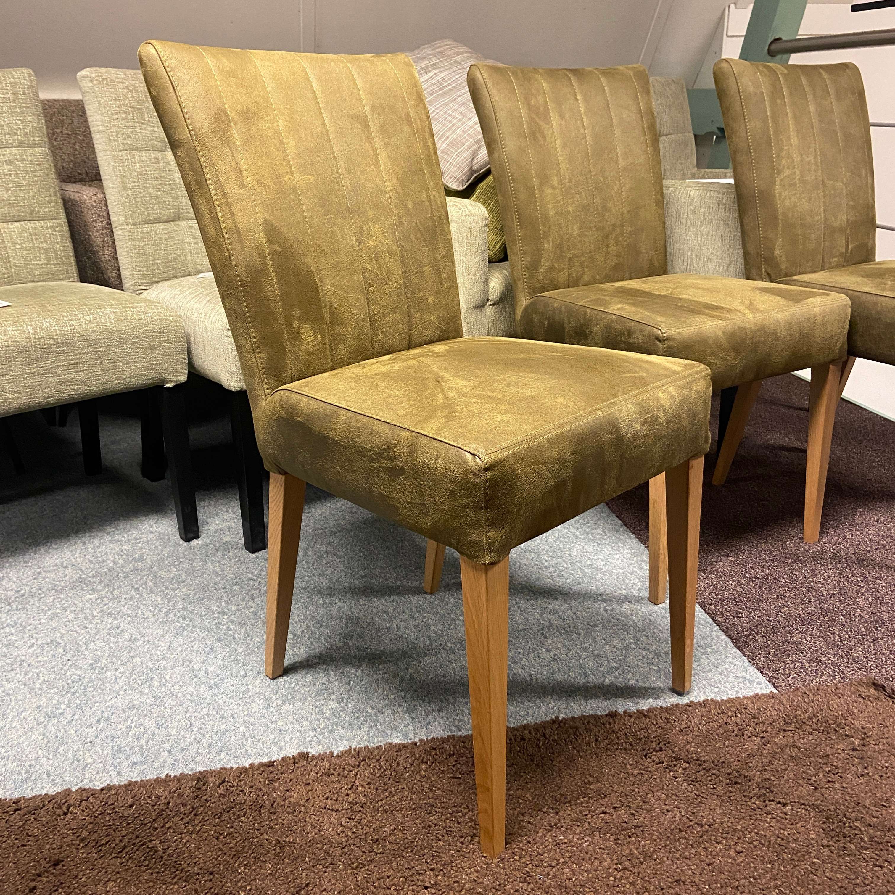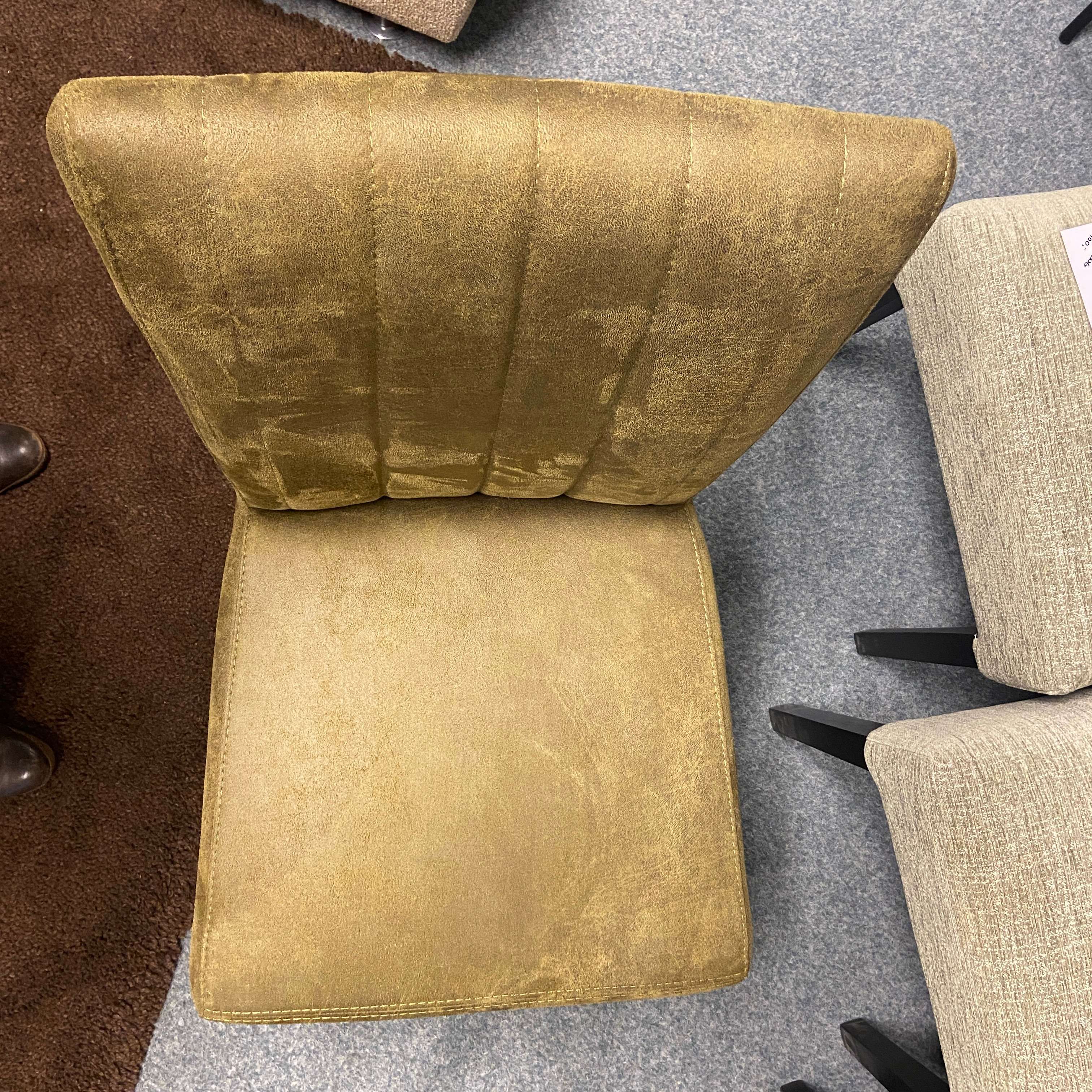 Lekker zitende groene eetkamerstoelen. Nemen niet veel ruimte in, passen in elk interieur met natuurlijke uitstraling. Stof voelt zacht aan.