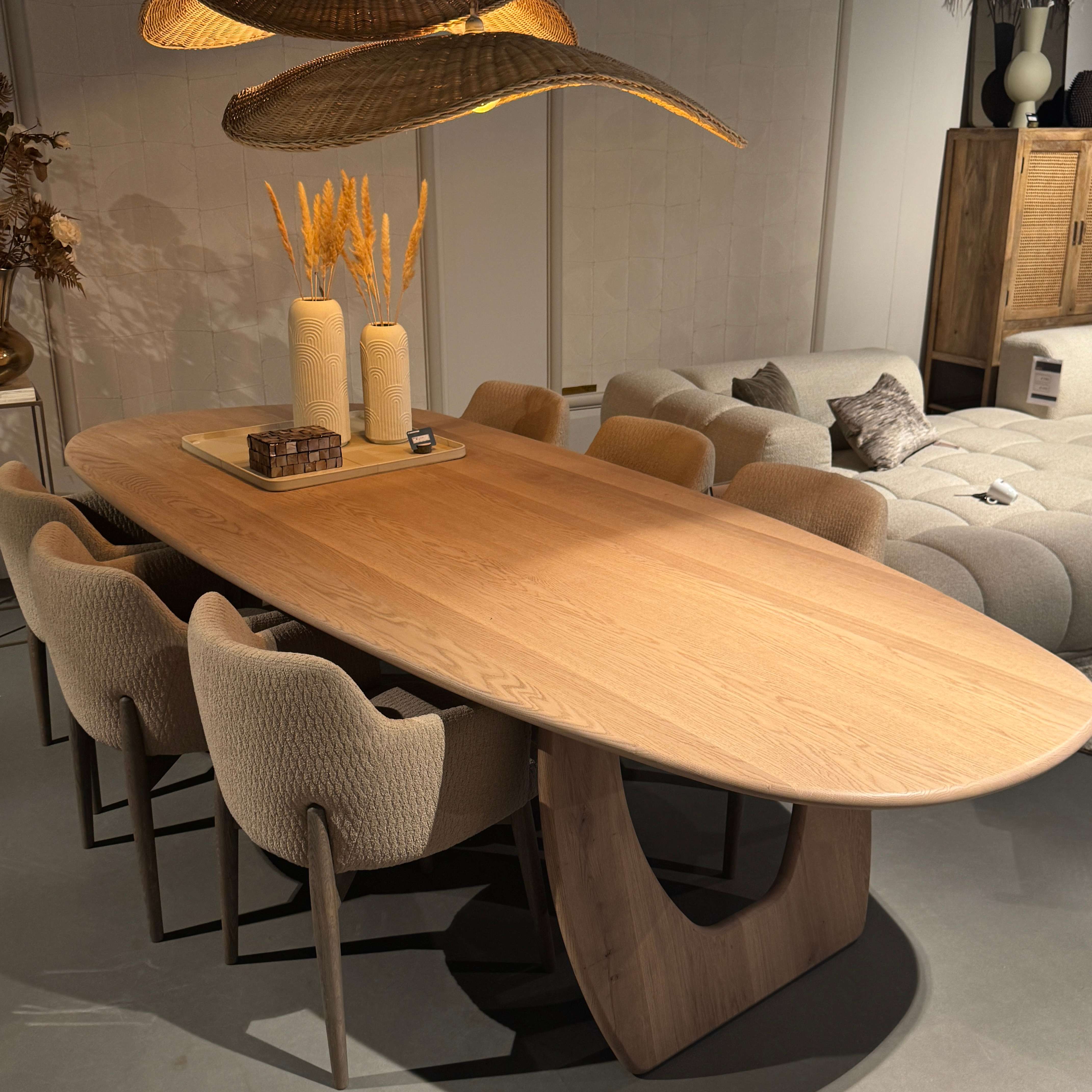 De bali eettafel is een uitgesproken stijlvol meubelstuk, vervaardigd uit hoogwaardig eikenhout, en kenmerkt zich door zijn elegante, organische vormgeving. Het blad heeft een vloeiende, eigentijdse lijn die perfect samengaat met een modern of hotel chique interieur.