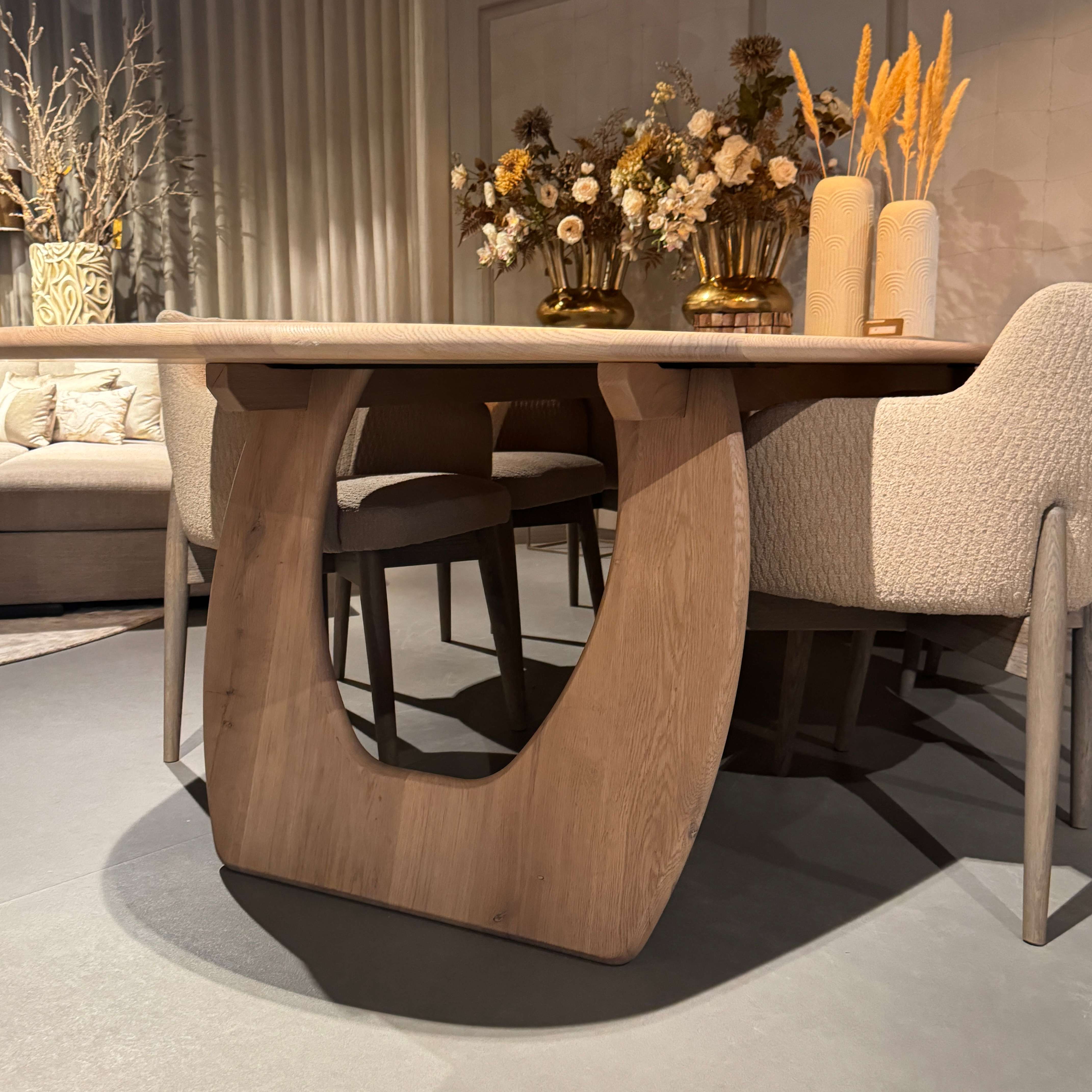 Wat deze tafel uniek maakt, is het bijzondere onderstel. De houten poten zijn geïnspireerd op klassieke U-poten, maar dan subtieler en verfijnder uitgevoerd. Dankzij de afgeronde hoeken en zachte lijnen sluiten ze naadloos aan op het organische blad en zorgen ze voor een luchtige uitstraling perfect voor wie stijl en functionaliteit wil combineren.