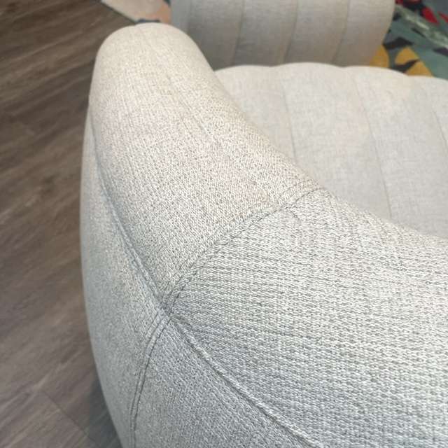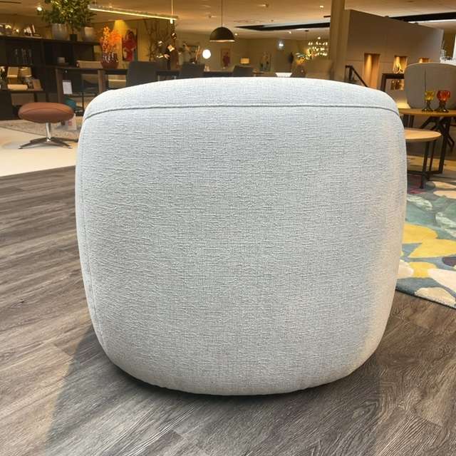 Fijne draaifauteuil van Pode met bijbehorende poef. Beide zijn uitgevoerd in stof Elva 137, light grey met stiksel in ton-sur-ton.