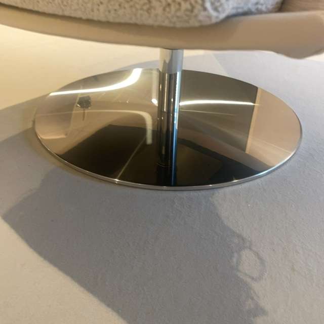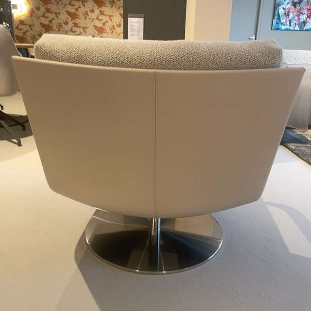 Fijne draaifauiteuil van Leolux met armleuningen. De fauteuil is voorzien van een duo stoffering, schaal in leer Raffino 918 Lynx, zitkussen in stof Mondo 020 bianco, stiksel ton-sur-ton. Voet is een schijfvoet, disc in rvs.