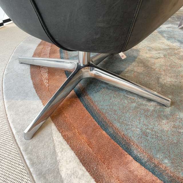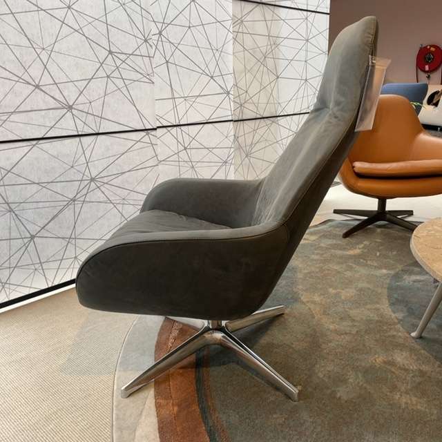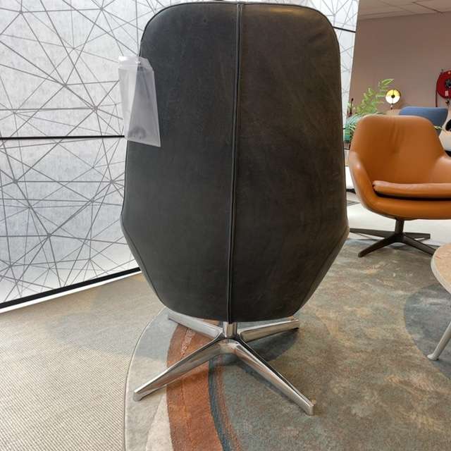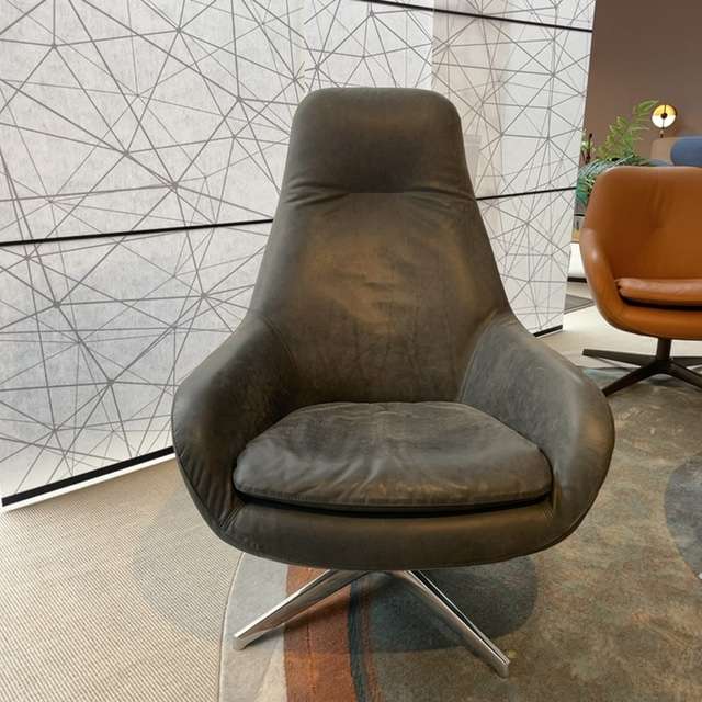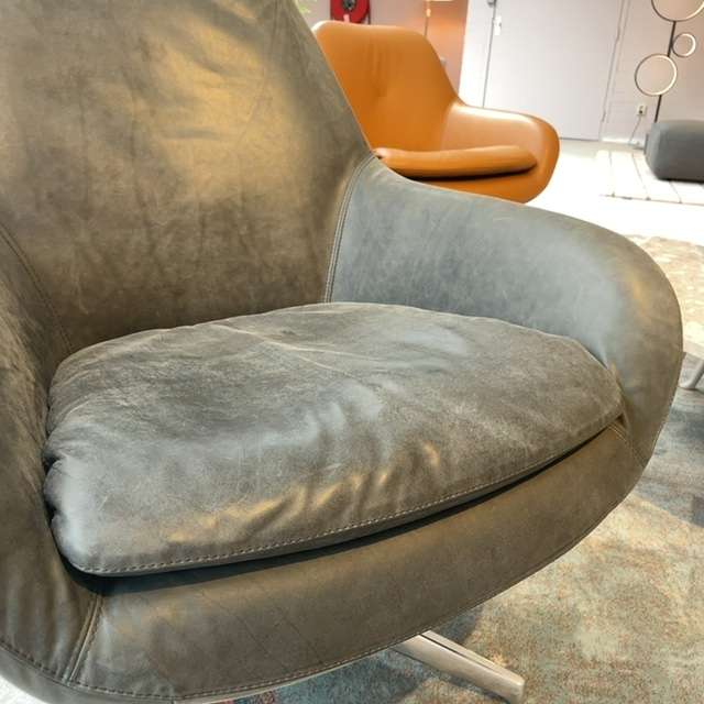 Mooie Sparkle fauteuil van pode. Fauteuil heeft een semi-los zitkussen en een hoge rug. Fauteuil is uitgevoerd in leer Neron 315 Sesame met stervoet Basiq alu gepolijst.