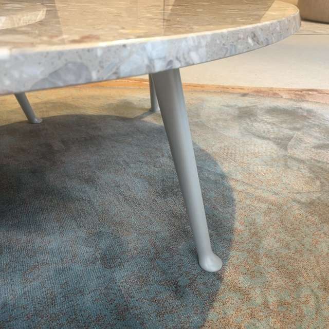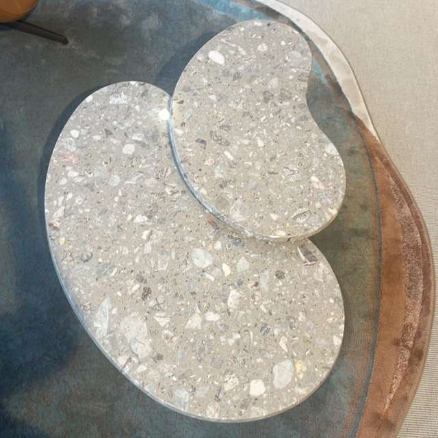 Mooie organische salotafelset van Pode. Beide tafels zijn uitgevoerd met een blad van marmercomposiet, kleur Fior di Pesco met een epoxy onderstel, E3700 anodic silk.