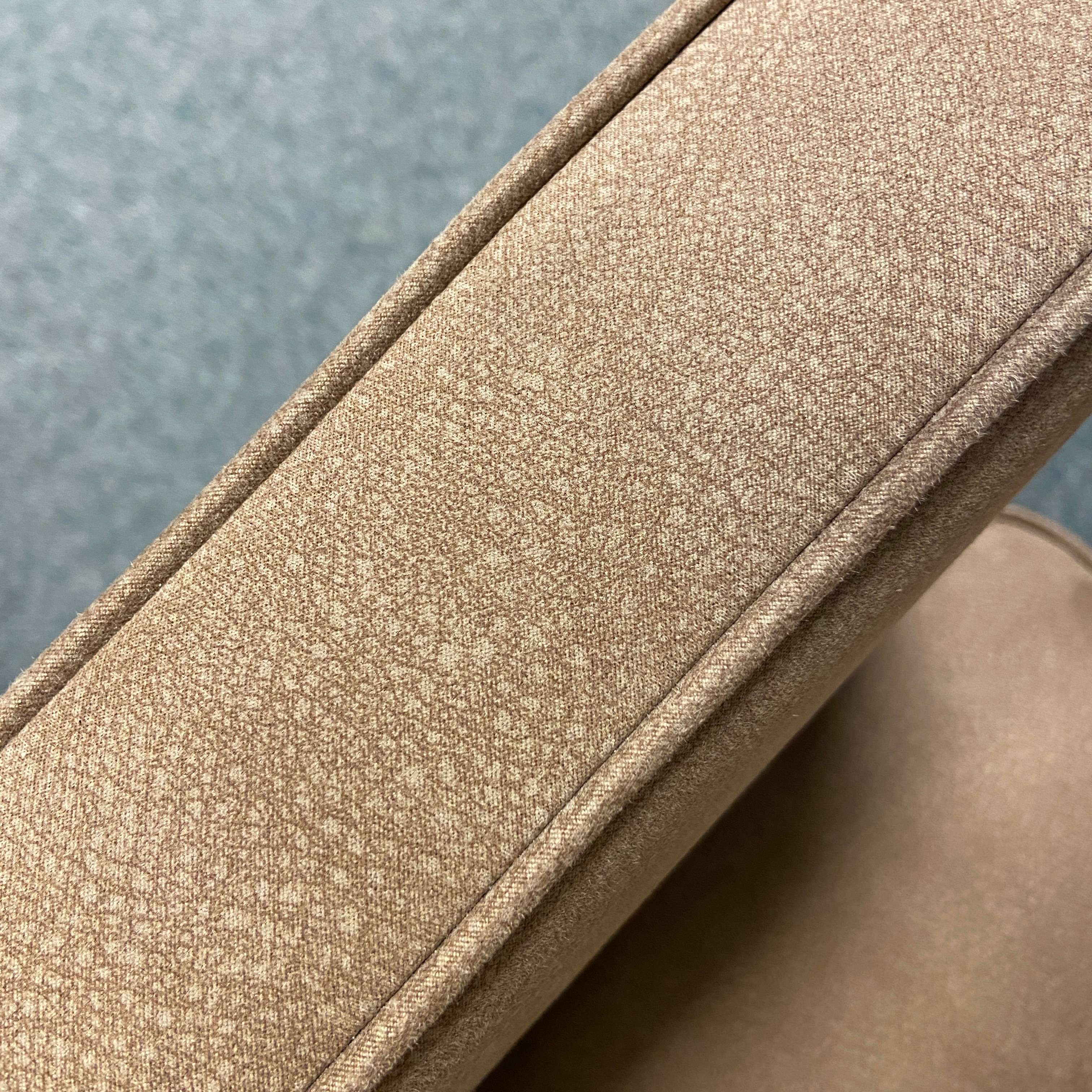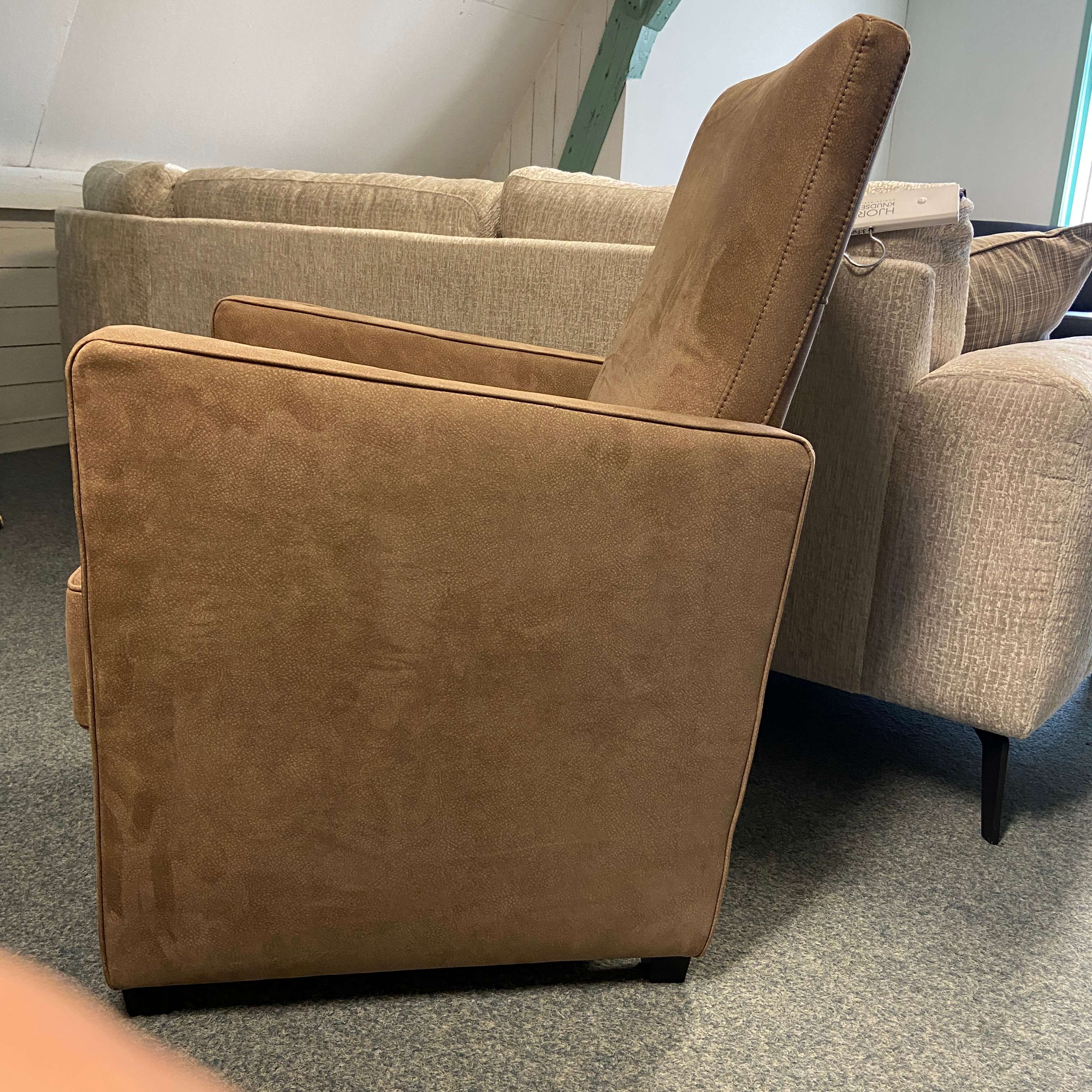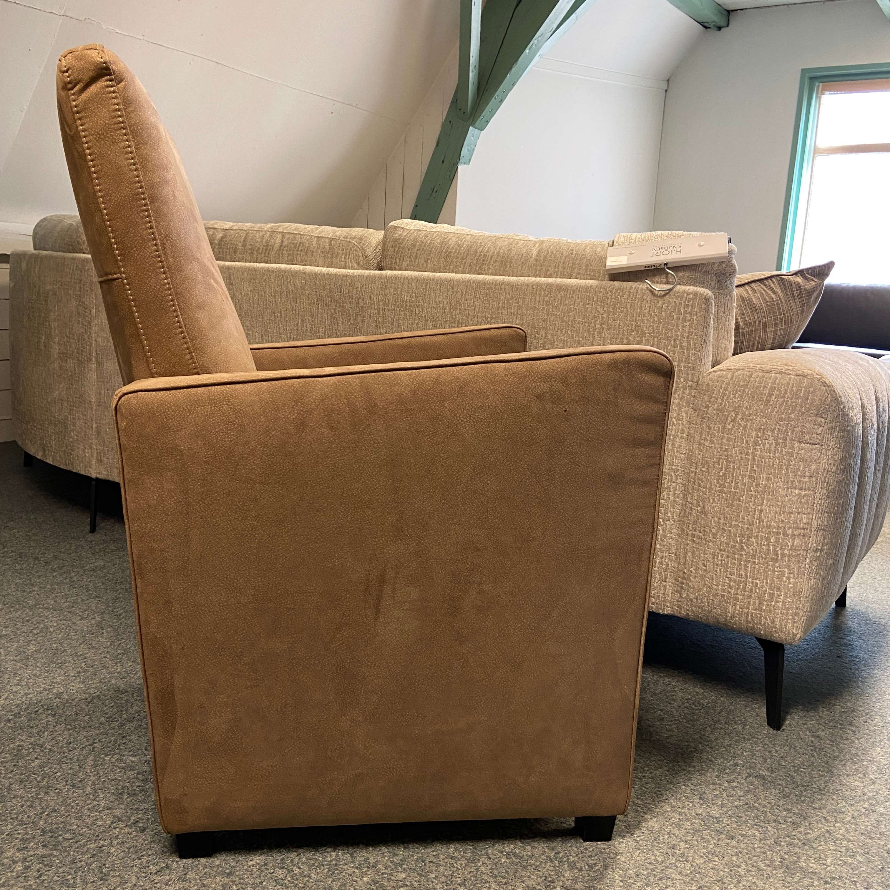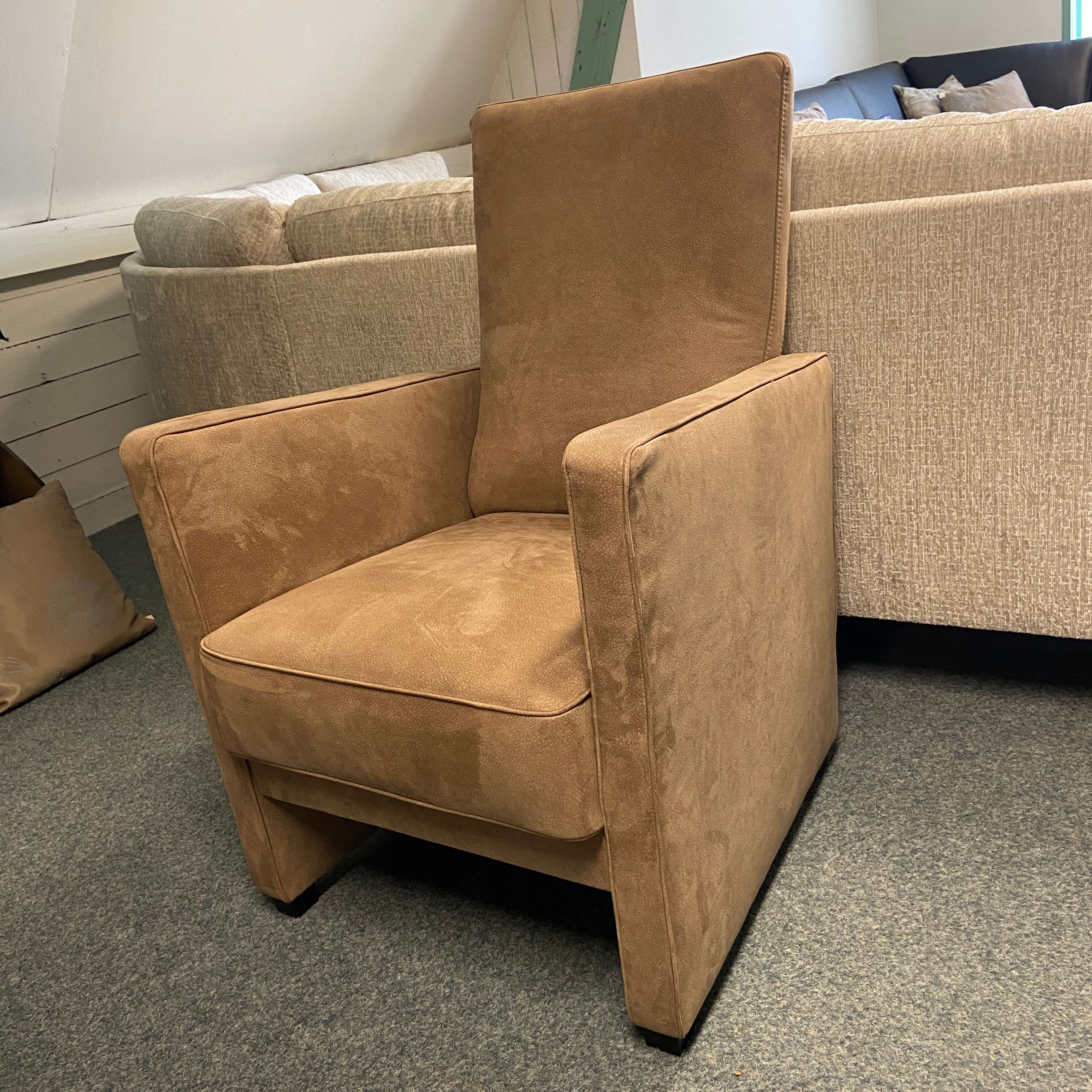 Mooie degelijk fauteuls in een beige/zalmroze kleur. Zwarte houten poot. Staat in elk modern interieur goed!