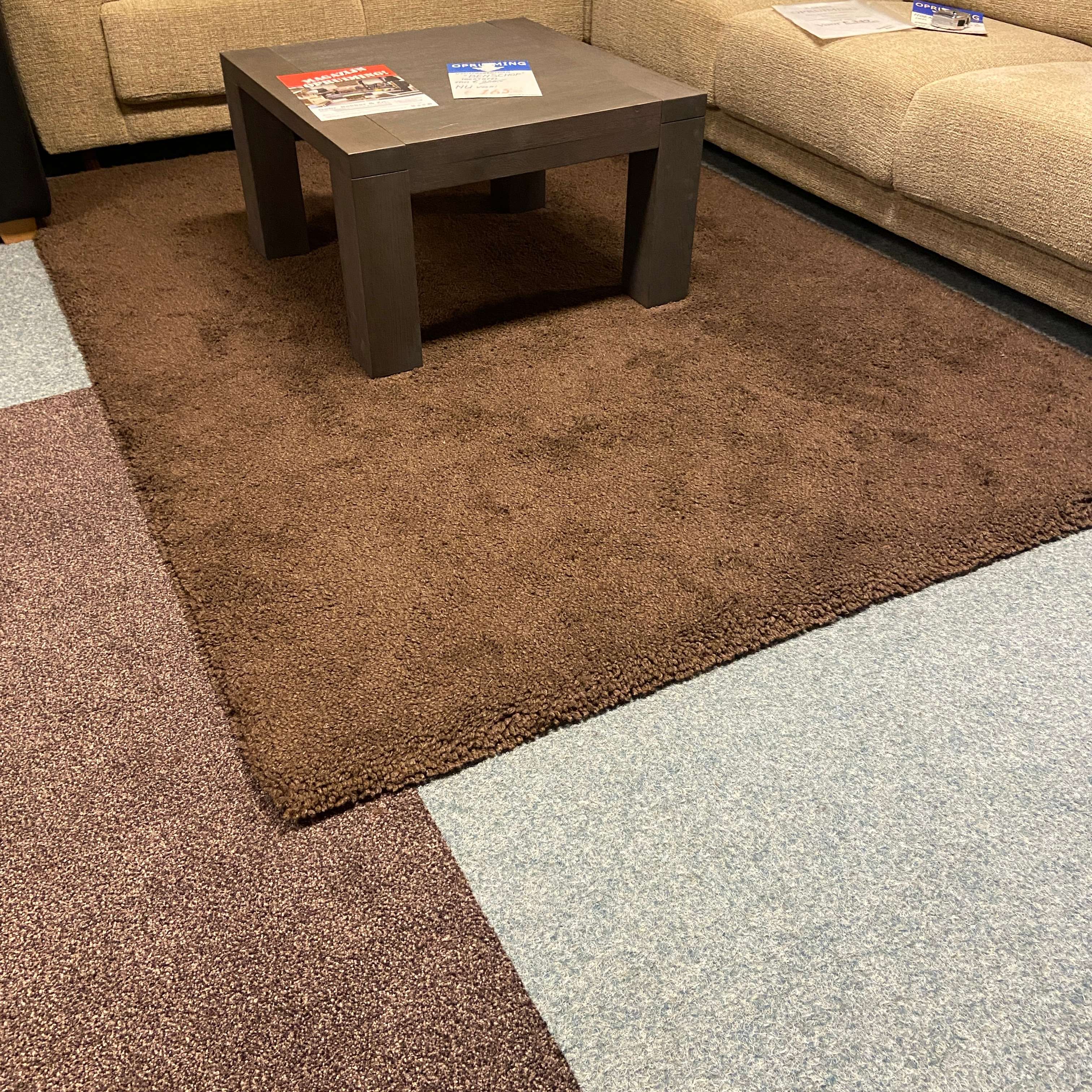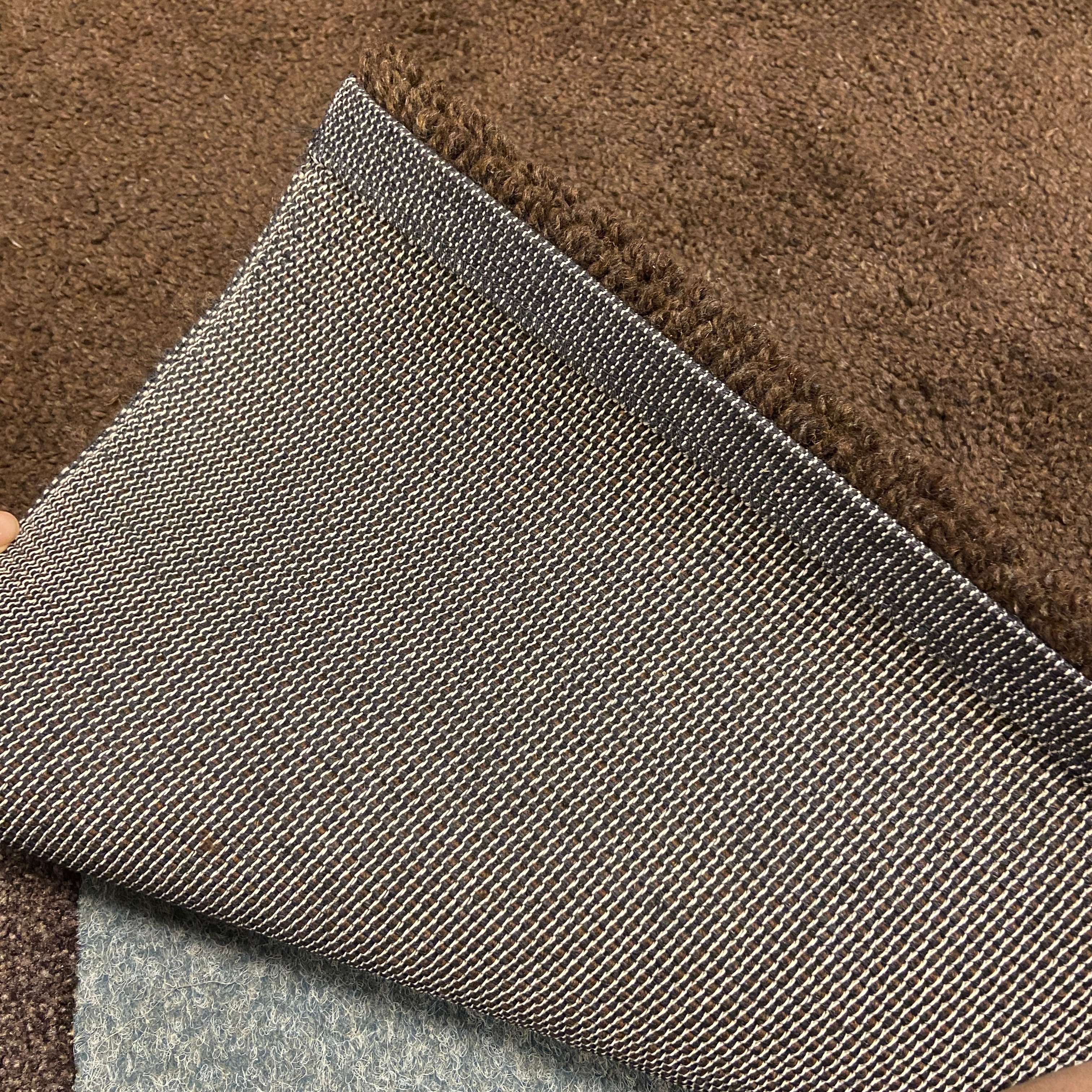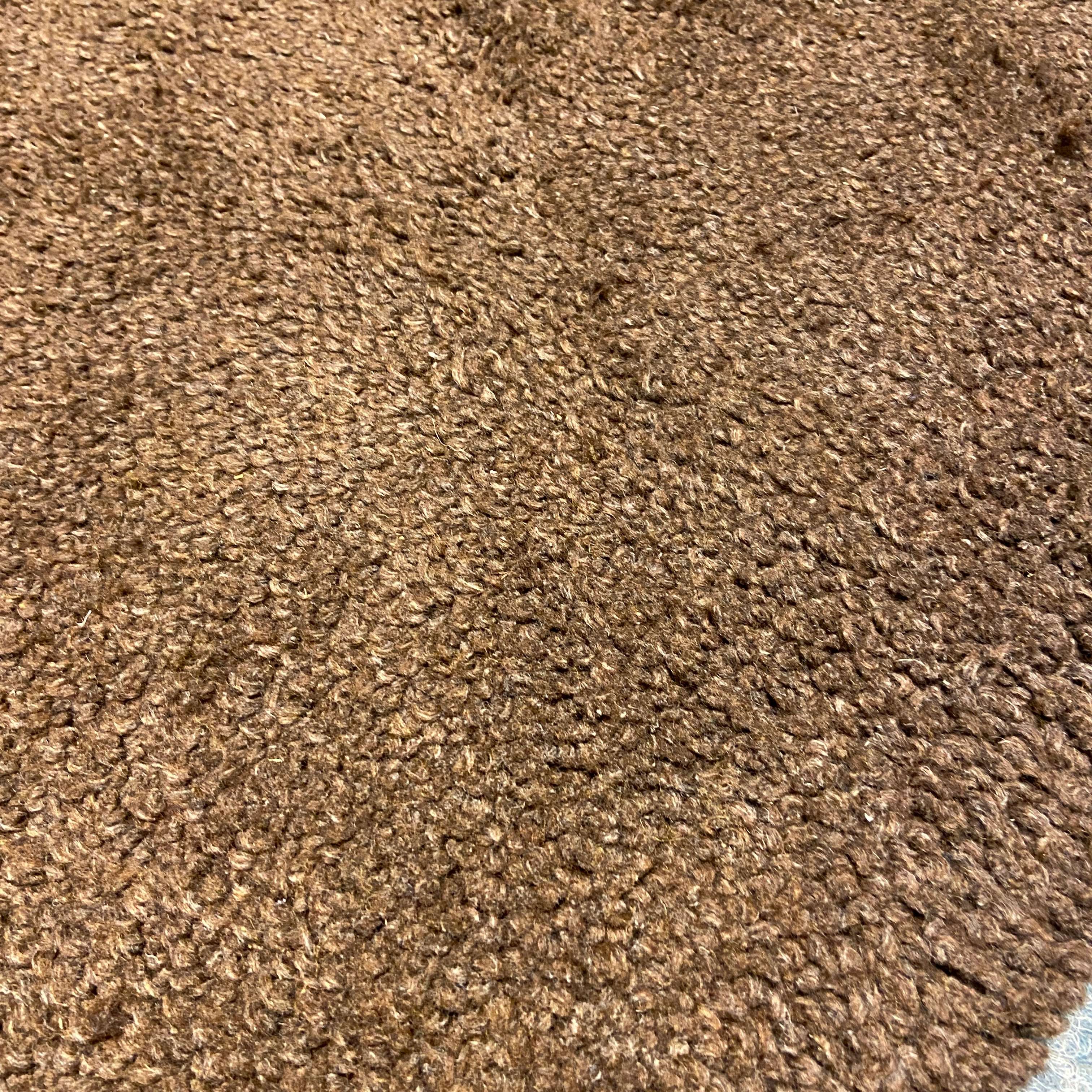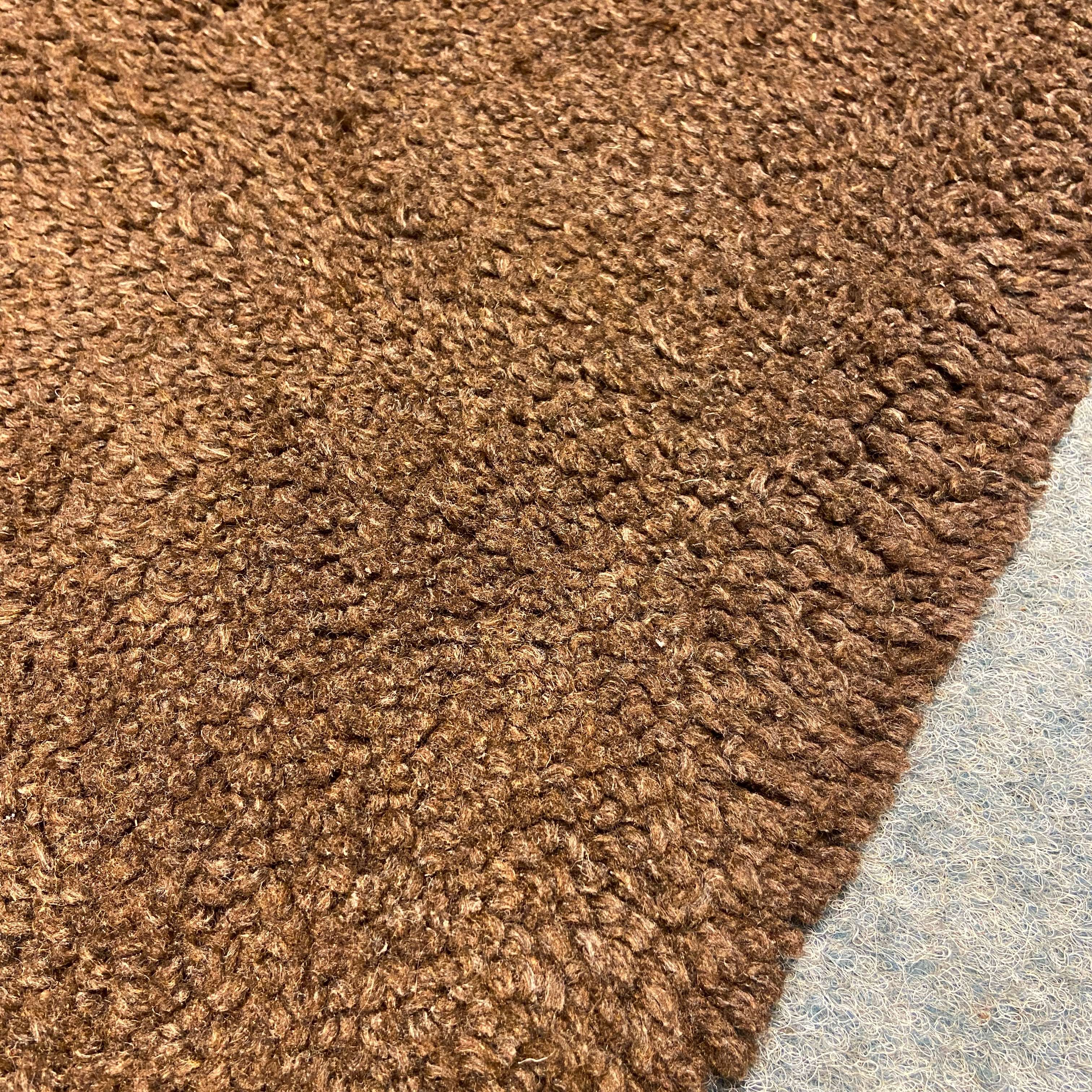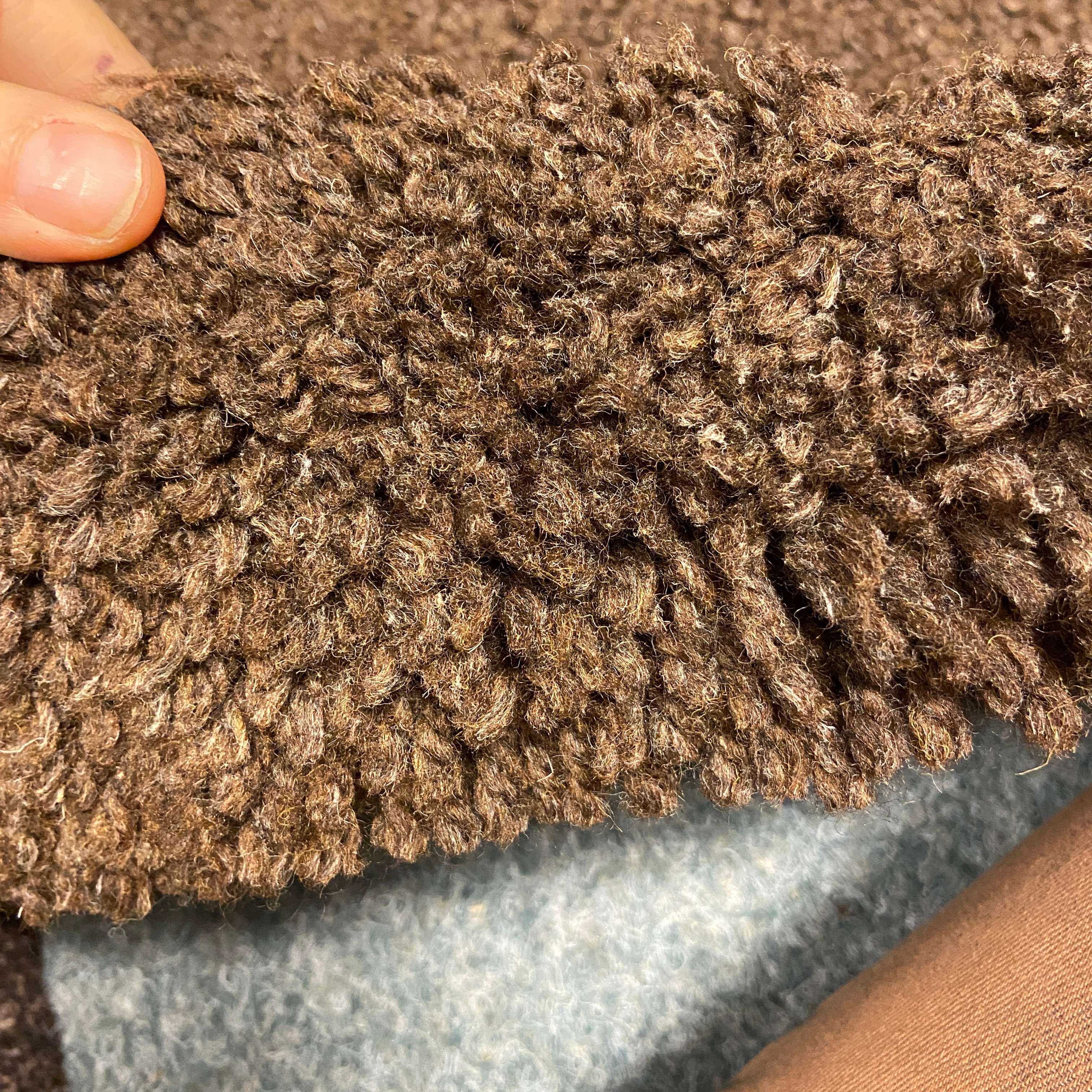 Donkerbruik karpet. Hoogpollig. Heeft een gemeleerd lichtbruin draadje erdoorheen.