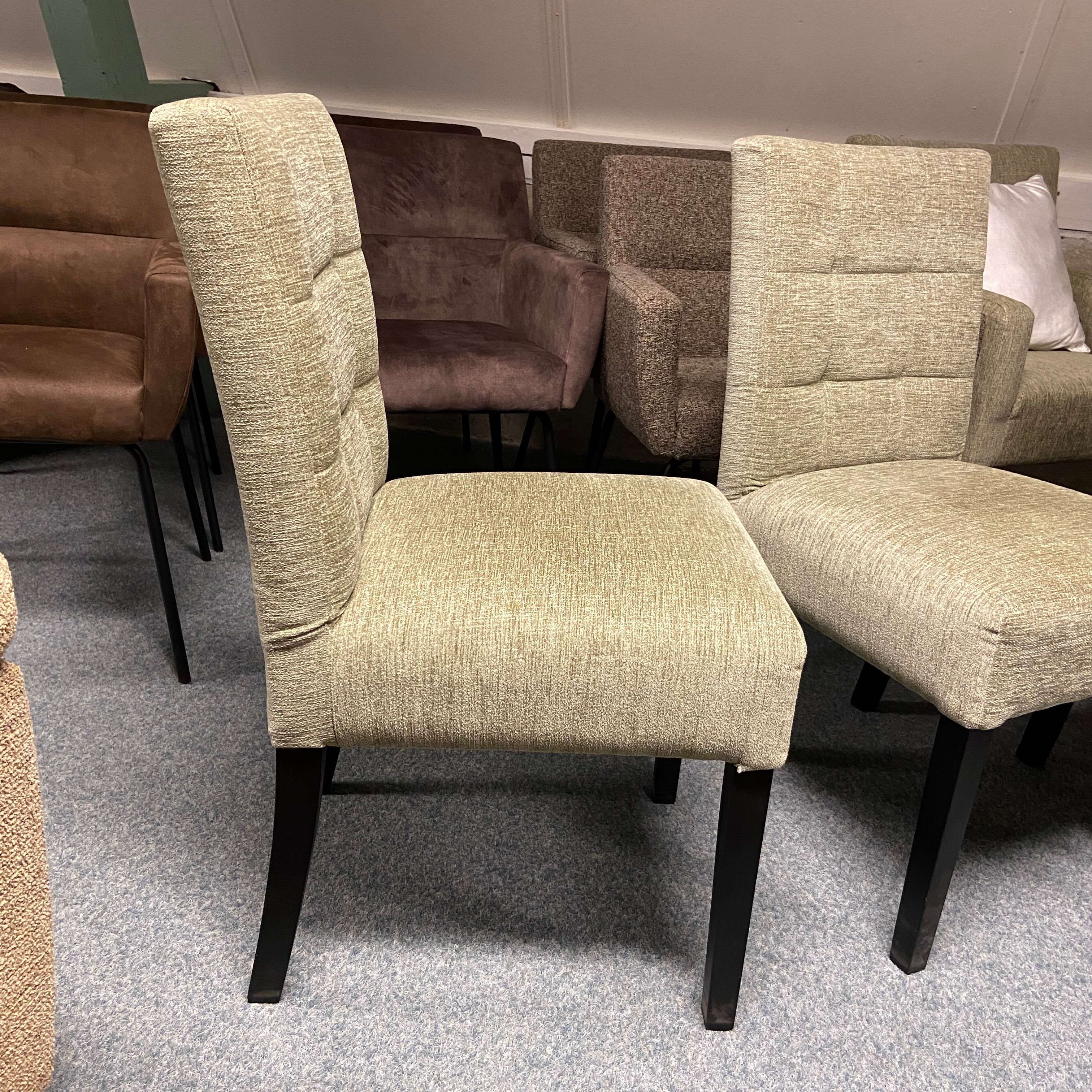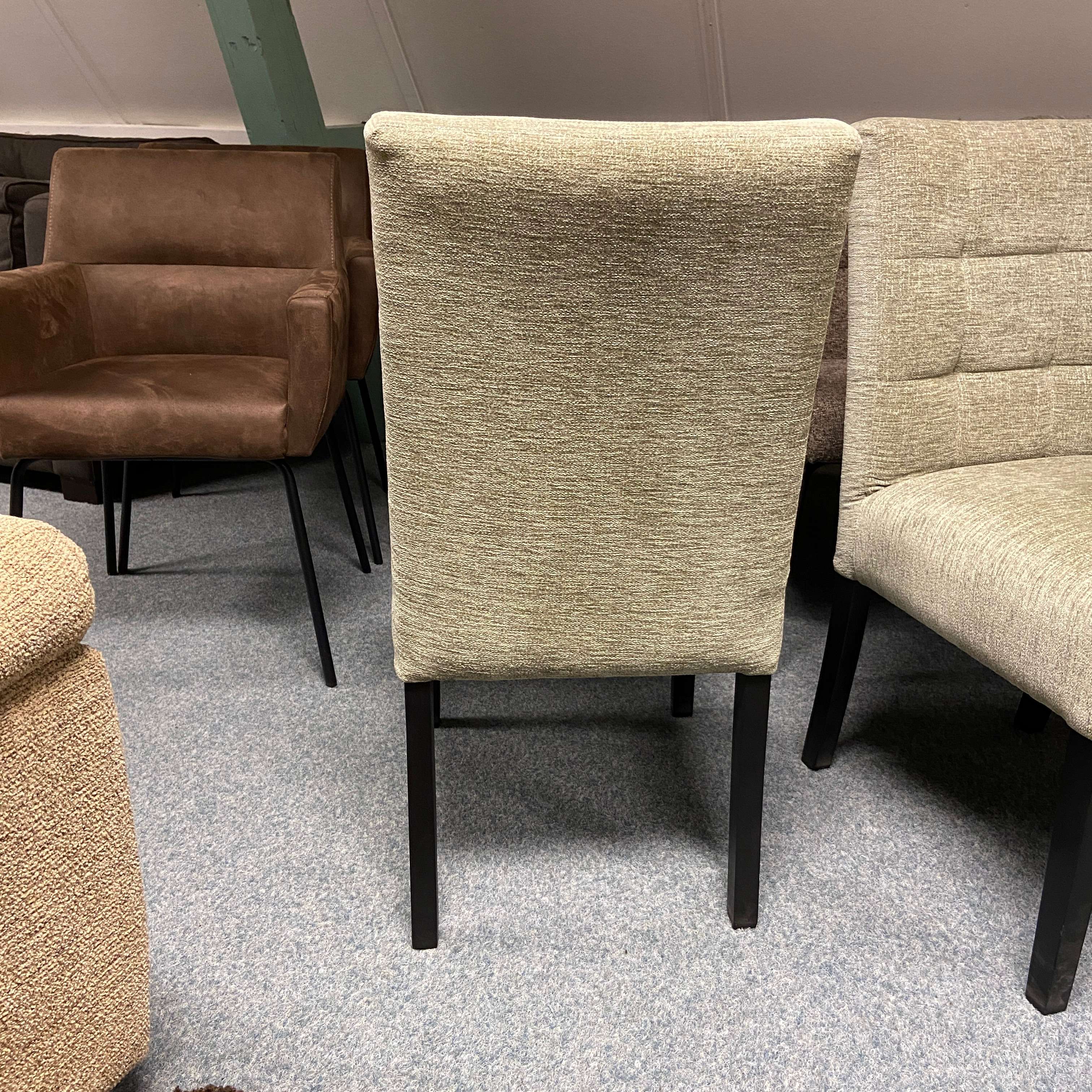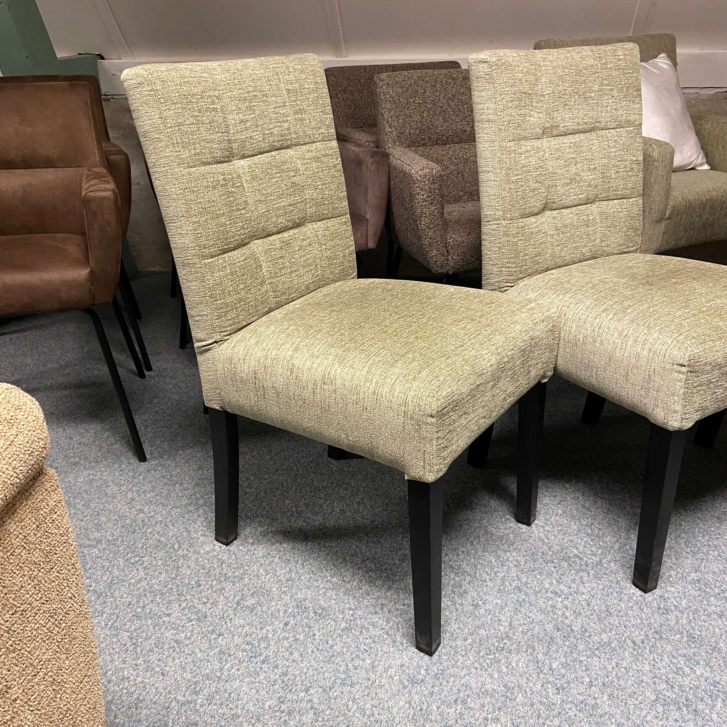 2 neutrale degelijke stoelen met mooie groengemeleerde stof. Bijpassend bij de 4 nancy armstoelen. Zwarte houten poot.