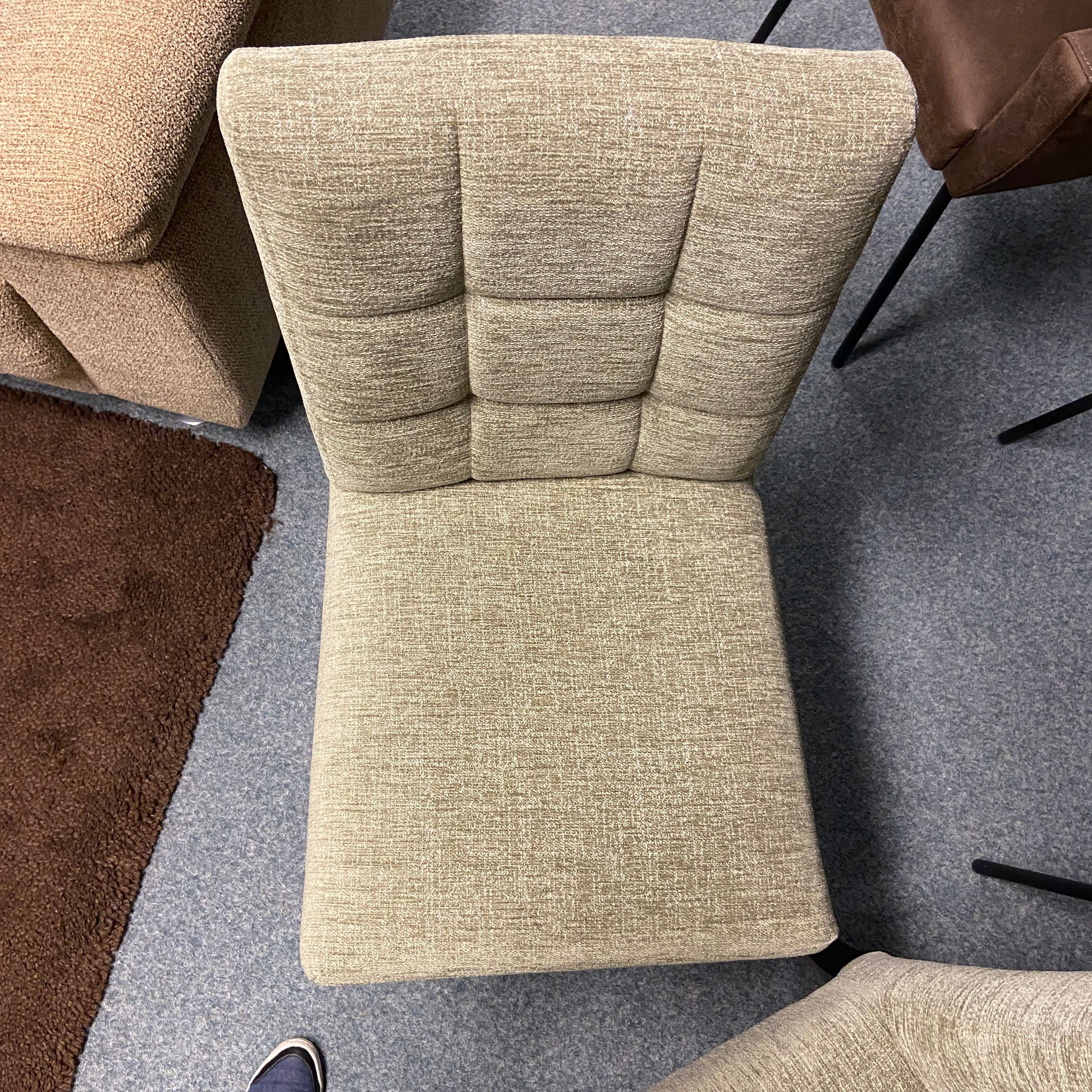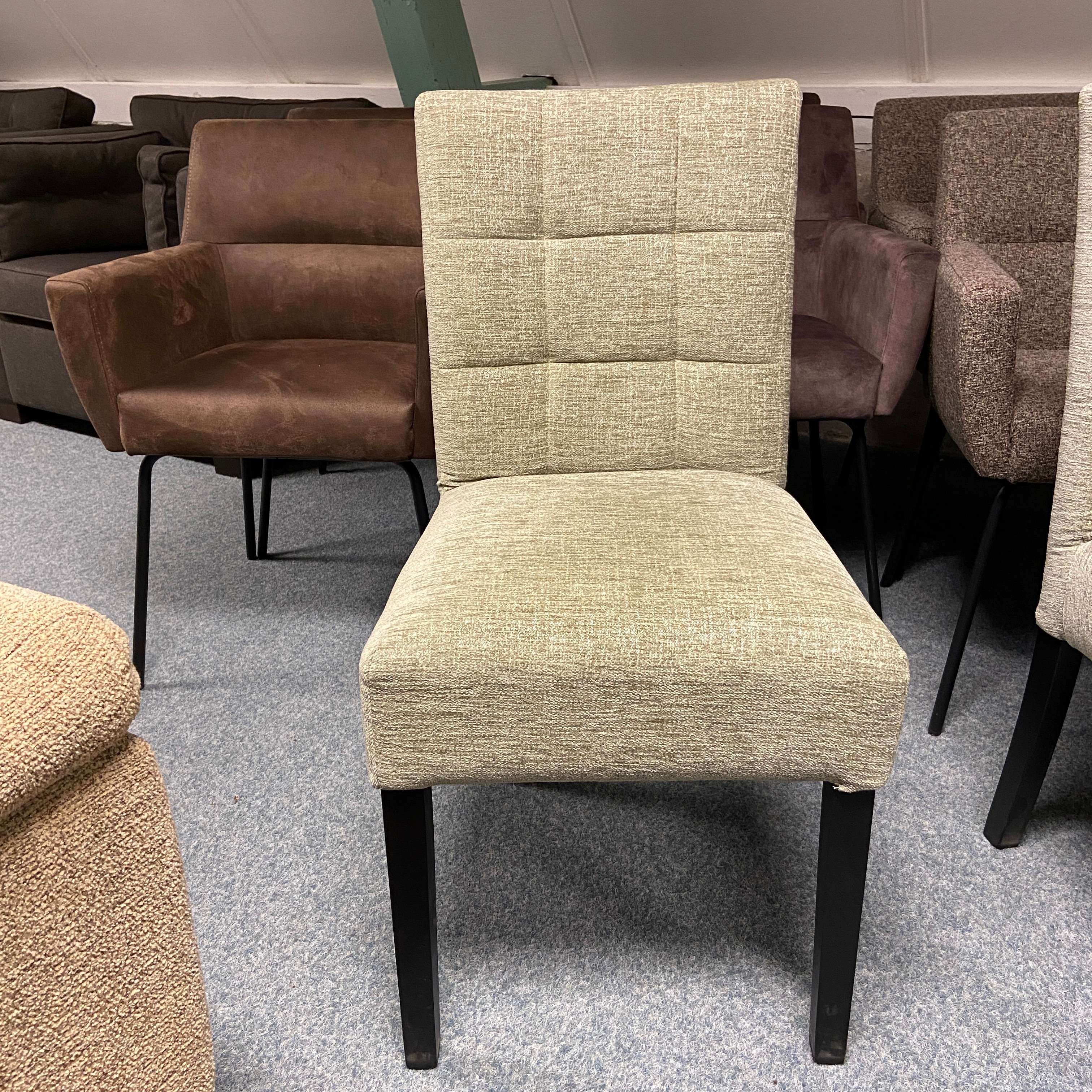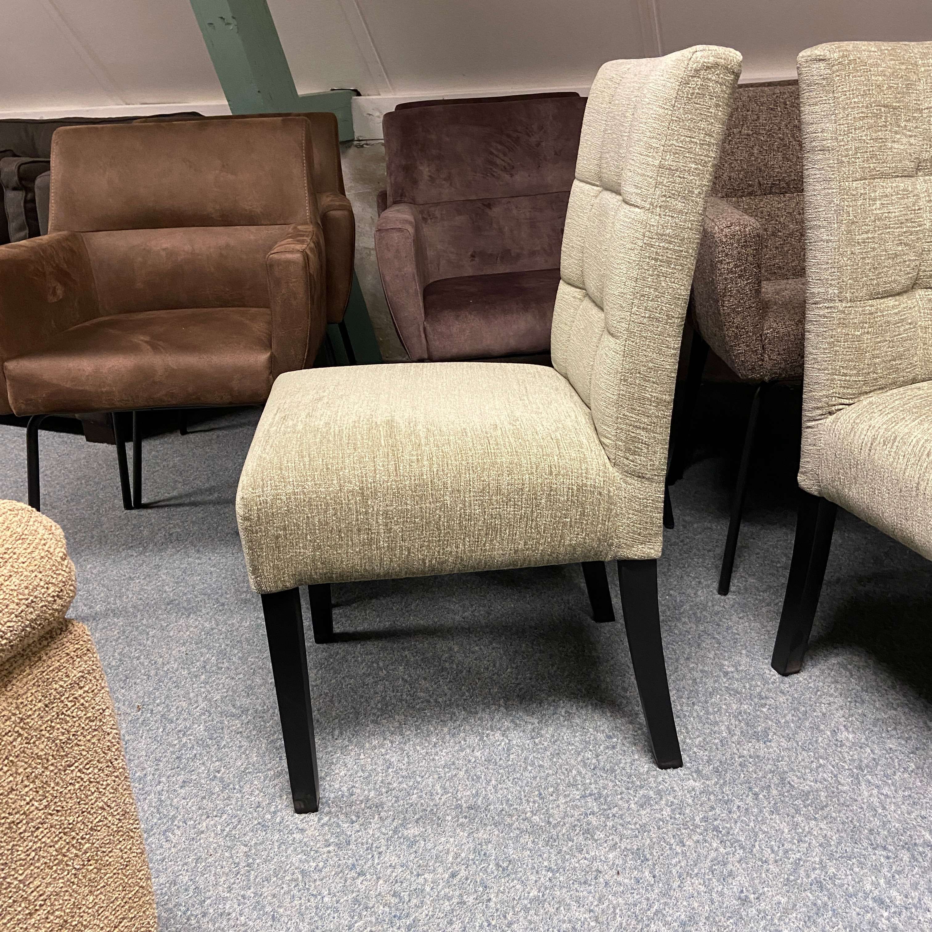 2 neutrale degelijke stoelen met mooie groengemeleerde stof. Bijpassend bij de 4 nancy armstoelen. Zwarte houten poot.