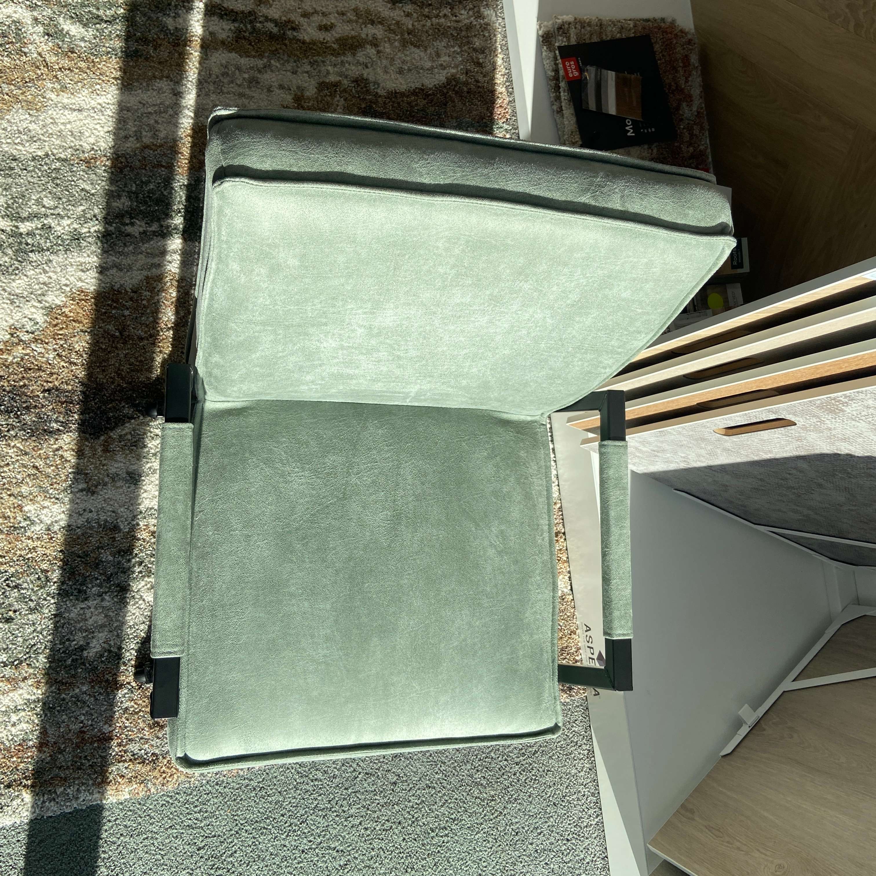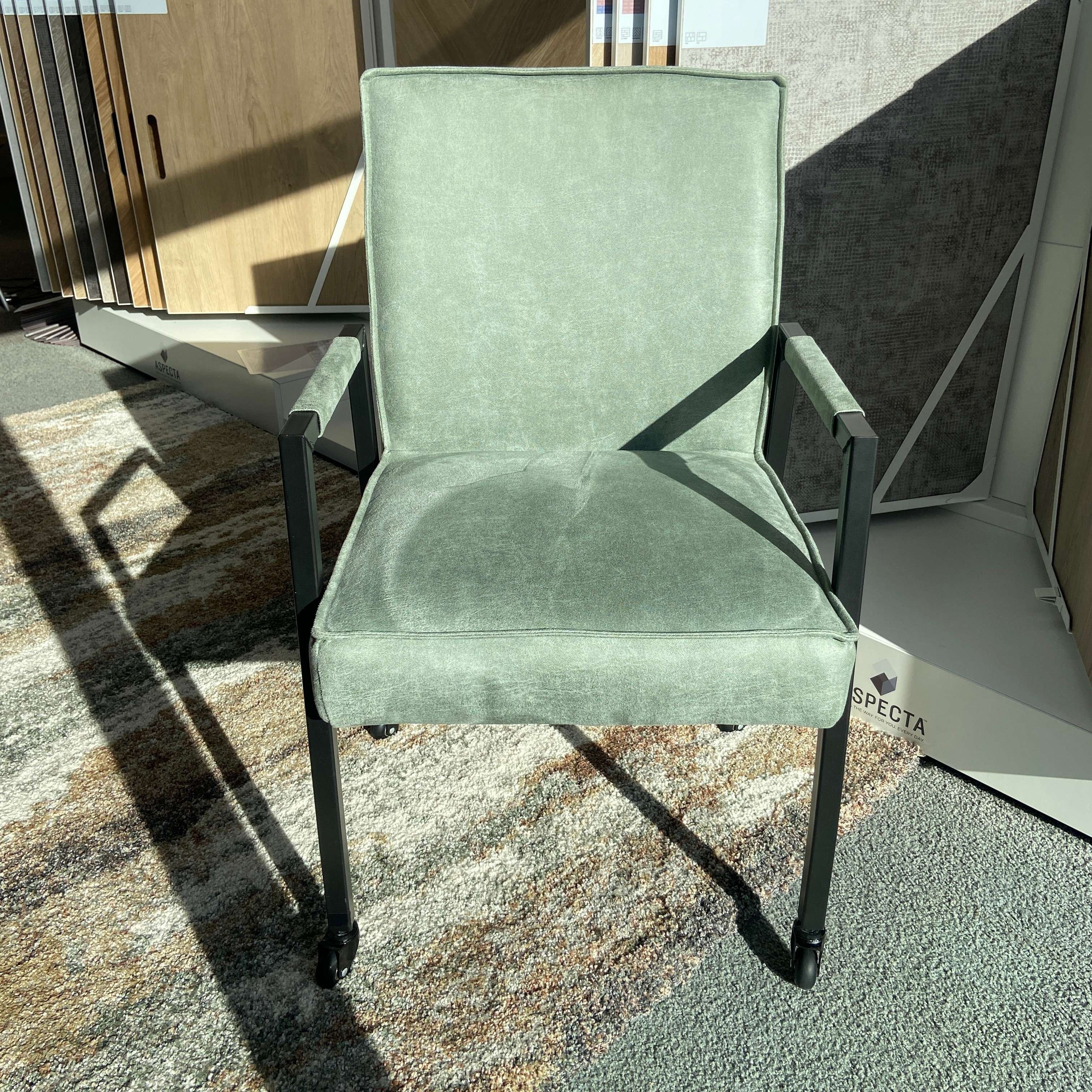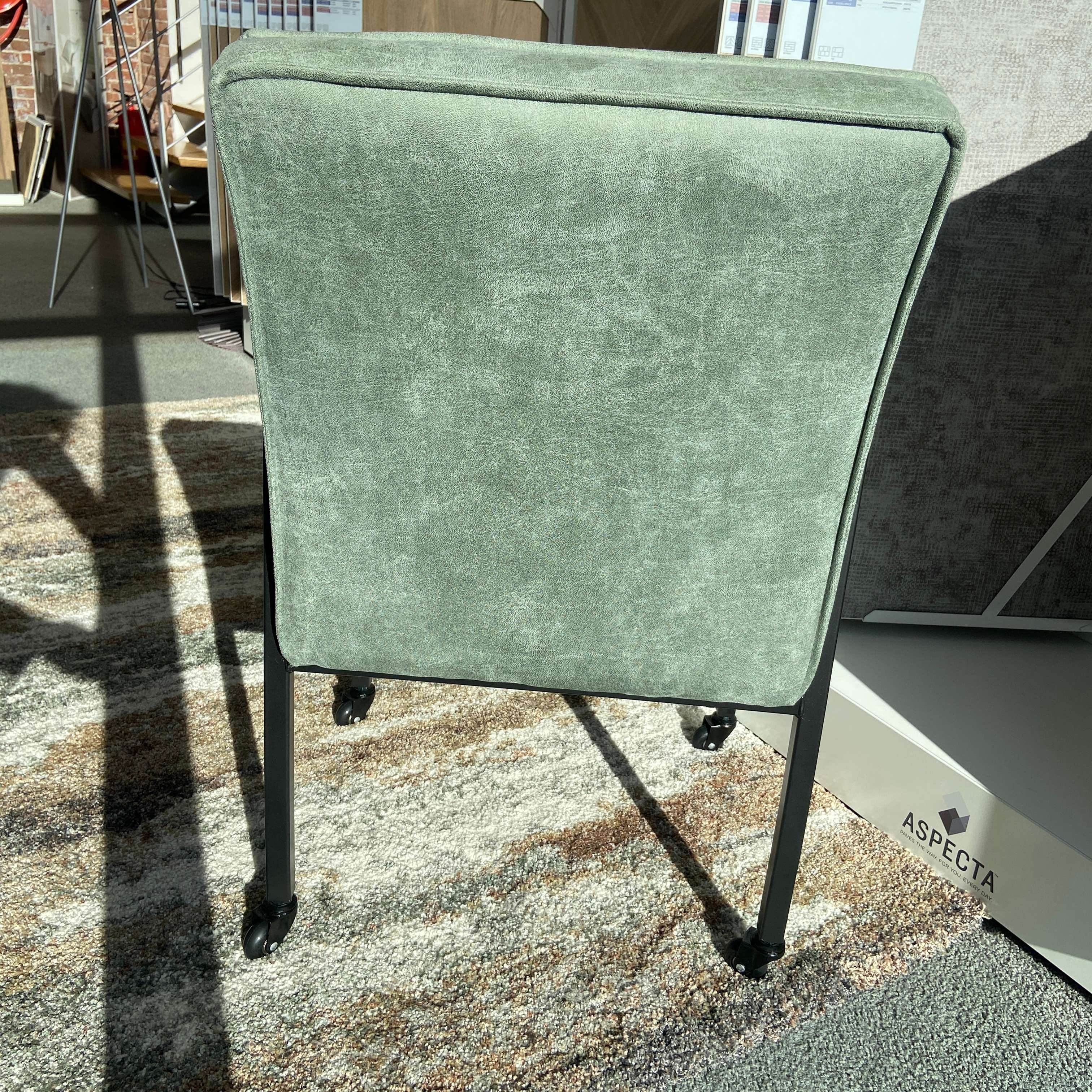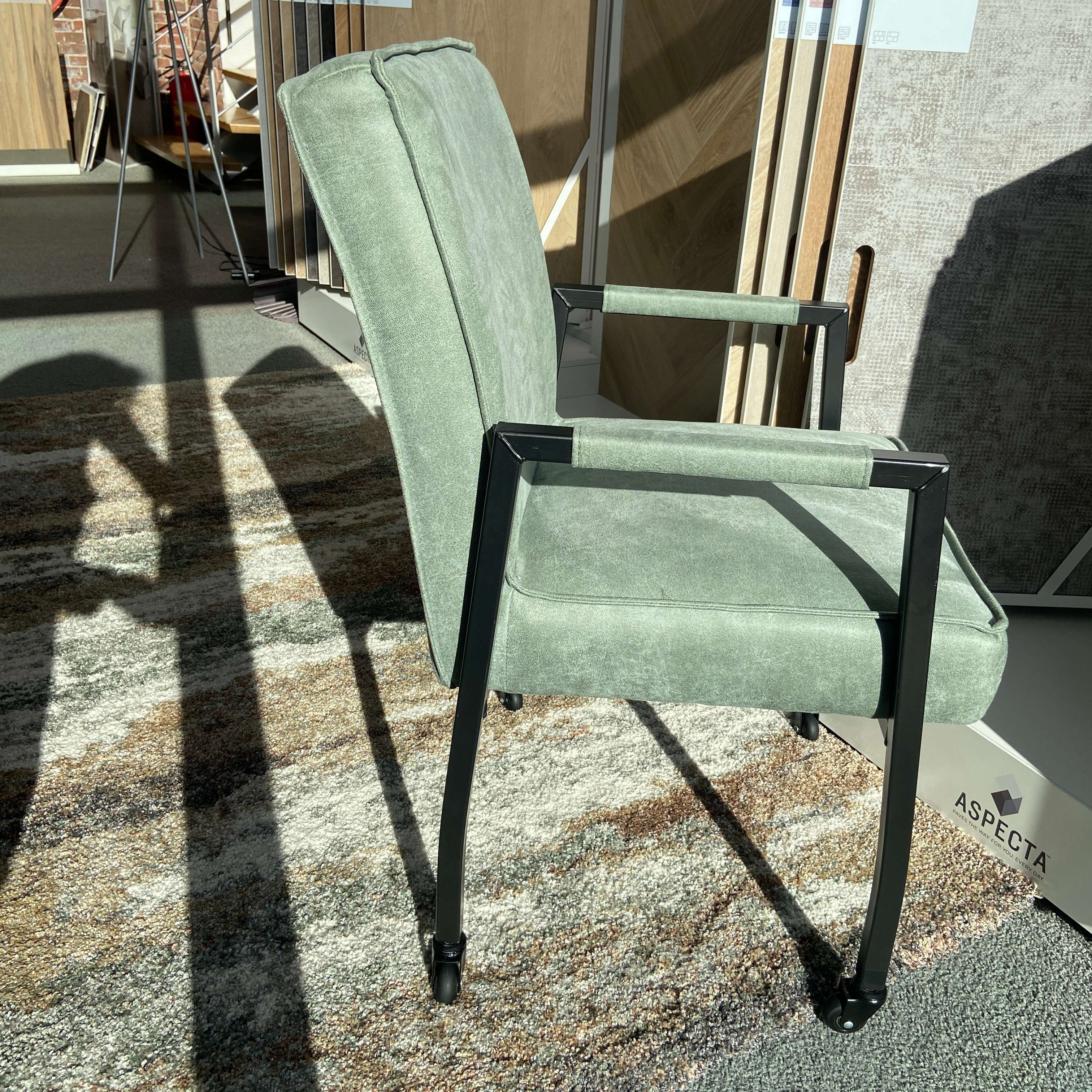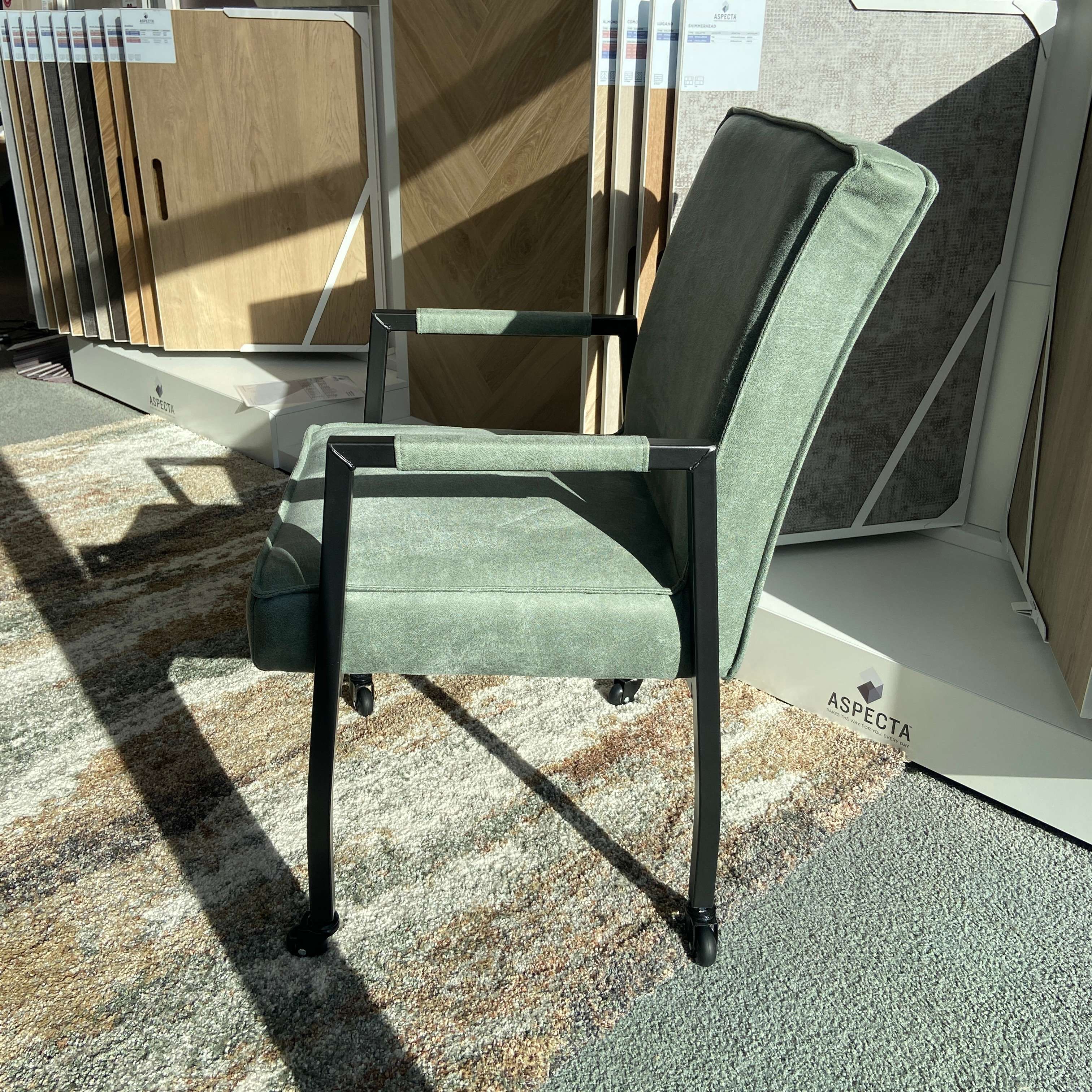 Stoere groenegrijze stoelen met zwart metaal op wieltjes. Past perferct bij een industriele stijl. Stof een microleder met bies.
